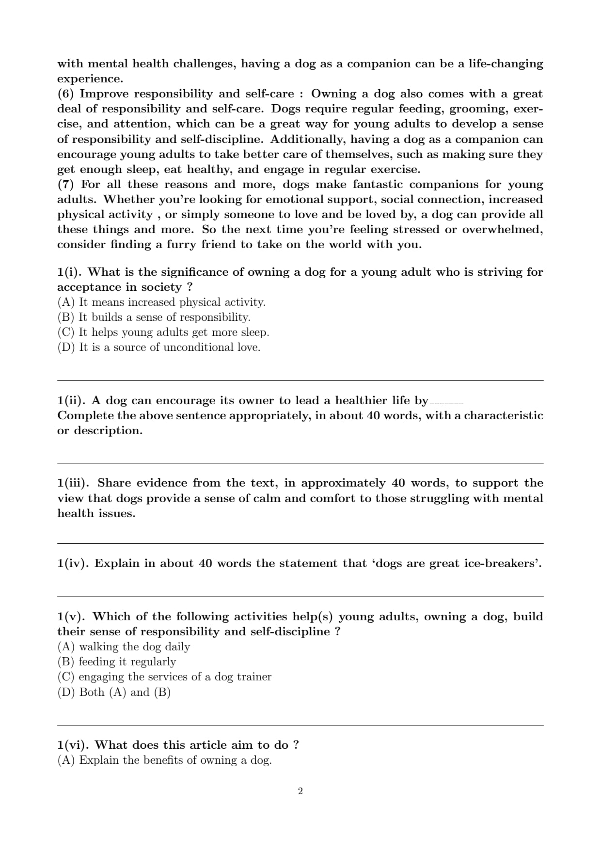 Paragraphs 4 and 6 highlight that dogs require regular exercise (walking, playing).