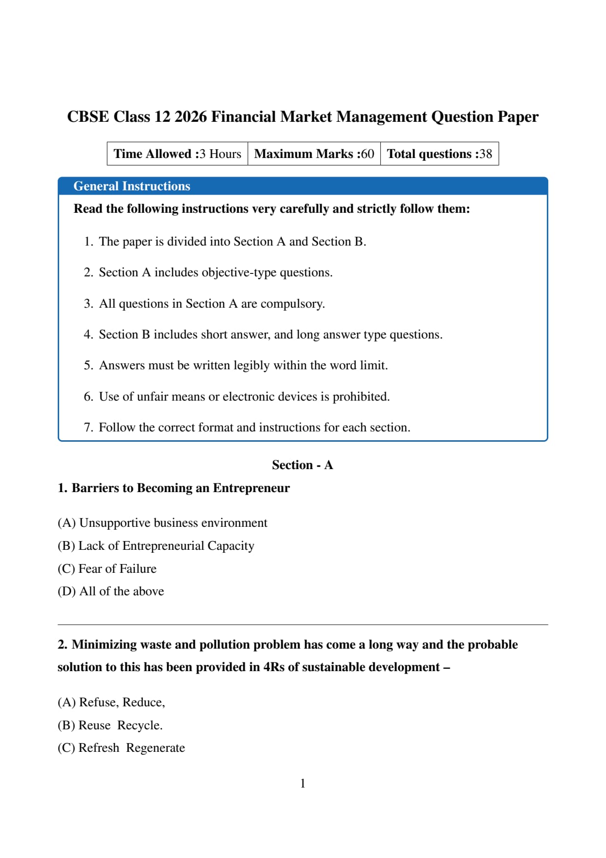 The CBSE Board conducted Class 12 Financial Market Management Exam on April 1, 2026. Class 12 Financial Market Management Question Paper with Solution PDF is available here for download.