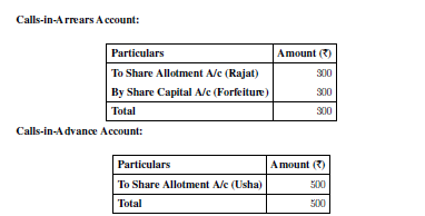 \[ Calls in Arrears Account Credited = Rs. 5,000. \] Quick Tip: Always remember that on forfeiture, the unpaid call money is credited to the Calls in Arrears Account to clear the outstanding balance for the forfeited shares.