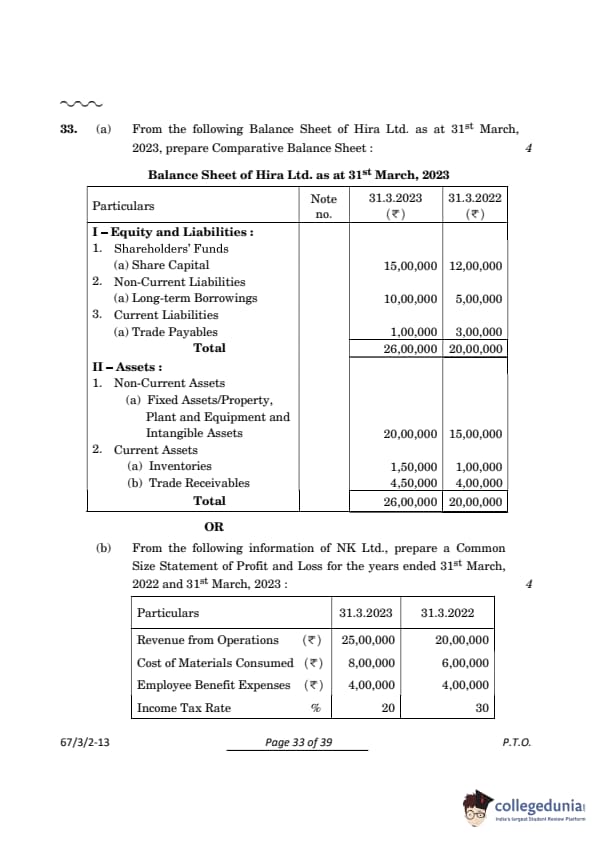 \hline \end{array} \] Quick Tip: To create a Comparative Balance Sheet, calculate the percentage change using: \[ % Change = \frac{Current Year - Previous Year}{Previous Year} \times 100 \]