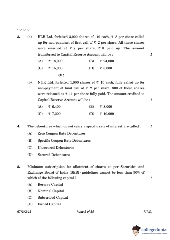 (a) KLB Ltd. forfeited 3,000 shares of Rs. 10 each, Rs. 8 per share called up for non-payment of the first call of Rs. 2 per share. All these shares were reissued at Rs. 7 per share, Rs. 8 paid up. The amount transferred to the Capital Reserve Account will be: