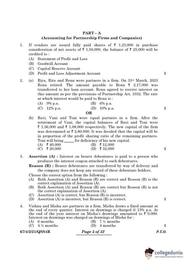 (a) Riya, Rita and Renu were partners in a firm. On 31st March, 2023 Renu retired. The amount payable to Renu Rs. 2,17,000 was transferred to her loan account. Renu agreed to receive interest on this amount as per the provisions of Partnership Act, 1932. The rate at which interest would be paid to Renu is: