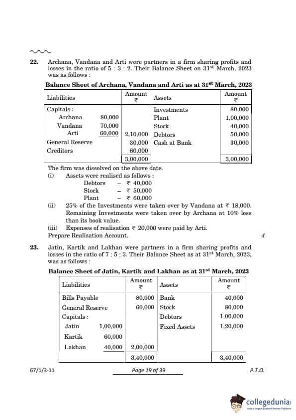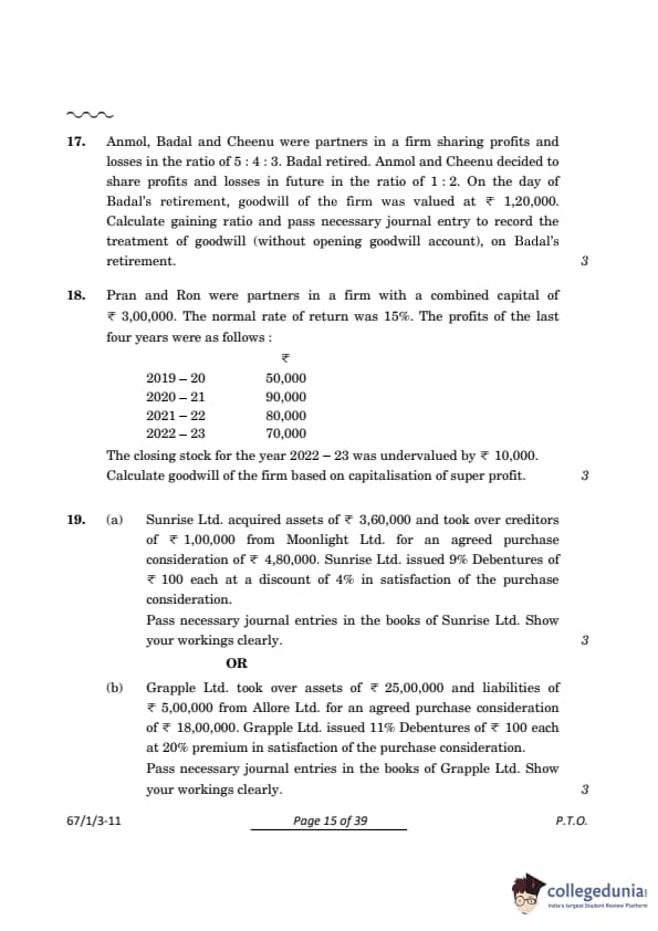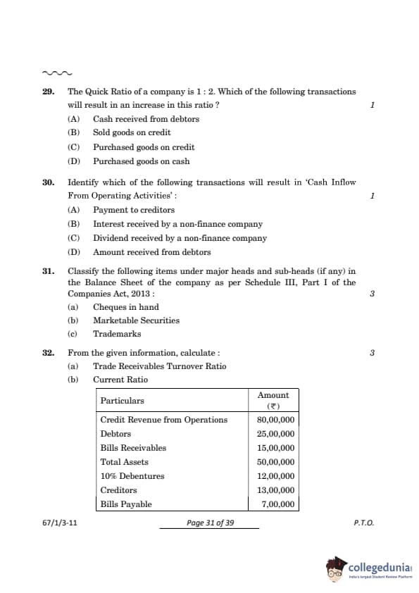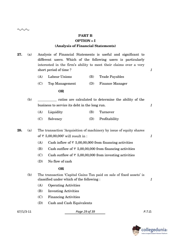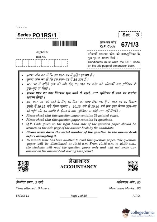 CBSE Class 12 Accountancy Set 3 Question Paper PDF (Code: 67/1/3) is now available for download. CBSE conducted the Class 12 Accountancy examination on March 23, 2024, from 10:30 AM to 1:30 PM. The question paper consists of 34 questions carrying a total of 80 marks. Part A is compulsory for all candidates. Part B has two options. Candidates have to attempt only one of the given options. Option I : Analysis of Financial Statements and Option II : Computerised Accounting. Candidates can use the link below to download the CBSE Class 12 Accountancy Set 3 Question Paper with detailed solutions.