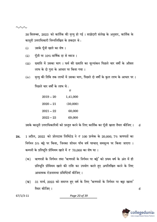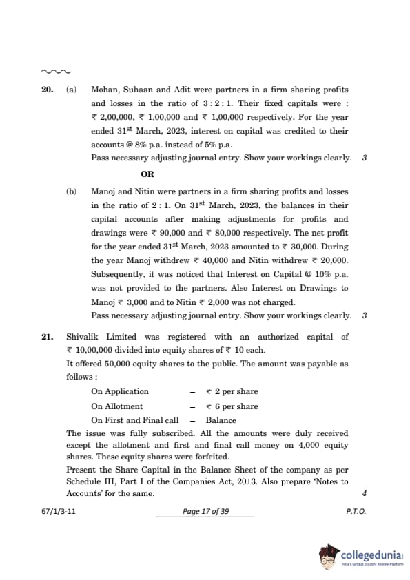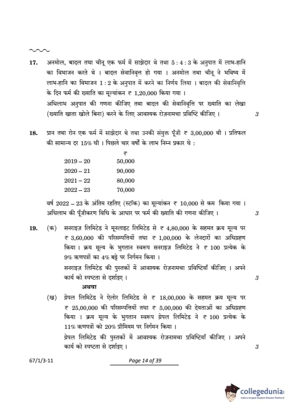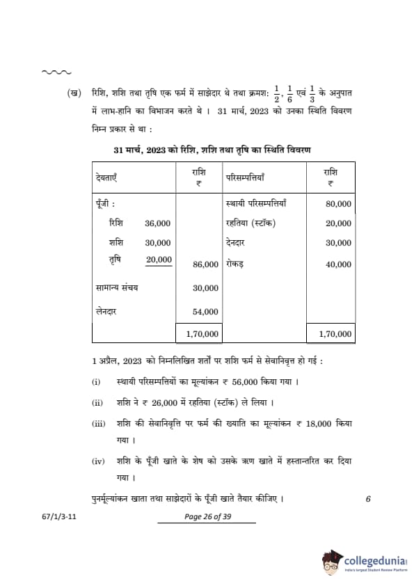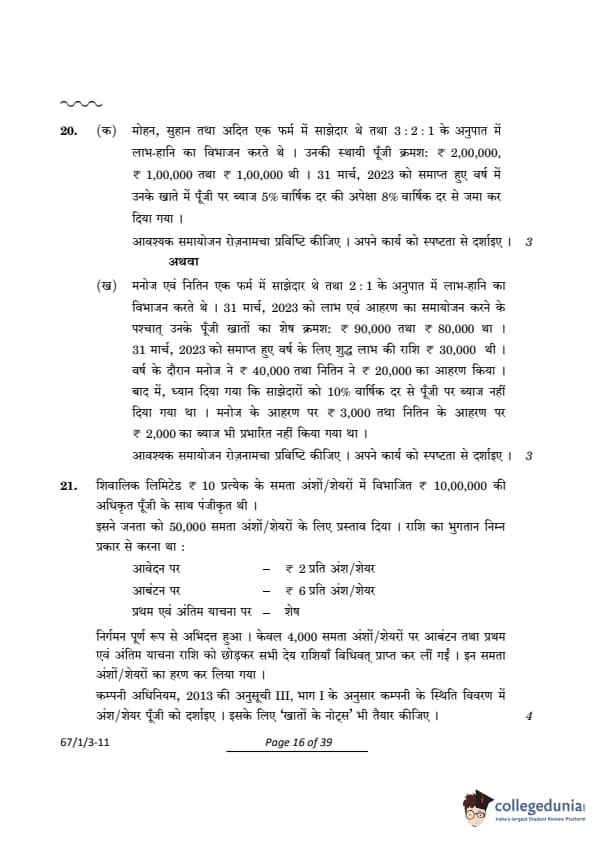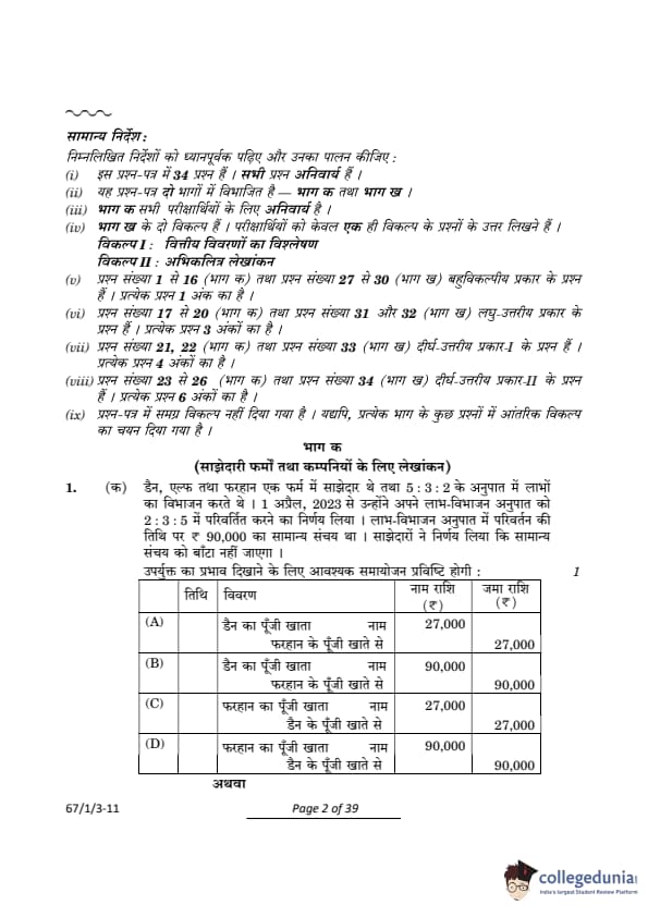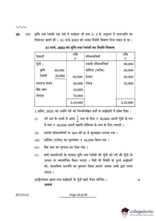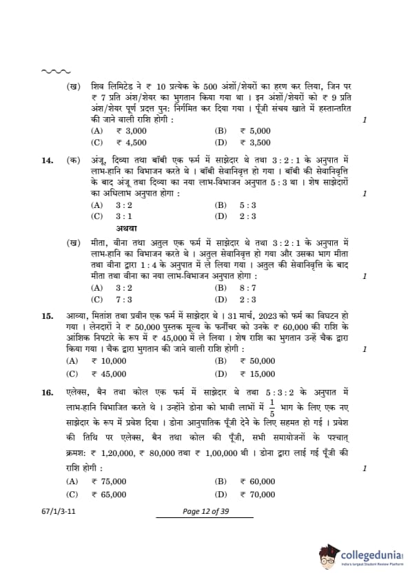 CBSE Class 12 Accountancy Question Paper 2024 (Set 3- 67/1/3) with Answer Key