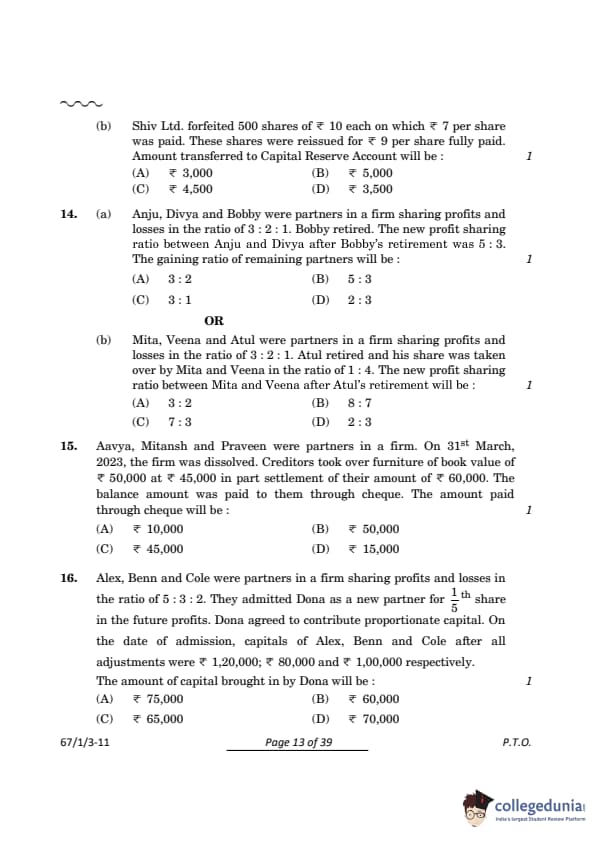 Step 2: Combine shares and simplify: \[ Rushil : Abheer : Sunil = \frac{26}{7} : \frac{20}{7} : \frac{3}{7} = 26 : 20 : 3 = 2 : 2 : 3. \] Quick Tip: Ensure the shares transferred match the agreed new partner contribution.
