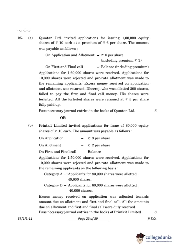 The company invited applications for 50,000 equity shares, but applications were received for 2,50,000 shares. Hence, the pro-rata allotment ratio is: \[ Pro-rata ratio = \frac{Shares Allotted}{Shares Applied} = \frac{50,000}{2,50,000} = \frac{1}{5}. \]