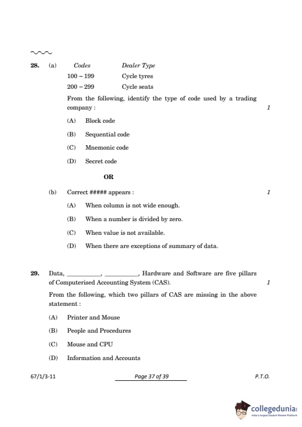 The missing pillars in the statement are People and Procedures, both of which are essential for the smooth functioning of CAS. Quick Tip: The five pillars of CAS—Data, People, Procedures, Hardware, and Software—together ensure seamless accounting operations and support informed decision-making.