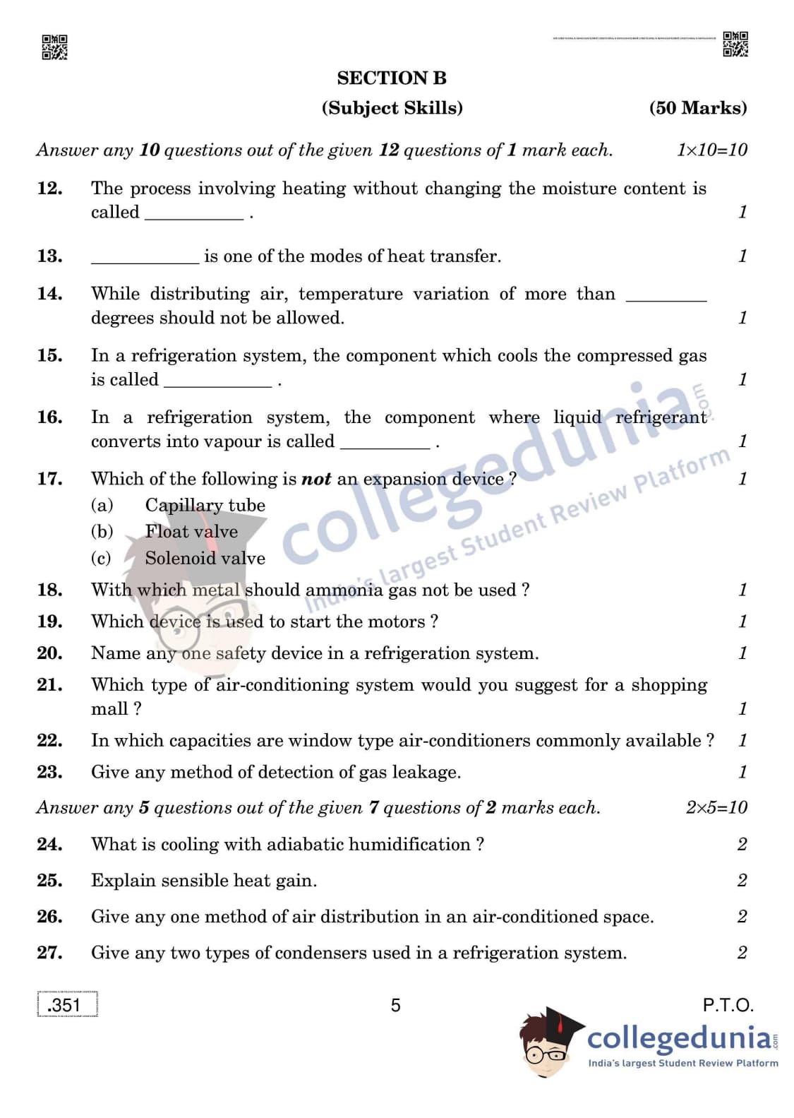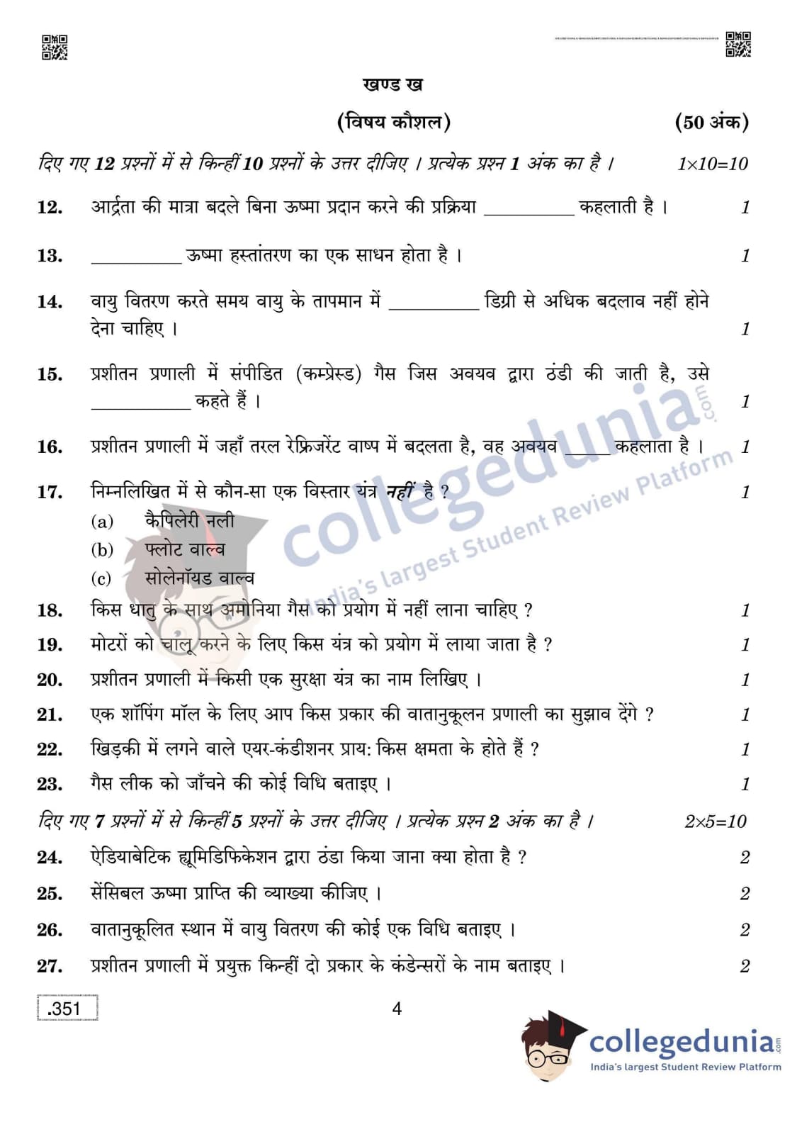 CBSE Class 12 Air Conditioning And Refrigeration Question Paper 2020 with Answer Key Set 4 is available for download. The exam was conducted by the Central Board of Secondary Education on February 28, 2020 in the Morning Session 10:30 AM to 1:30 PM. The medium of paper was English & Hindi. In terms of difficulty level, CBSE Class 12 Air Conditioning And Refrigeration paper was of Easy to Moderate level. The question paper comprised a total of 42 questions divided among 2 sections.