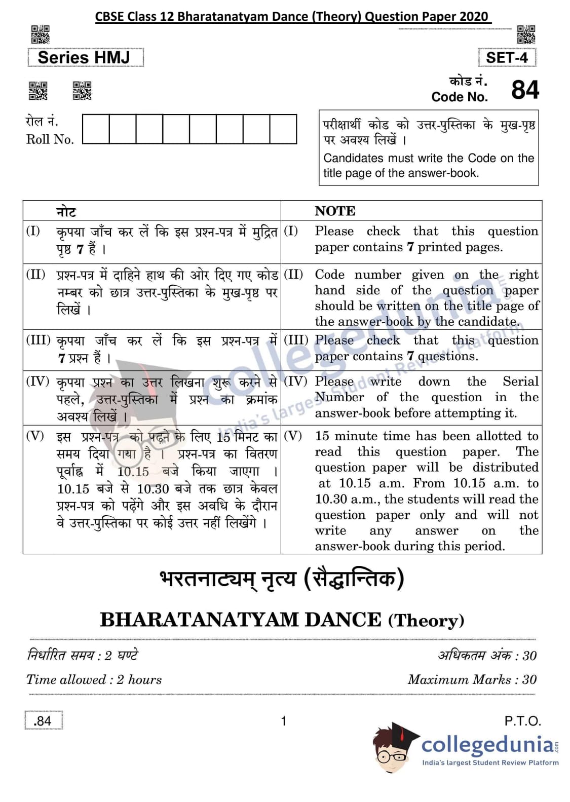 CBSE Class 12 Bharatanatyam Dance (Theory) Question Paper 2020 with Answer Key Set 4 is available for download. The exam was conducted by the Central Board of Secondary Education in the Morning Session 10:30 AM to 12:30 PM. The medium of paper was English & Hindi. The question paper comprised a total of 7 questions.
