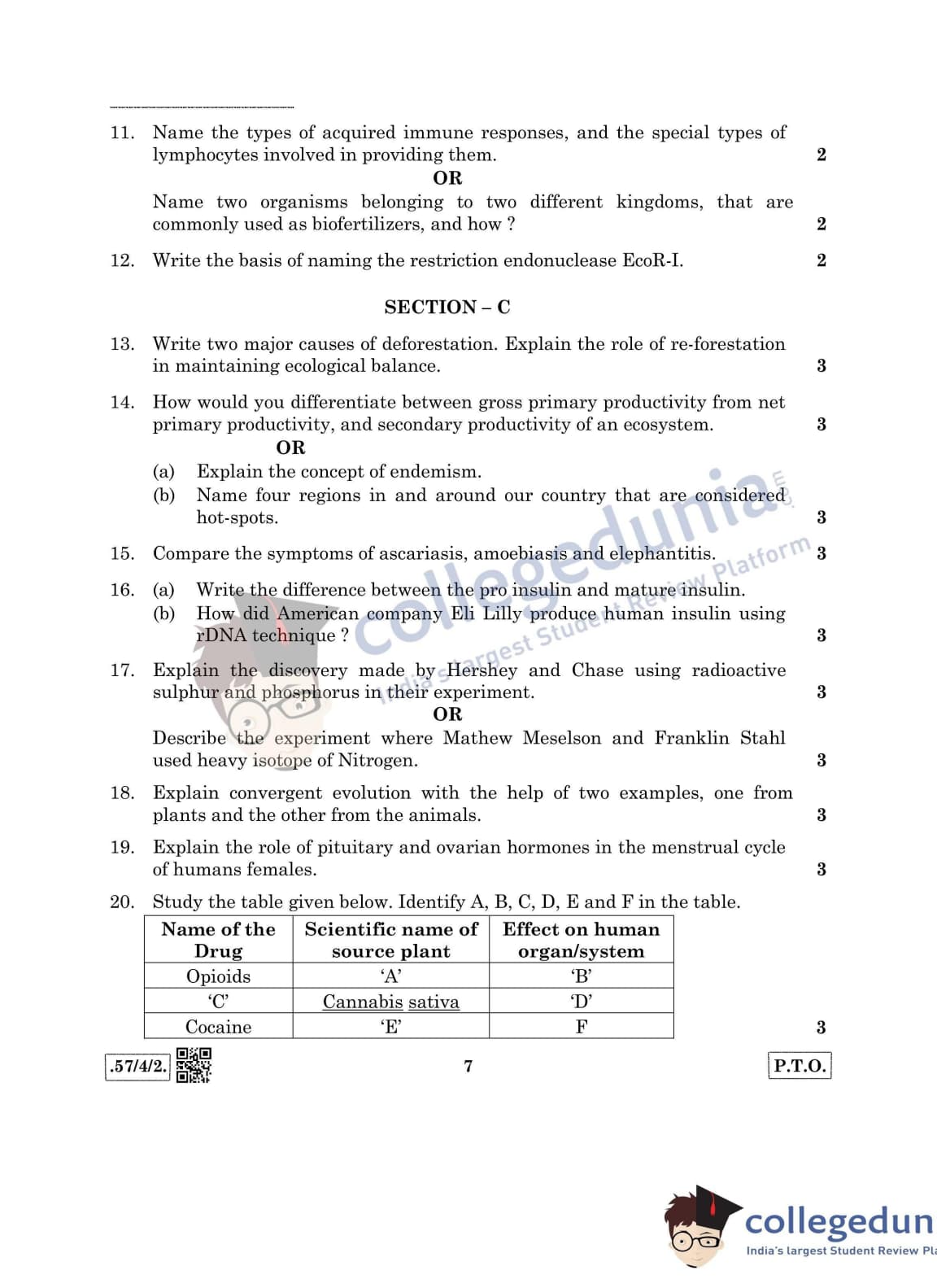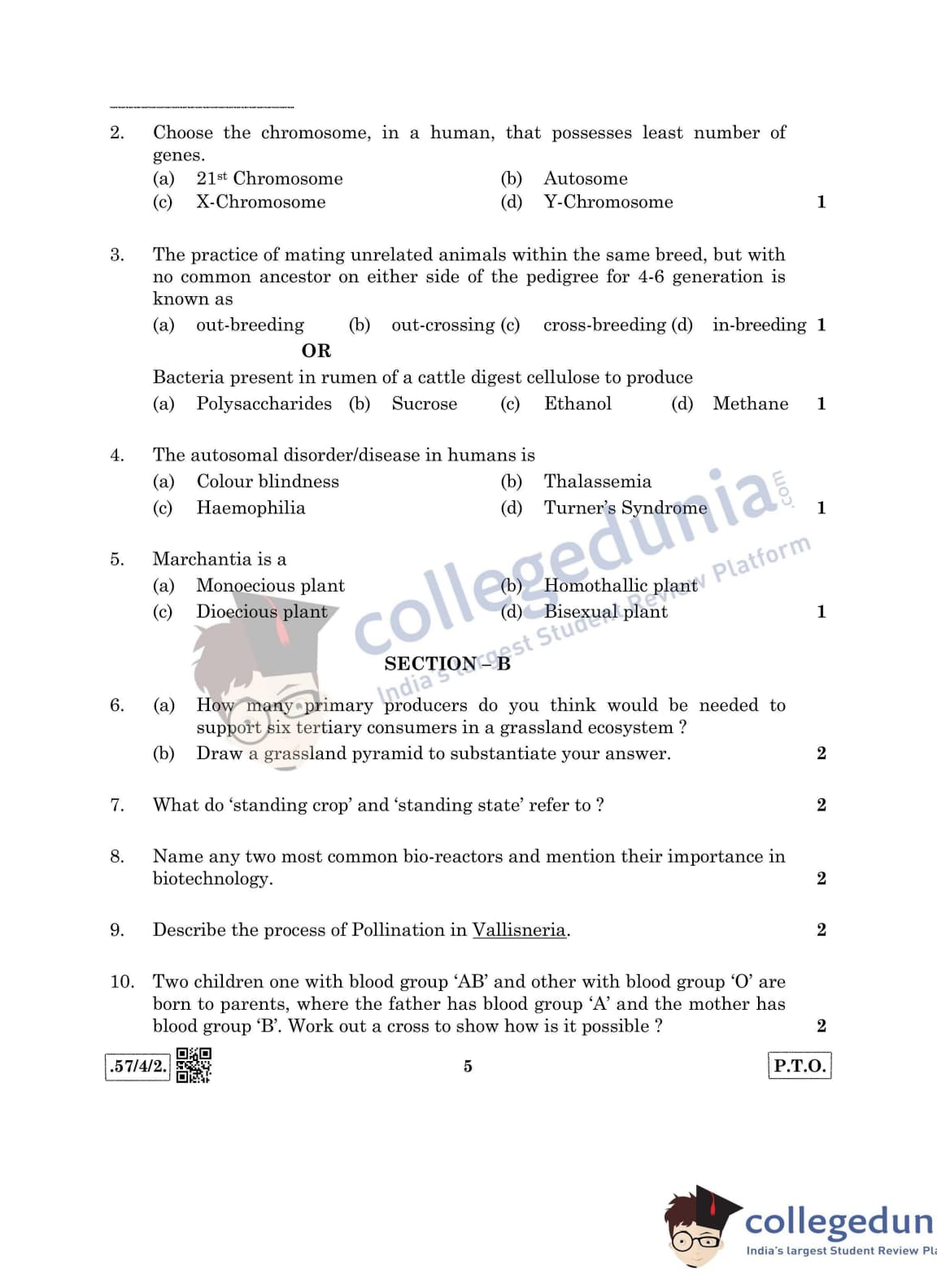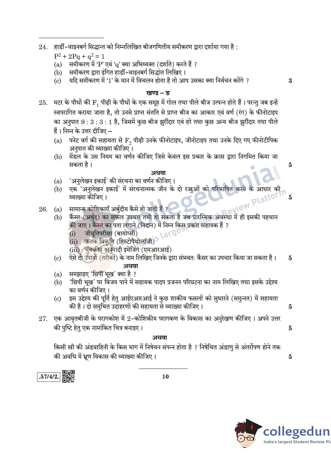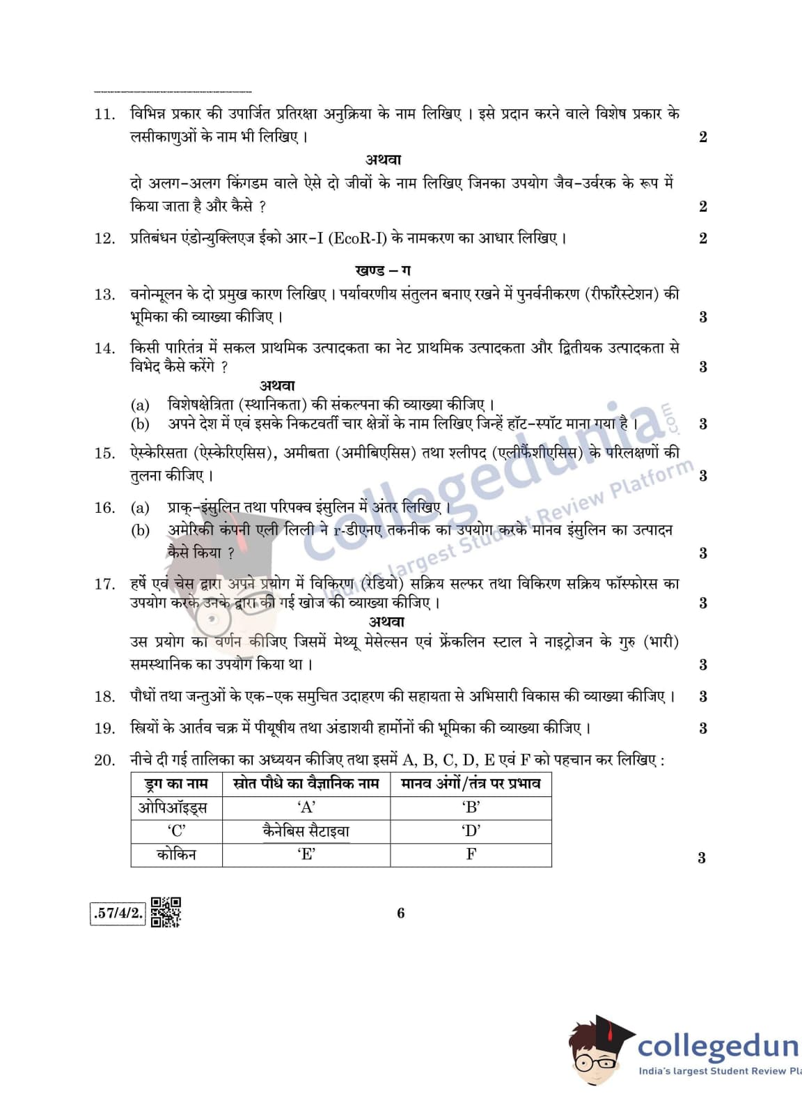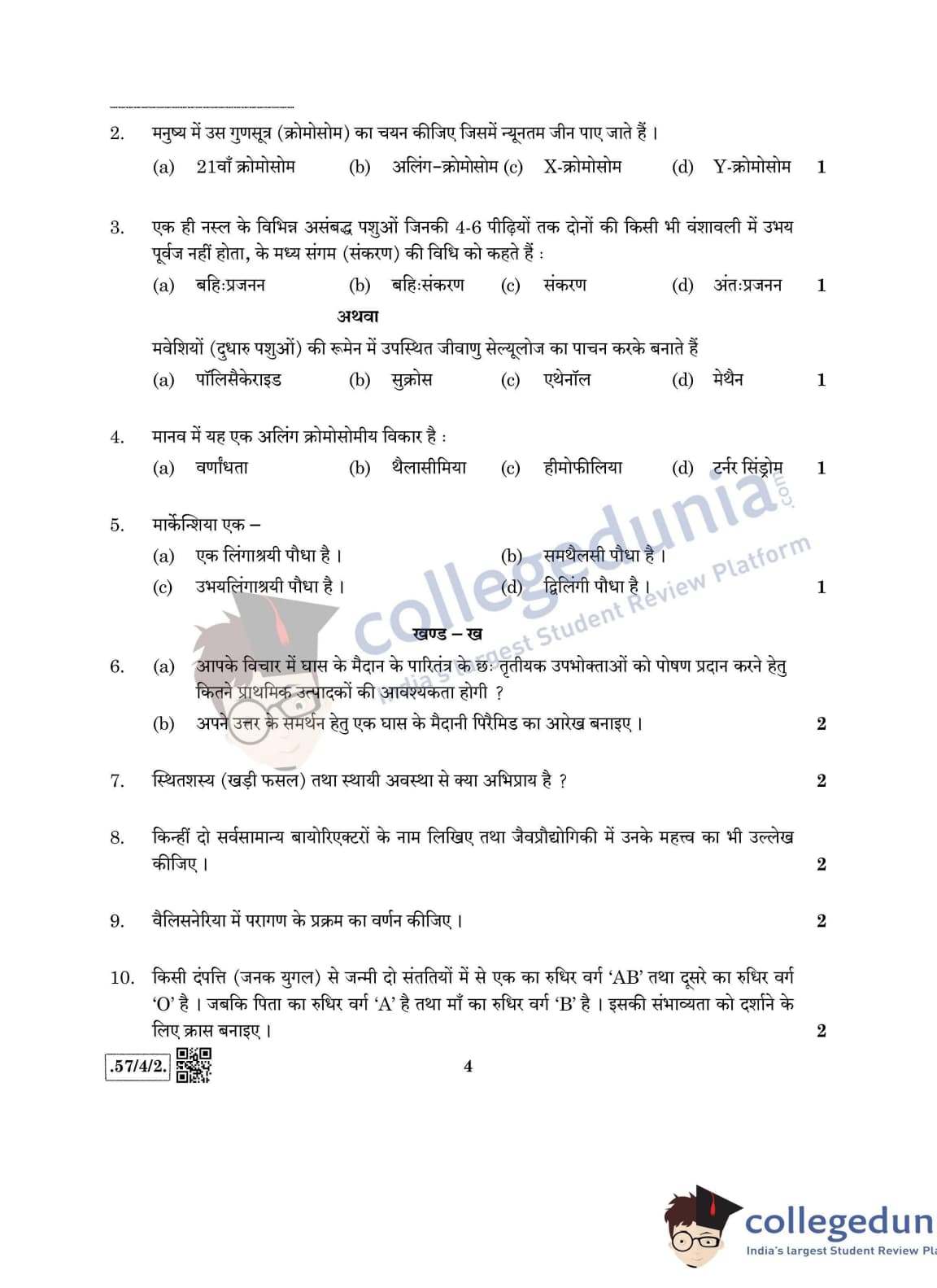 CBSE Class 12 Biology Question Paper 2020 with Answer Key Set 2- 57/4/2 is available for download. The exam was conducted by the Central Board of Secondary Education on March 14, 2020 in the Morning Session 10:30 AM to 1:30 PM. The medium of paper was English & Hindi. In terms of difficulty level, CBSE Class 12 Biology paper was of Moderate level. The question paper comprised a total of 27 questions divided among 5 sections.