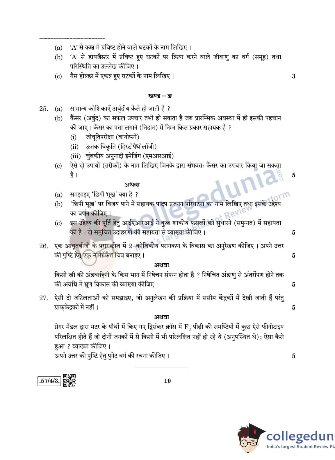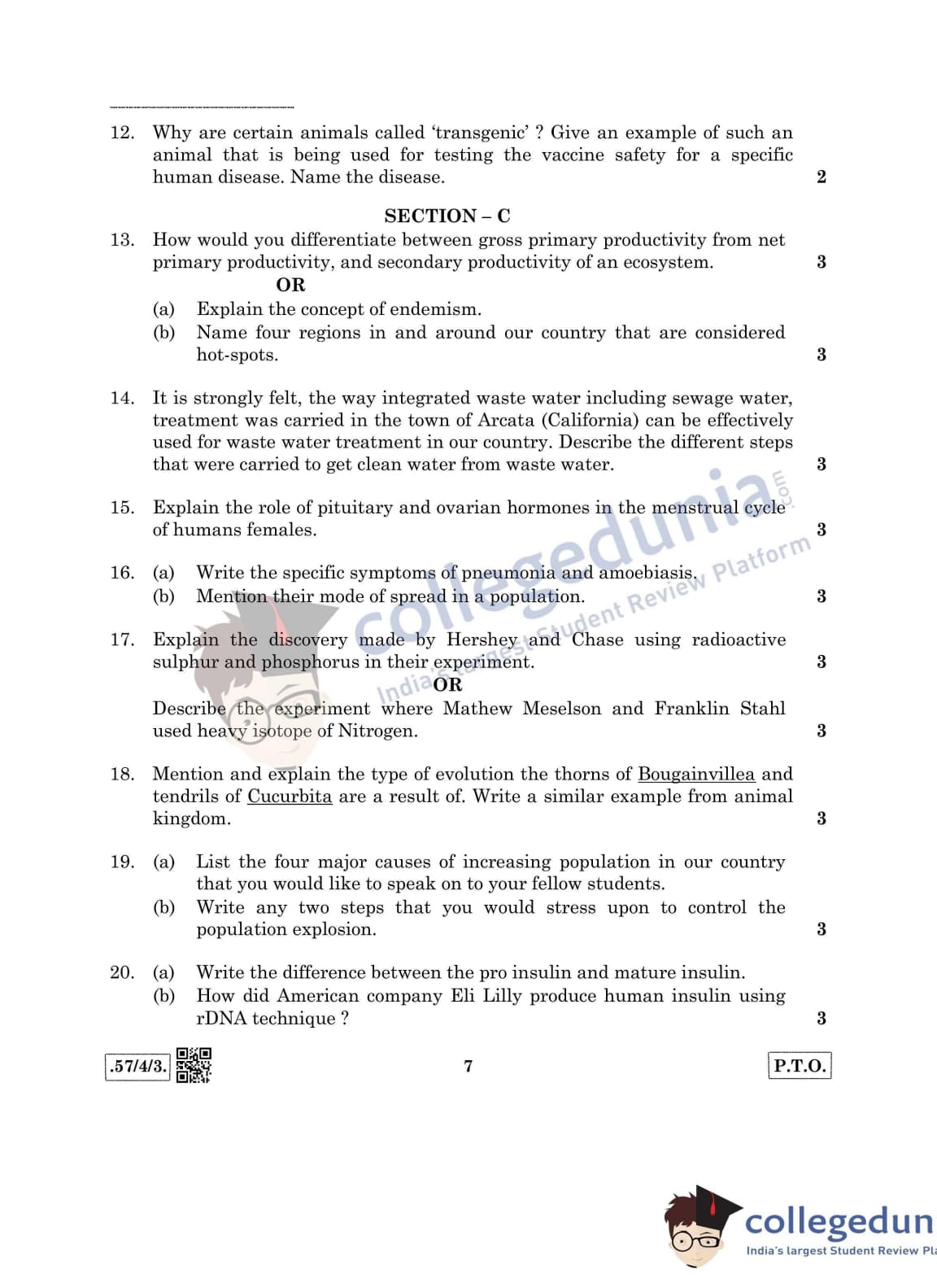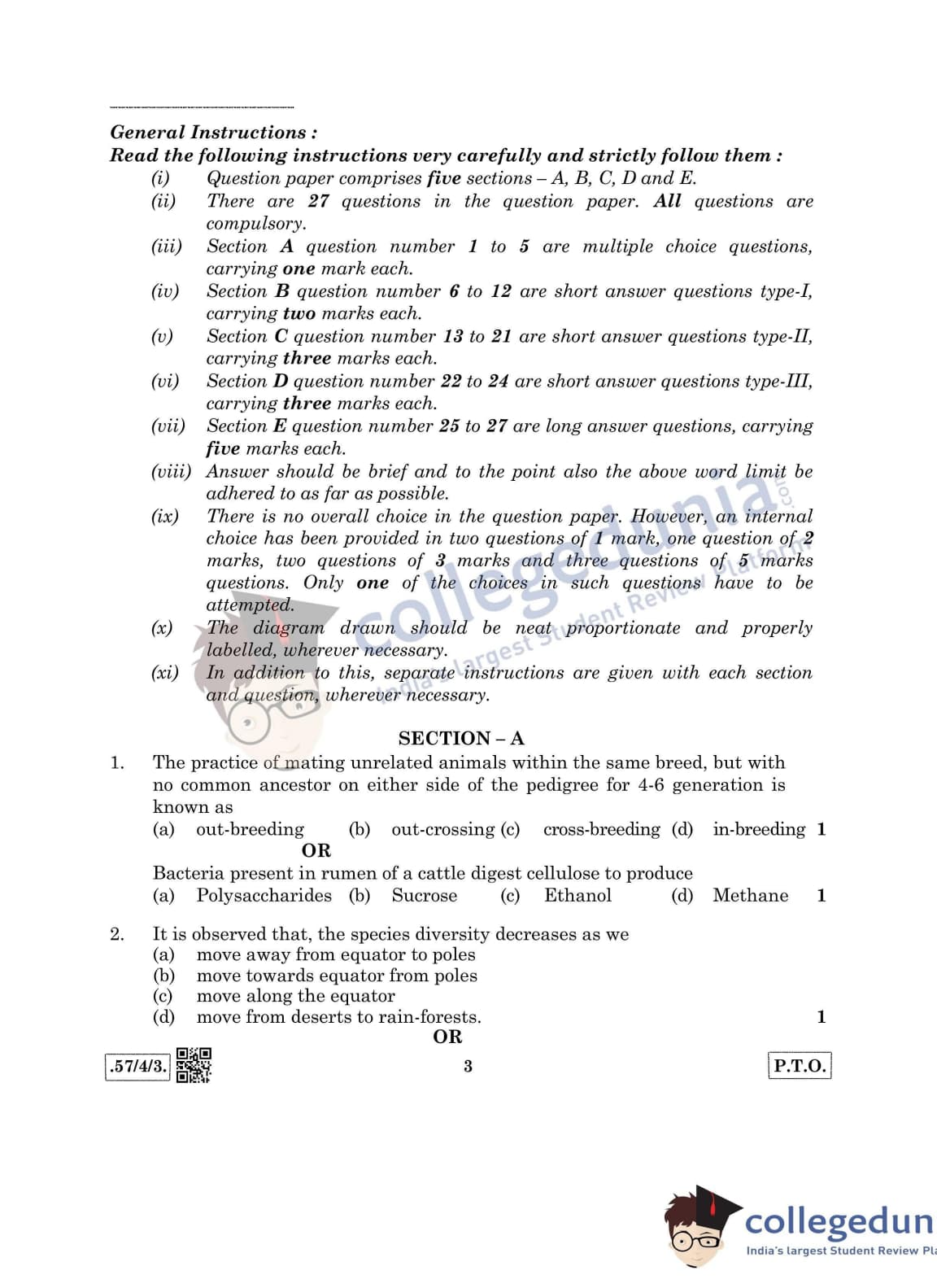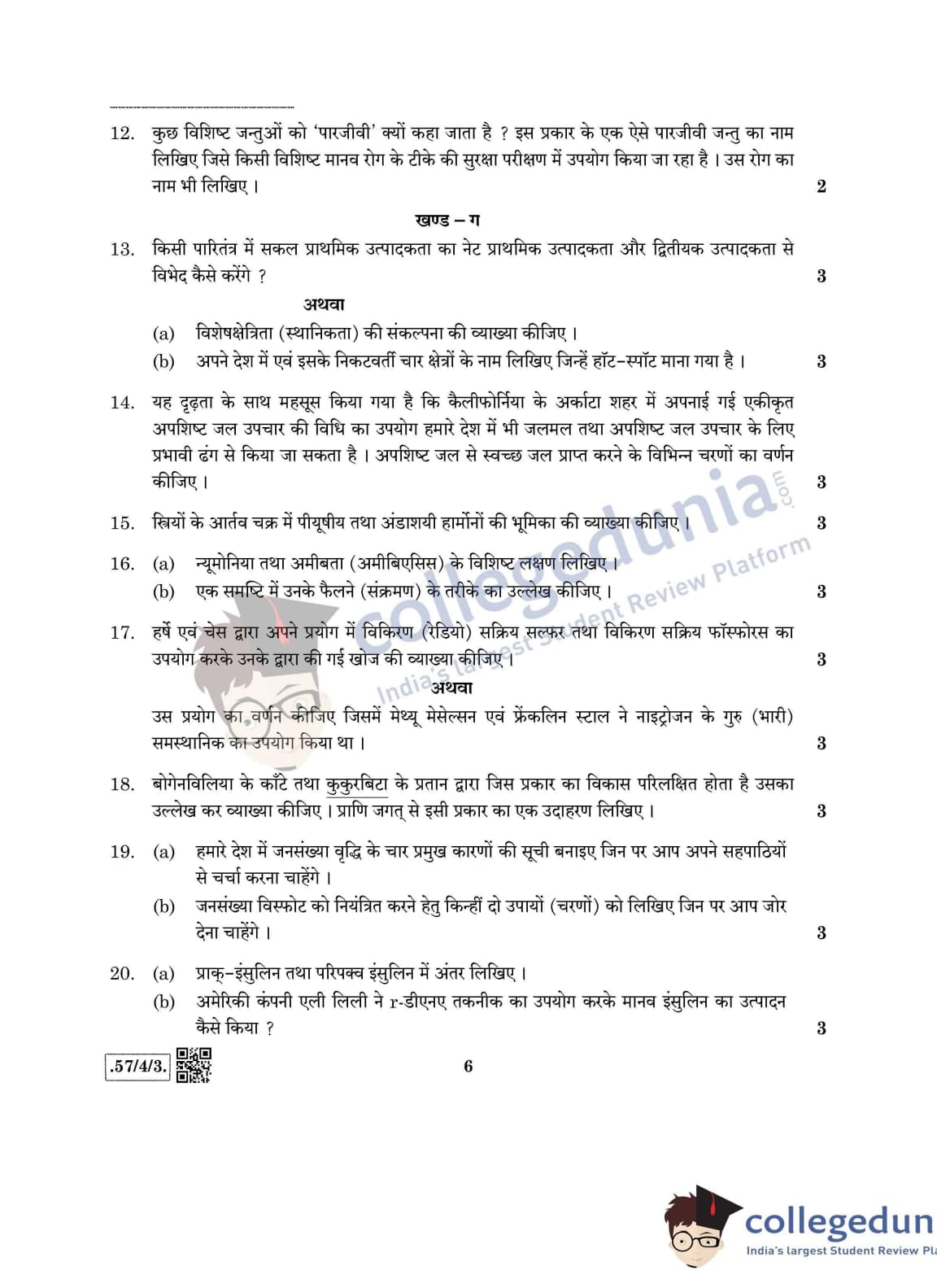 CBSE Class 12 Biology Question Paper 2020 with Answer Key Set 3- 57/4/3 is available for download. The exam was conducted by the Central Board of Secondary Education on March 14, 2020 in the Morning Session 10:30 AM to 1:30 PM. The medium of paper was English & Hindi. In terms of difficulty level, CBSE Class 12 Biology paper was of Moderate level. The question paper comprised a total of 27 questions divided among 5 sections.