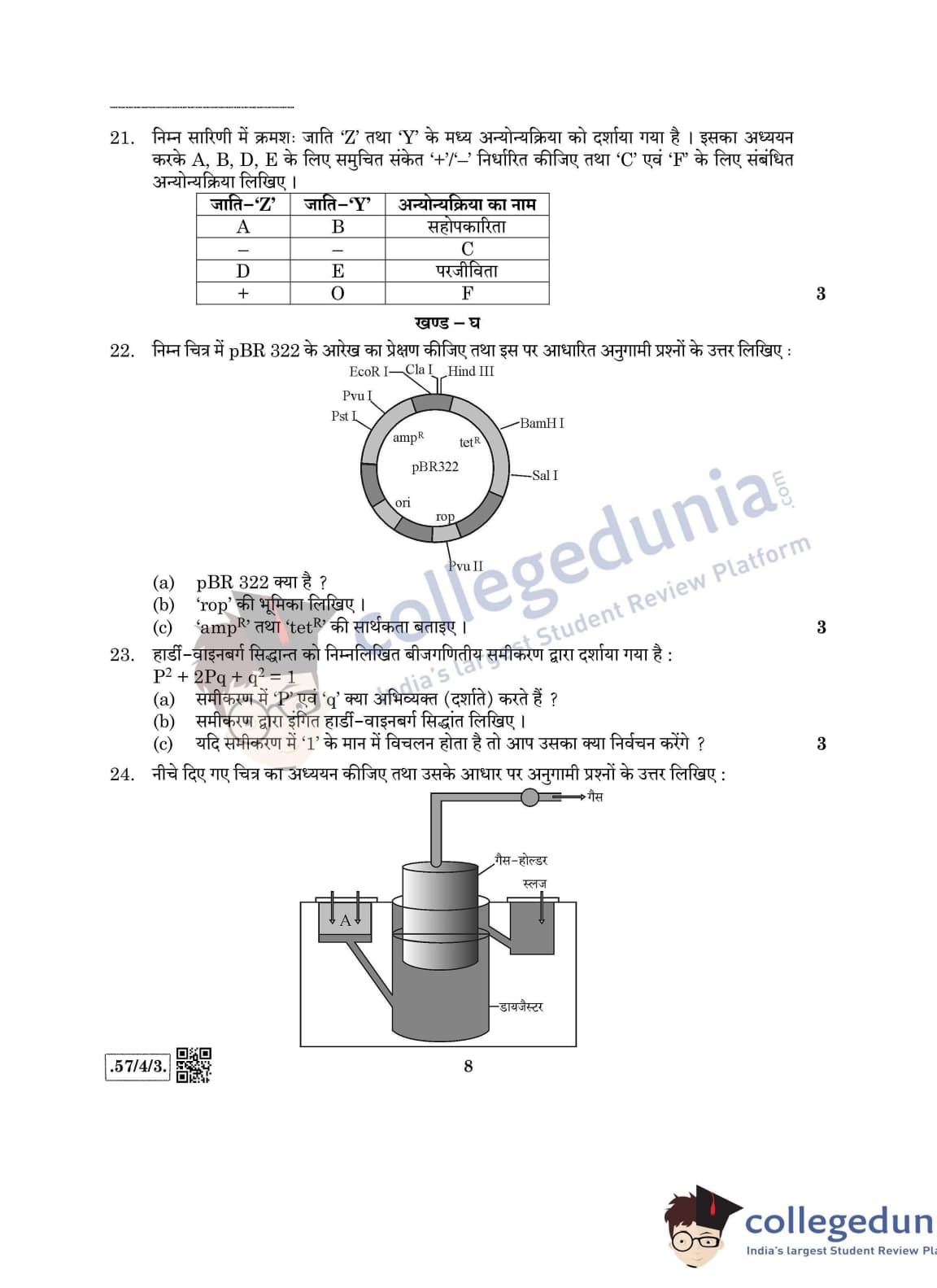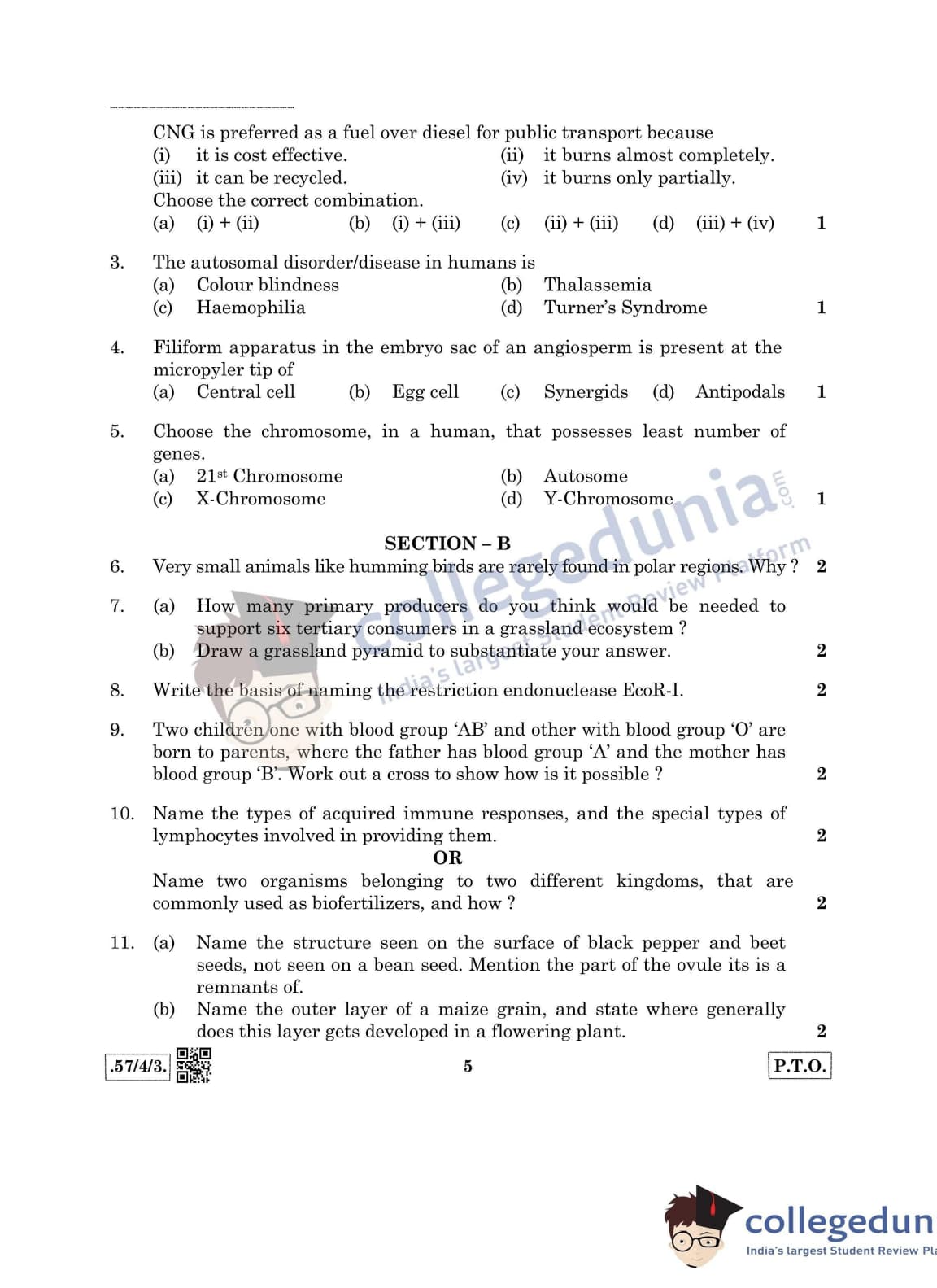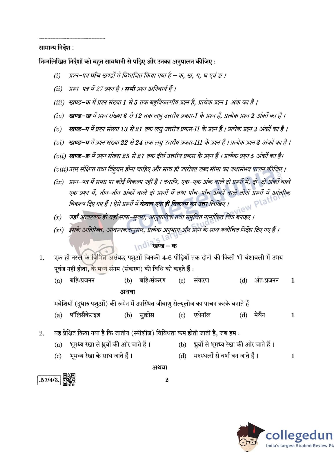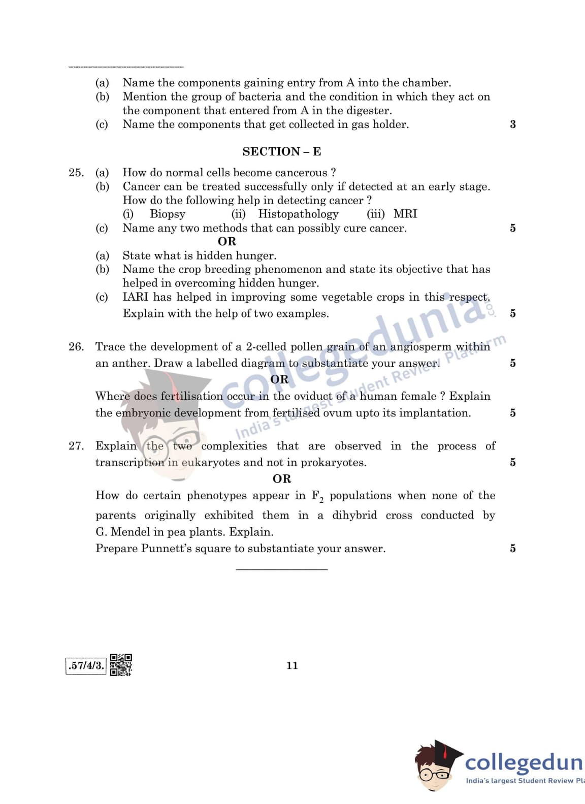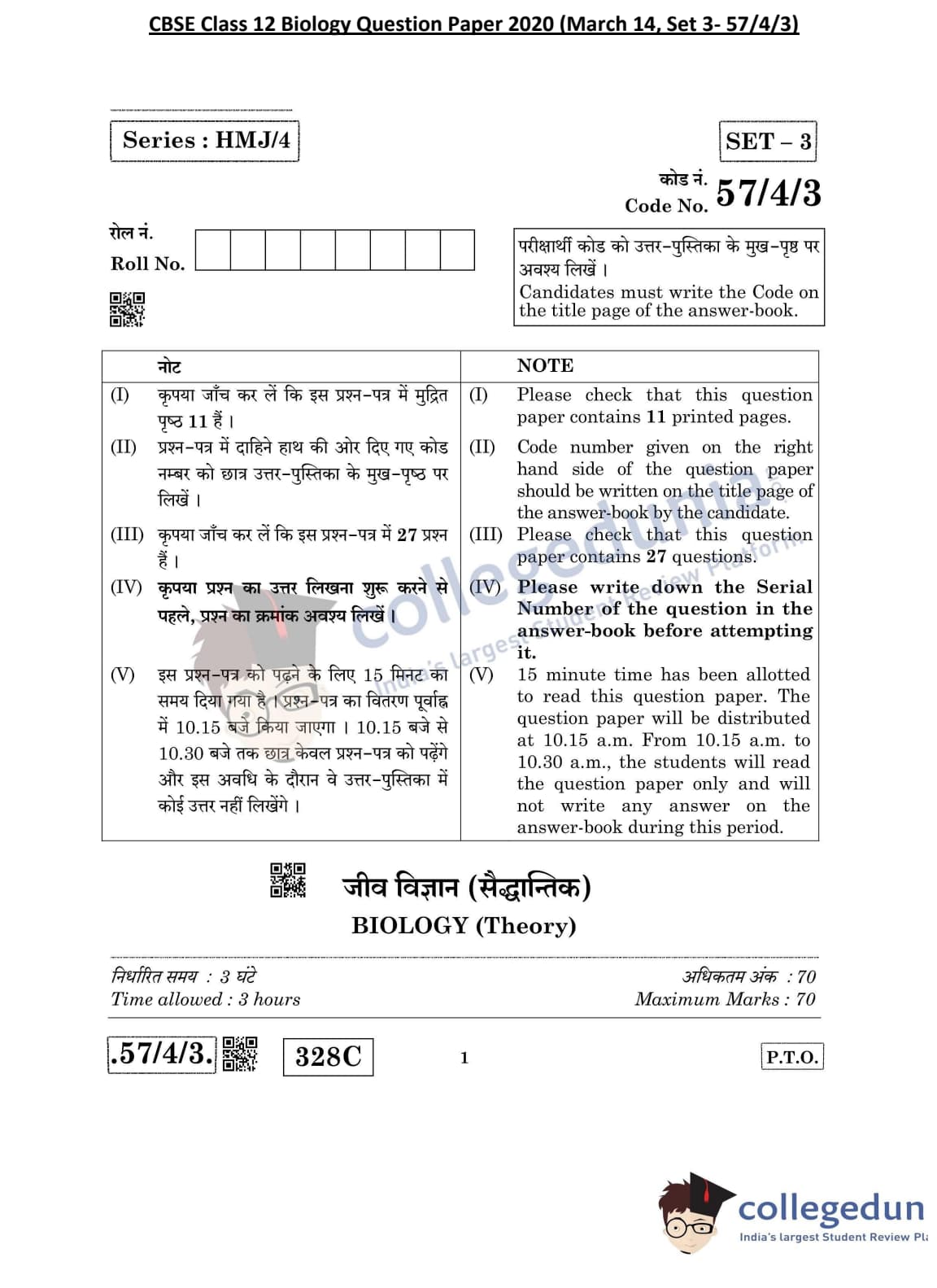 CBSE Class 12 Biology Question Paper 2020 with Answer Key Set 3- 57/4/3 is available for download. The exam was conducted by the Central Board of Secondary Education on March 14, 2020 in the Morning Session 10:30 AM to 1:30 PM. The medium of paper was English & Hindi. In terms of difficulty level, CBSE Class 12 Biology paper was of Moderate level. The question paper comprised a total of 27 questions divided among 5 sections.