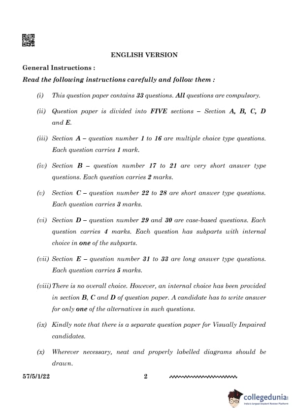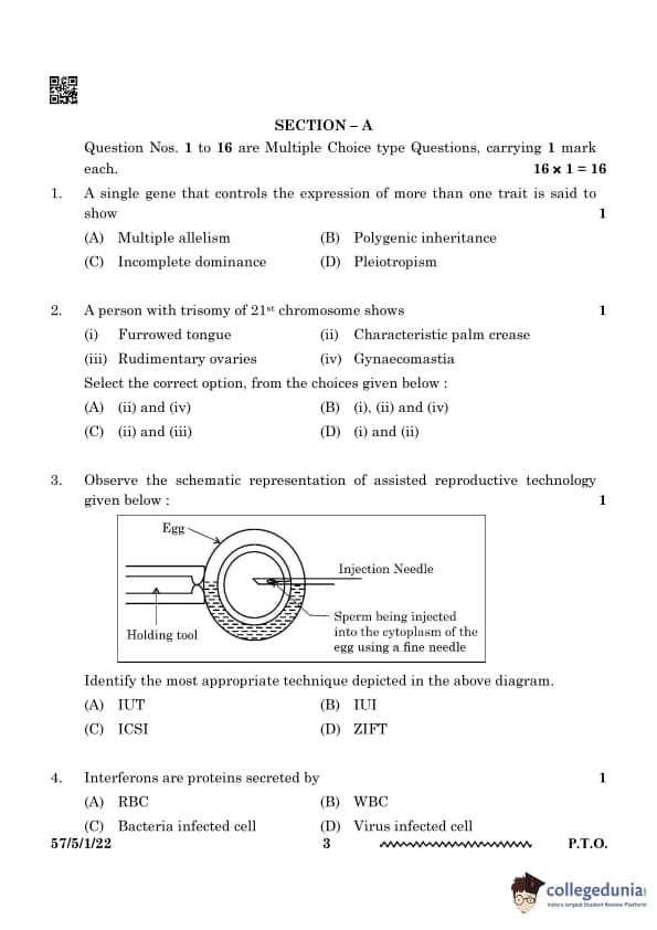 CBSE Class 12 Biology Set 3 Question Paper PDF (57/5/1) is now available for download. CBSE conducted the Class 12 Biology examination on March 19, 2024, from 10:30 AM to 1:30 PM. The question paper consists of 33 questions carrying a total of 70 marks. Section A includes 16 MCQs for 1 mark each, Section B contains 5 very short-answer questions for 2 marks each, Section C comprises 7 short-answer questions for 3 marks each, Section D comprises 2 Case-based questions carries 4 marks each and Section E comprises 3 long-answer questions carries 5 marks each.