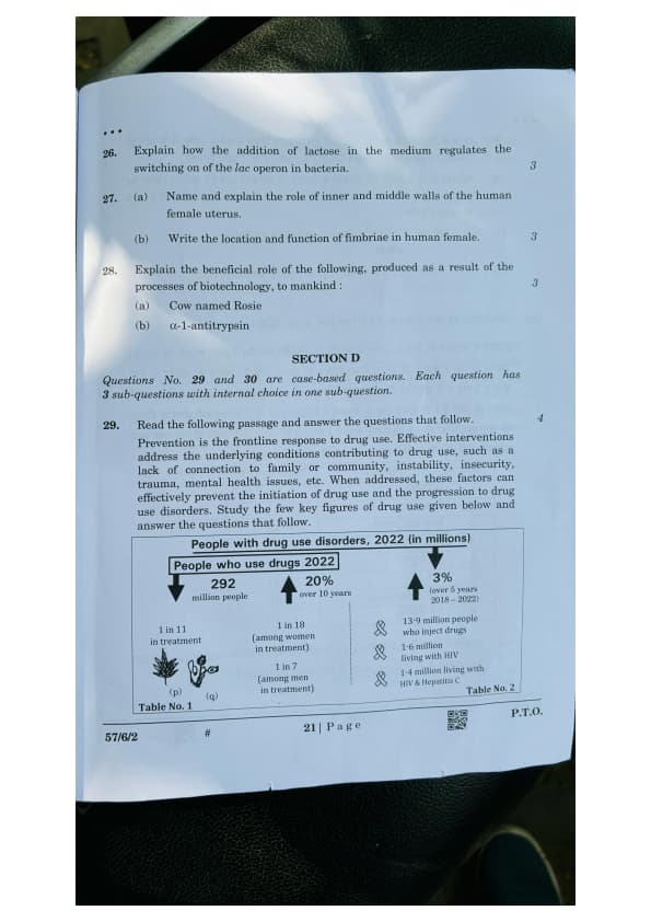(a) What do you infer from the figures in Table No. 1 about the people with drug use disorders, 2022 (in millions)? State any two of your observations.