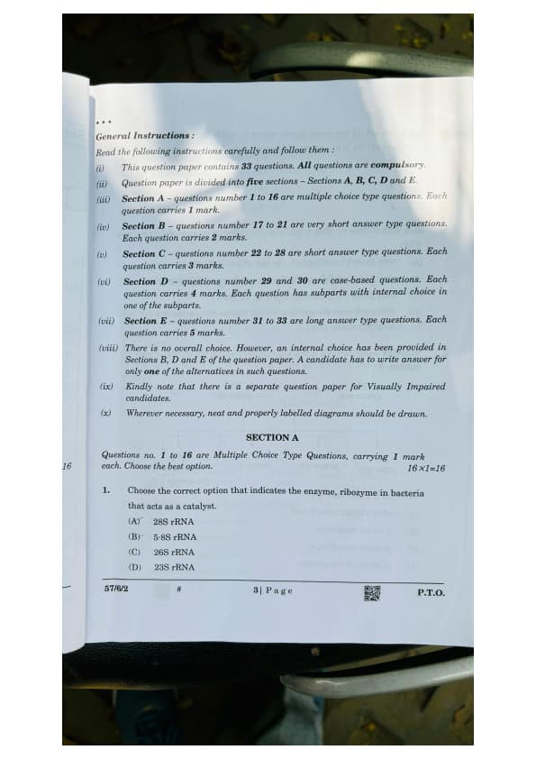 CBSE Class 12 Biology Set 2 Question Paper PDF (57/6/2) is now available for download. CBSE conducted the Class 12 Biology examination on March 25, 2025. The question paper consists of 33 questions carrying a total of 70 marks. Section A includes 16 MCQs for 1 mark each, Section B contains 5 very short-answer questions for 2 marks each, Section C comprises 7 short-answer questions for 3 marks each, Section D comprises 2 Case-based questions carries 4 marks each and Section E comprises 3 long-answer questions carries 5 marks each.