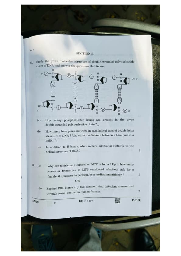 17. Study the given molecular structure of a double-stranded polynucleotide chain of DNA and answer the questions that follow.