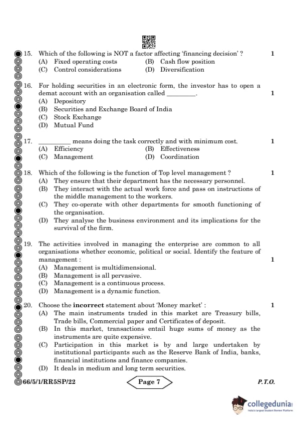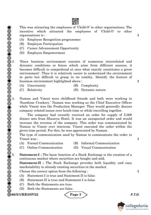 CBSE Class 12 Business Studies Question Paper 2024 PDF (Set 1- 66/5/1) is available for download here. CBSE conducted the Business Studies exam on March 27, 2024 from 10:30 AM to 1:30 PM. The total marks for the theory paper are 80. The question paper will contain 20% MCQ-based questions, 40% competency-based questions, and 40% short and long answer type questions.