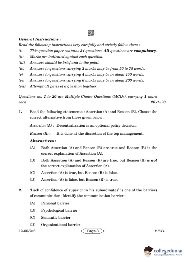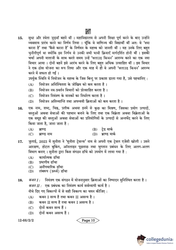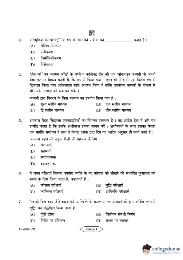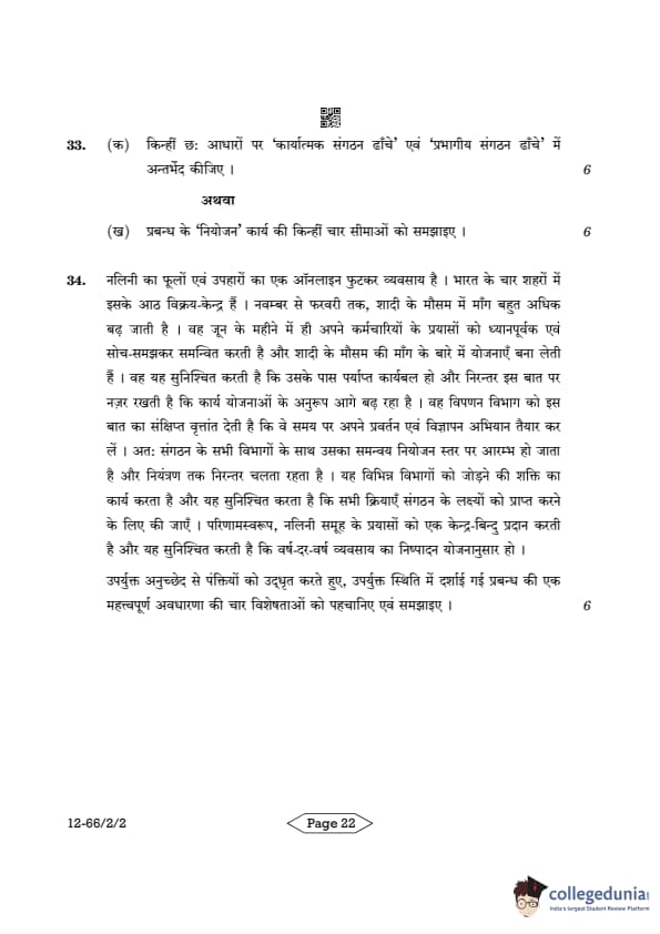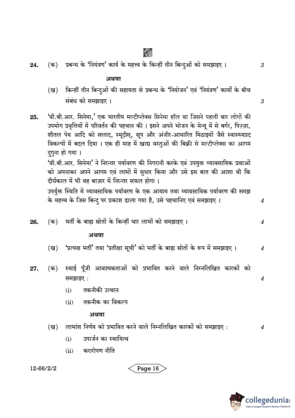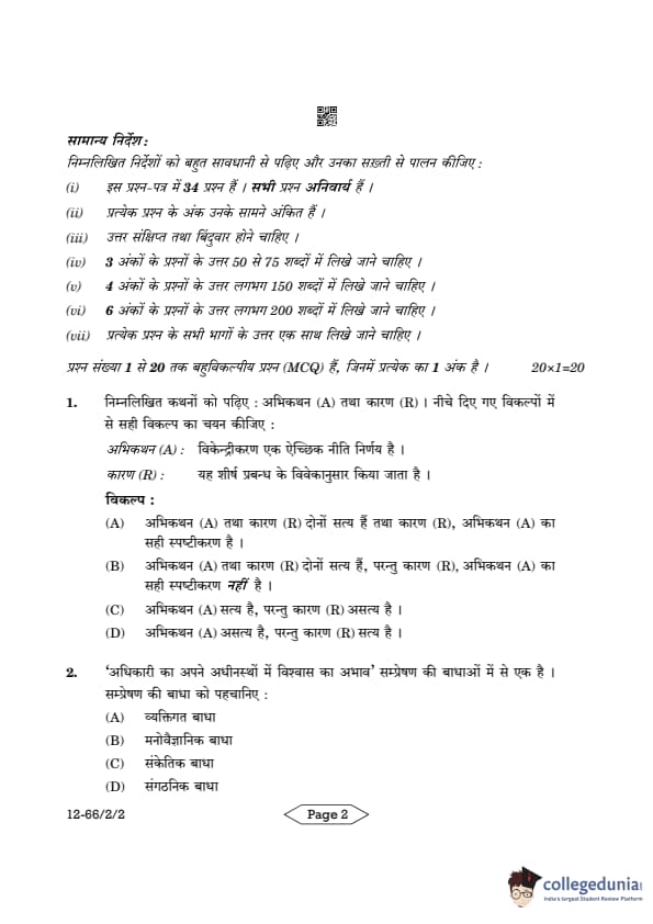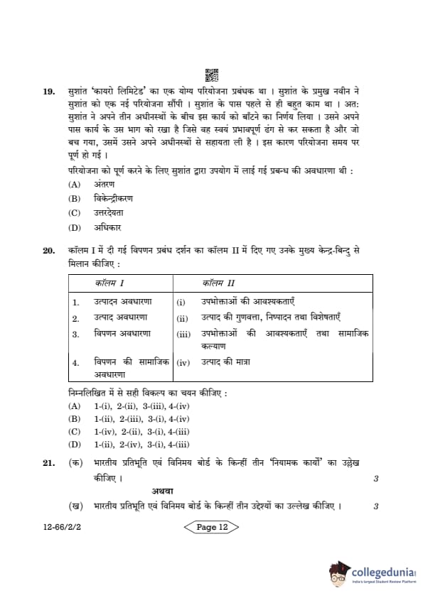 CBSE Class 12 Business Studies Question Paper 2024 PDF (Set 2- 66/2/2) is available for download here. CBSE conducted the Business Studies exam on March 27, 2024 from 10:30 AM to 1:30 PM. The total marks for the theory paper are 80. The question paper will contain 20% MCQ-based questions, 40% competency-based questions, and 40% short and long answer type questions.