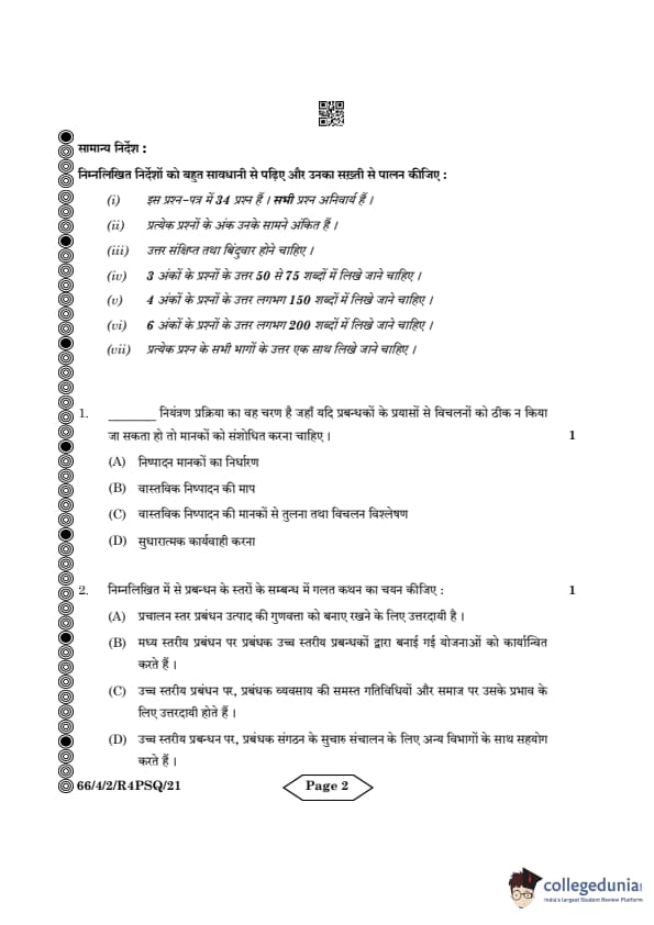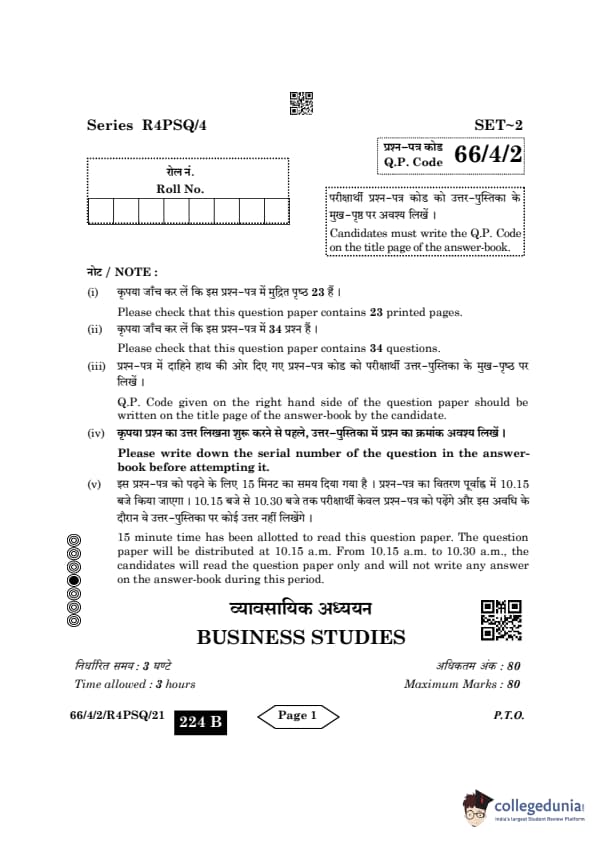 CBSE Class 12 Business Studies Question Paper 2024 PDF (Set 2- 66/4/2) is available for download here. CBSE conducted the Business Studies exam on March 27, 2024 from 10:30 AM to 1:30 PM. The total marks for the theory paper are 80. The question paper will contain 20% MCQ-based questions, 40% competency-based questions, and 40% short and long answer type questions. Candidates can use the link below to download the CBSE Class 12 Business Studies Set 2 Question Paper with detailed solutions.