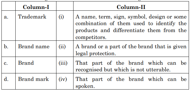 \[ a. Trademark - (ii), b. Brand name - (iv), c. Brand - (i), d. Brand mark - (iii) \]