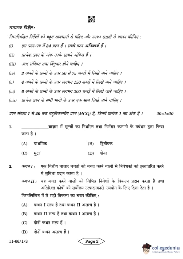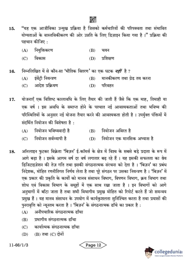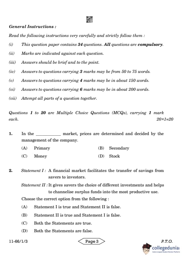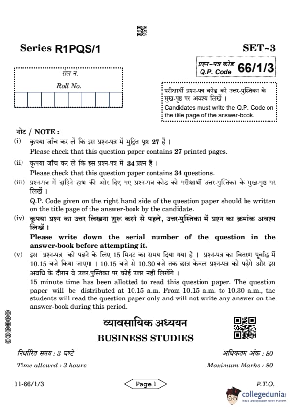 CBSE Class 12 Business Studies Question Paper 2024 PDF (Set 3- 66/1/3) is available for download here. CBSE conducted the Business Studies exam on March 27, 2024 from 10:30 AM to 1:30 PM. The total marks for the theory paper are 80. The question paper will contain 20% MCQ-based questions, 40% competency-based questions, and 40% short and long answer type questions. Candidates can use the link below to download the CBSE Class 12 Business Studies Set 3 Question Paper with detailed solutions.