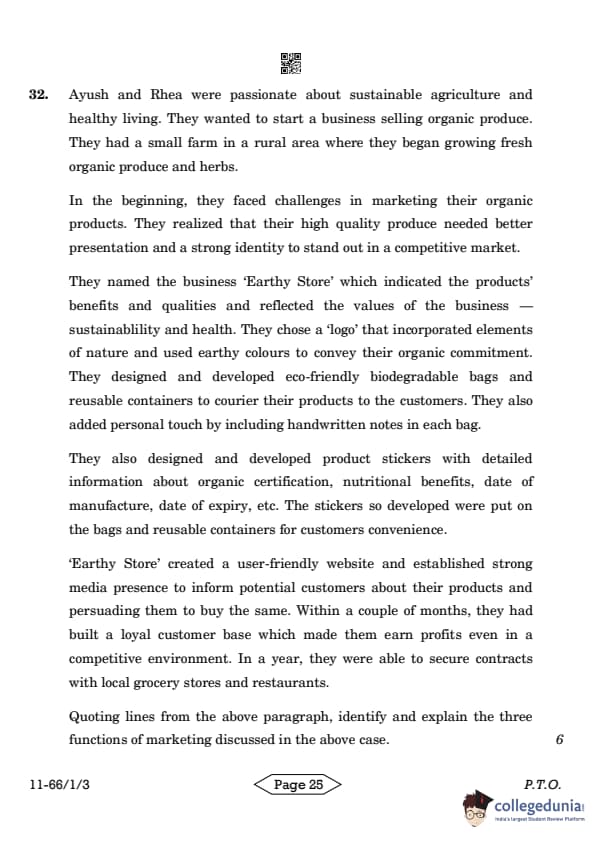 Ayush and Rhea were passionate about sustainable agriculture and healthy living. They wanted to start a business selling organic produce. They had a small farm in a rural area where they began growing fresh organic produce and herbs. In the beginning, they faced challenges in marketing their organic products. They realized that their high quality produce needed better presentation and a strong identity to stand out in a competitive market. They named the business ‘Earthy Store' which indicated the products' benefits and qualities and reflected the values of the business - sustainability and health. They chose a 'logo' that incorporated elements of nature and used earthy colours to convey their organic commitment. They designed and developed eco-friendly biodegradable bags and reusable containers to courier their products to the customers. They also added a personal touch by including handwritten notes in each bag. They also designed and developed product stickers with detailed information about organic certification, nutritional benefits, date of manufacture, date of expiry, etc. The stickers so developed were put on the bags and reusable containers for customers' convenience. ‘Earthy Store' created a user-friendly website and established a strong media presence to inform potential customers about their products and persuade them to buy the same. Within a couple of months, they had built a loyal customer base which made them earn profits even in a competitive environment. In a year, they were able to secure contracts with local grocery stores and restaurants.