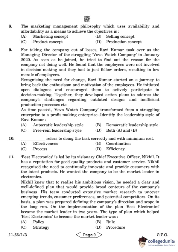 Step 2: Applying to the given case: Ravi Kumar encouraged employees to actively participate in decision-making, promoting enthusiasm and motivation. This aligns with democratic leadership, where employees are given a voice in business decisions, fostering a sense of ownership and commitment. Therefore, the correct answer is option B.