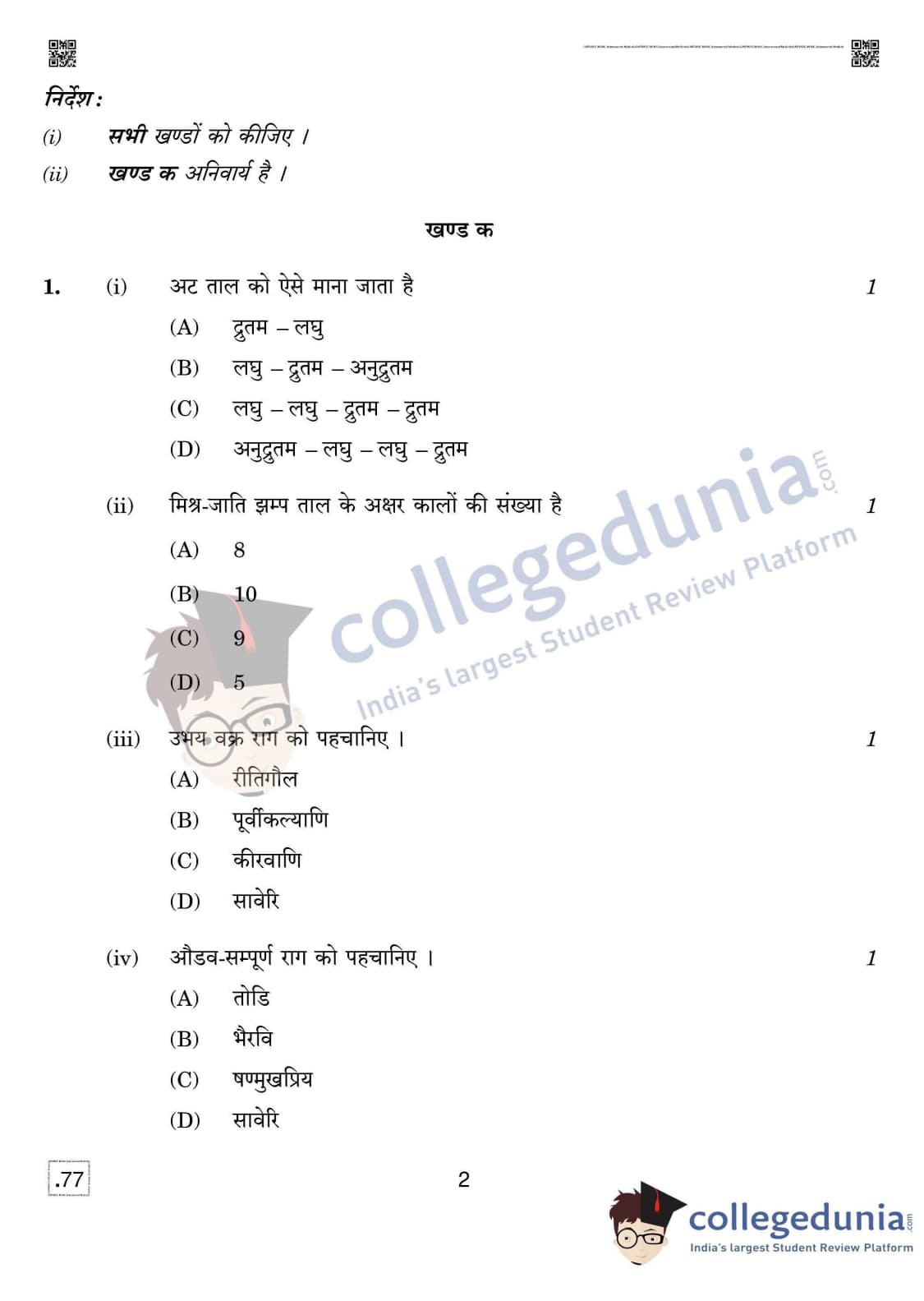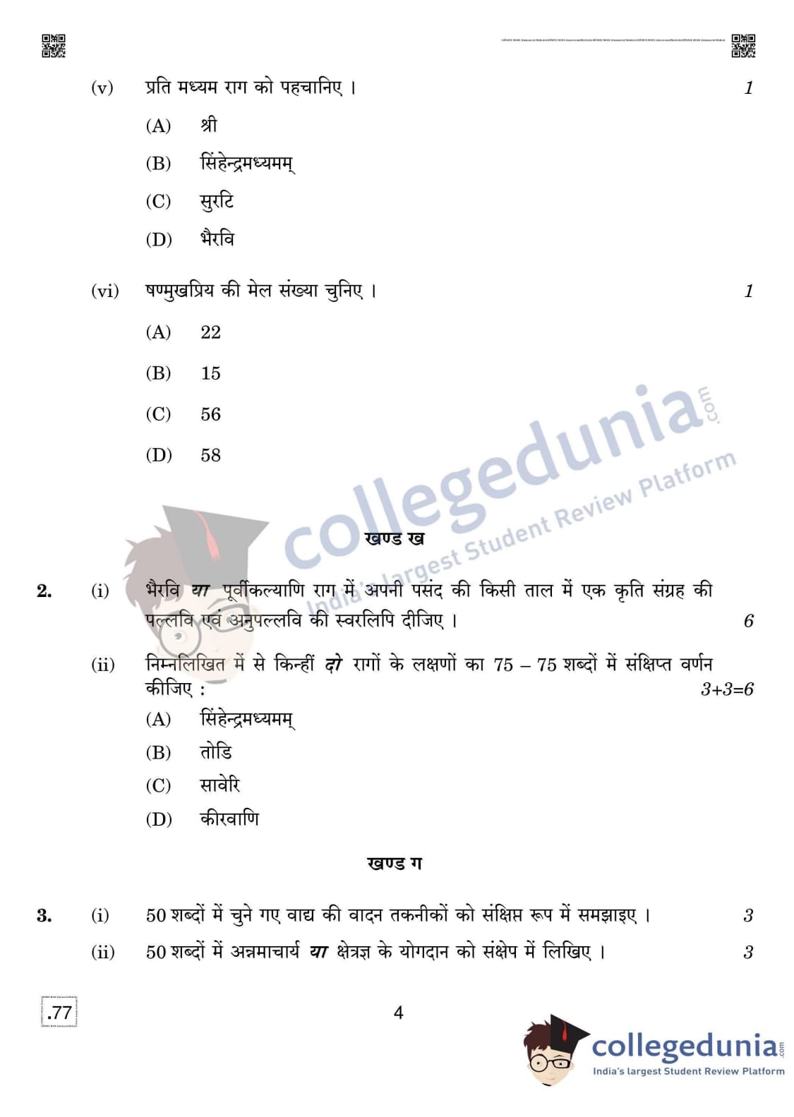 CBSE Class 12 Carnatic Music (Instrumental Melodic) Question Paper 2020 with Answer Key Set 4 is available for download. The exam was conducted by the Central Board of Secondary Education on March 16, 2020 in the Morning Session 10:30 AM to 12:30 PM. The medium of paper was English & Hindi. The question paper comprised a total of 4 questions divided among 4 sections.
