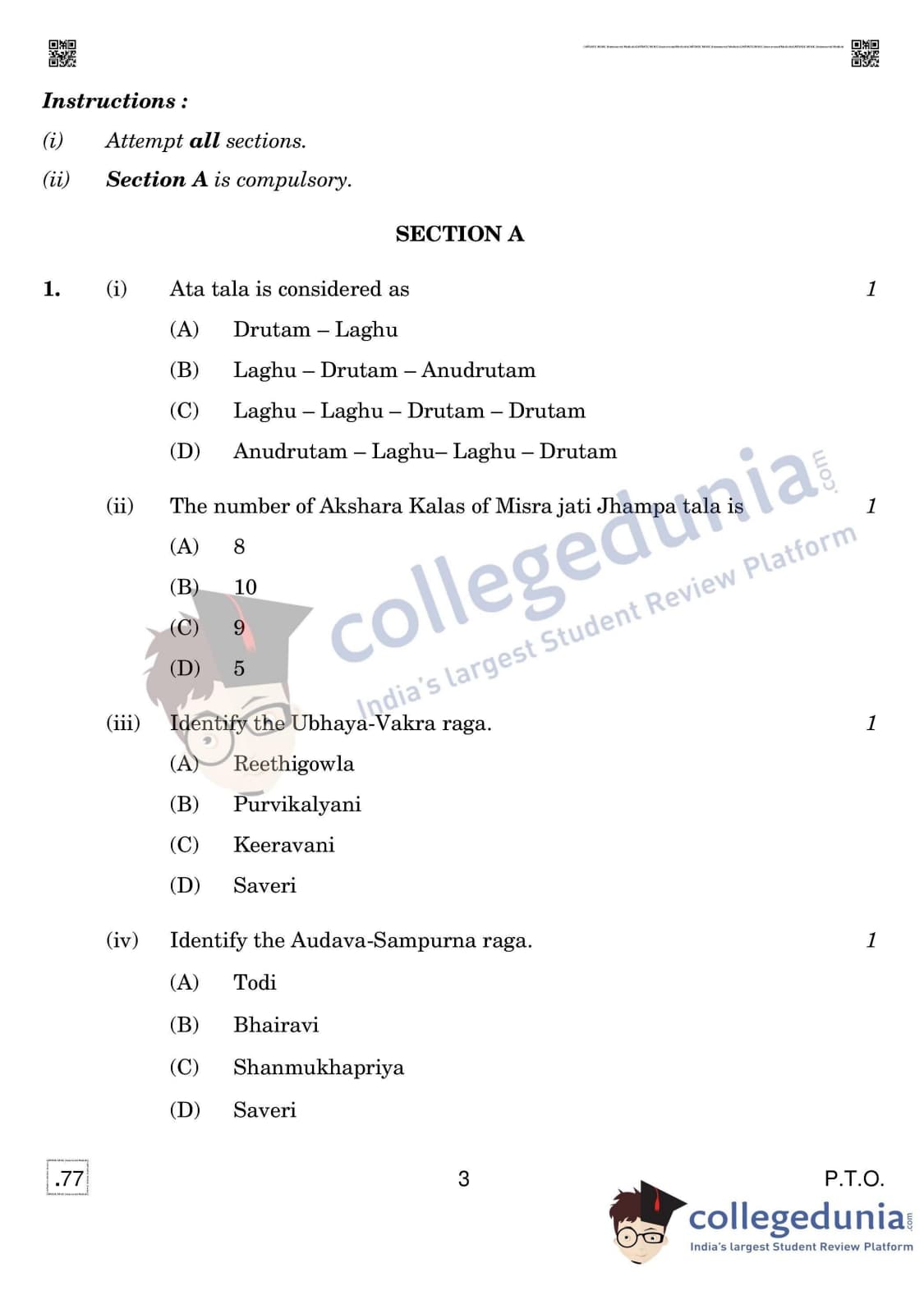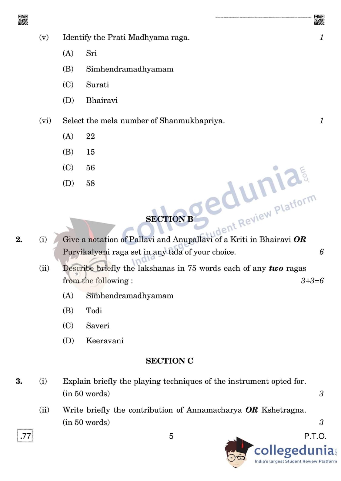 CBSE Class 12 Carnatic Music (Instrumental Melodic) Question Paper 2020 with Answer Key (March 16)