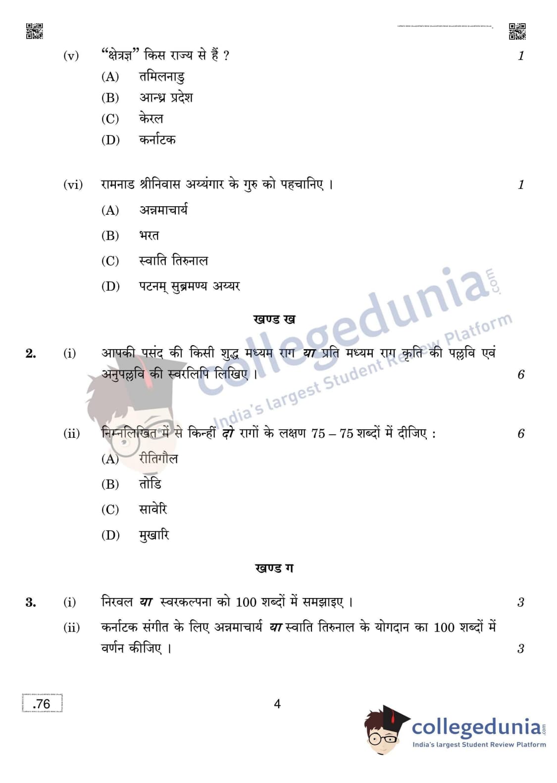 CBSE Class 12 Carnatic Music (Vocal) Question Paper 2020 with Answer Key Set 4 is available for download. The exam was conducted by the Central Board of Secondary Education on March 16, 2020 in the Morning Session 10:30 AM to 12:30 PM. The medium of paper was English & Hindi. The question paper comprised a total of 4 questions divided among 4 sections.