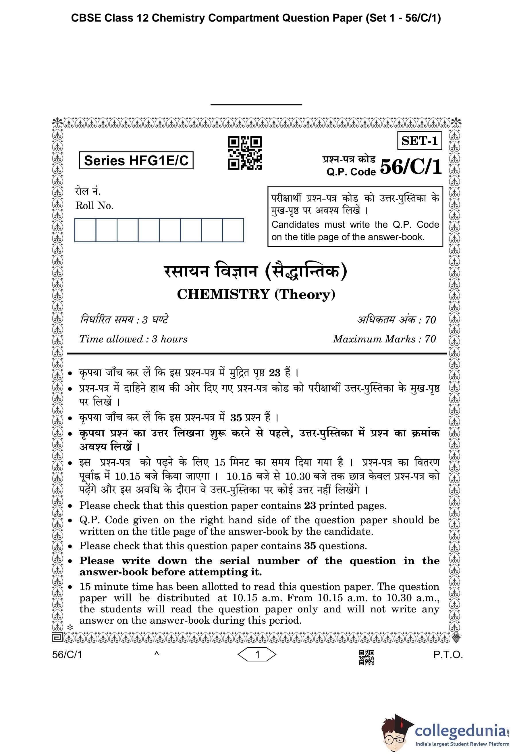 CBSE Class 12 Chemistry Compartment Question Paper 2023 with Answer Key pdf (Set 1 - 56/C/1) is available for download here. The exam was conducted by Central Board of Secondary Education on July 17, 2023 in the Morning Session 10:30 AM to 1:30 PM. The question paper comprised a total of 35 questions divided among 5 sections.