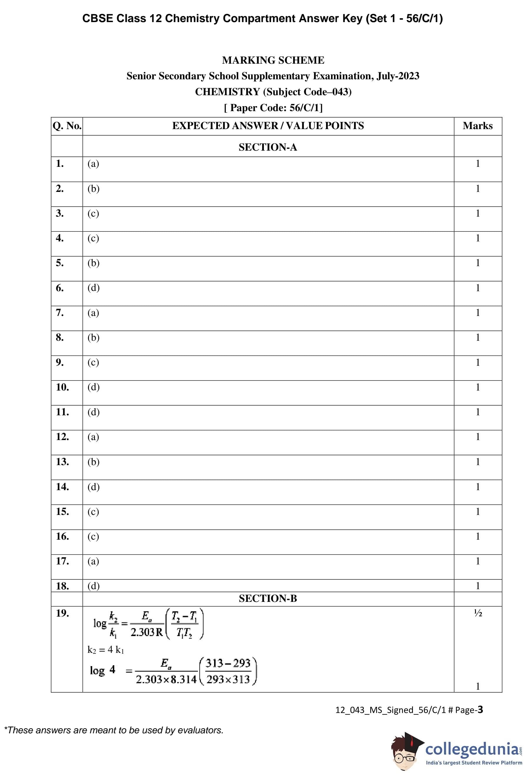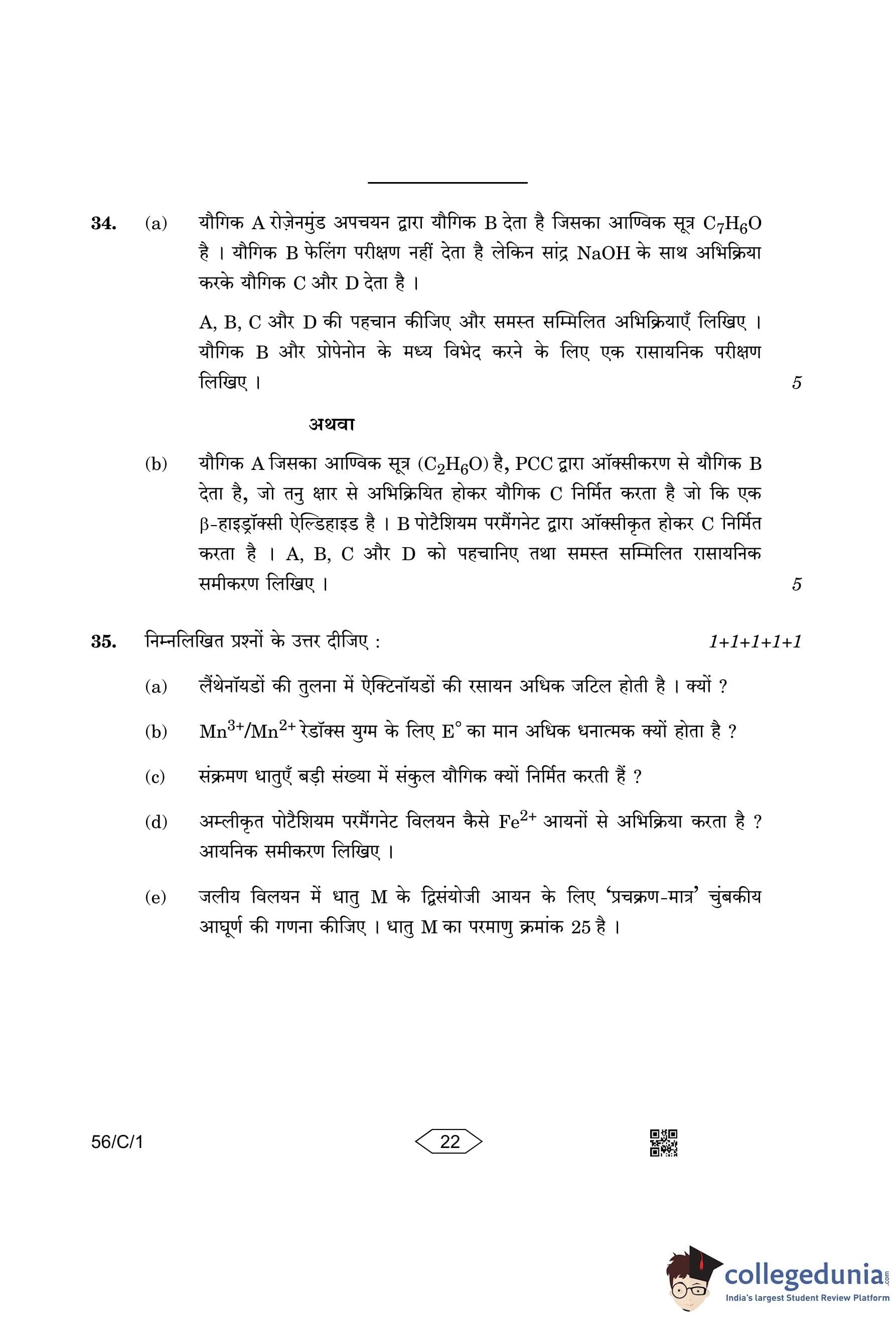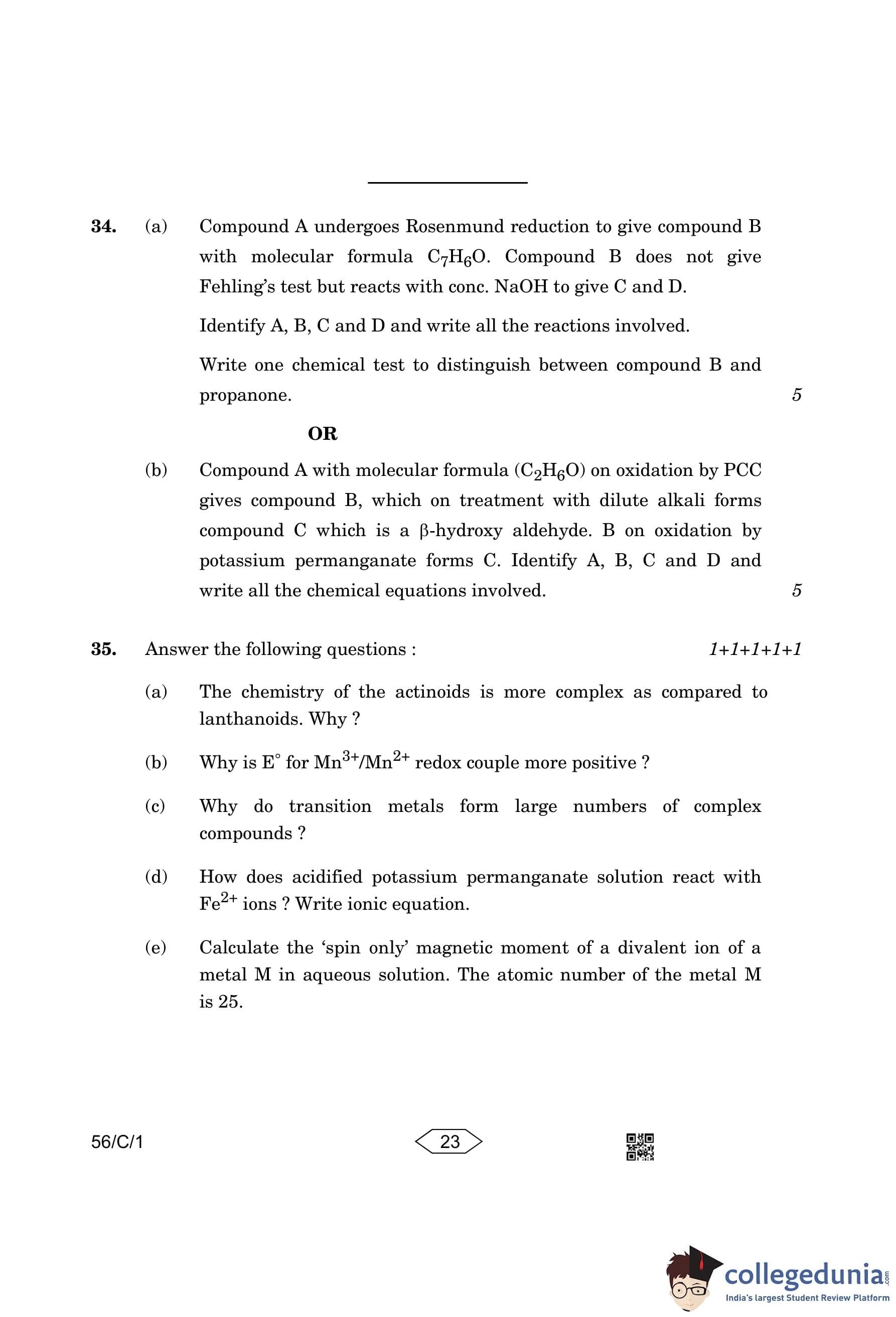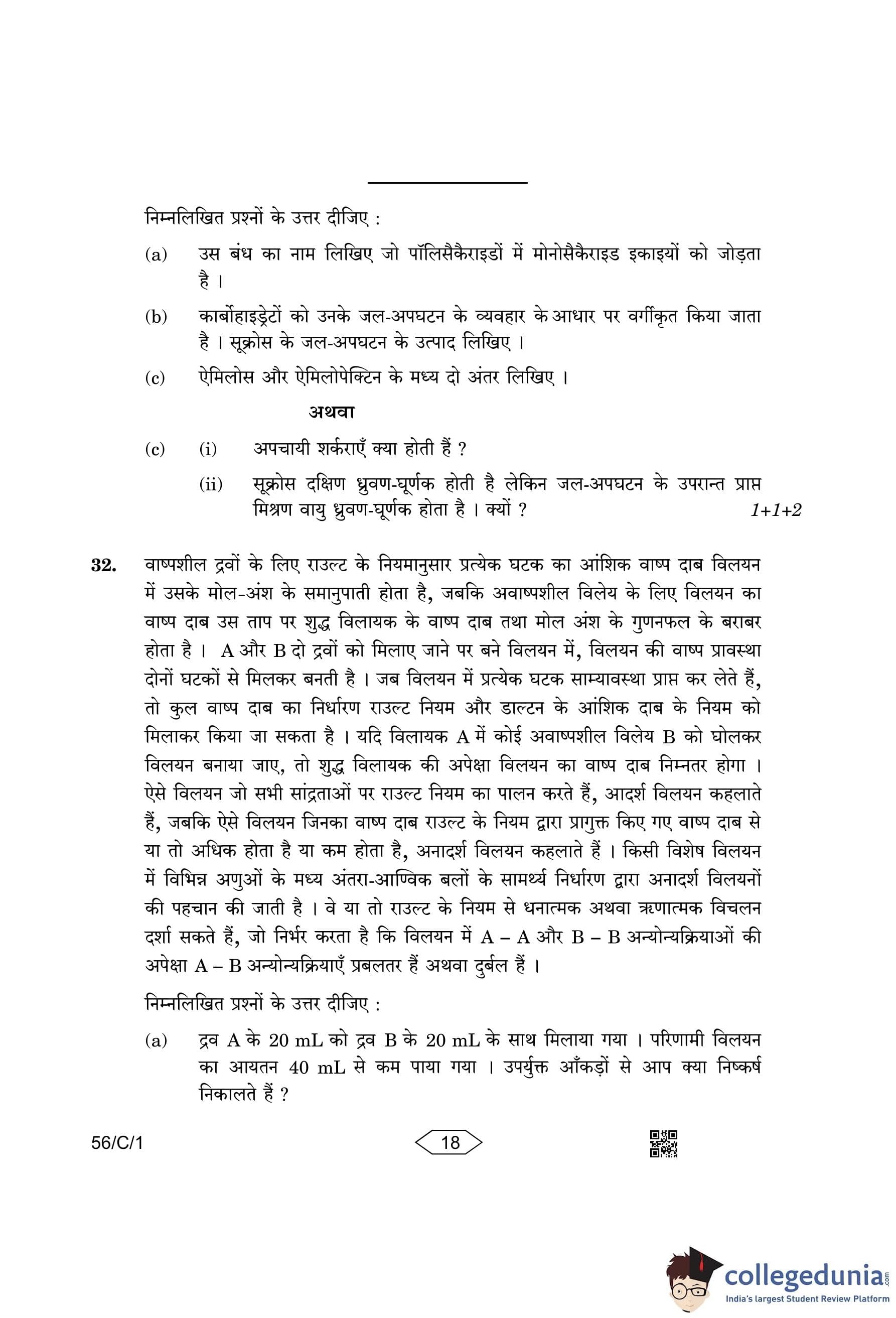 CBSE Class 12 Chemistry (Set 1 - 56/C/1) Compartment Question Paper 2023 with Answer Key