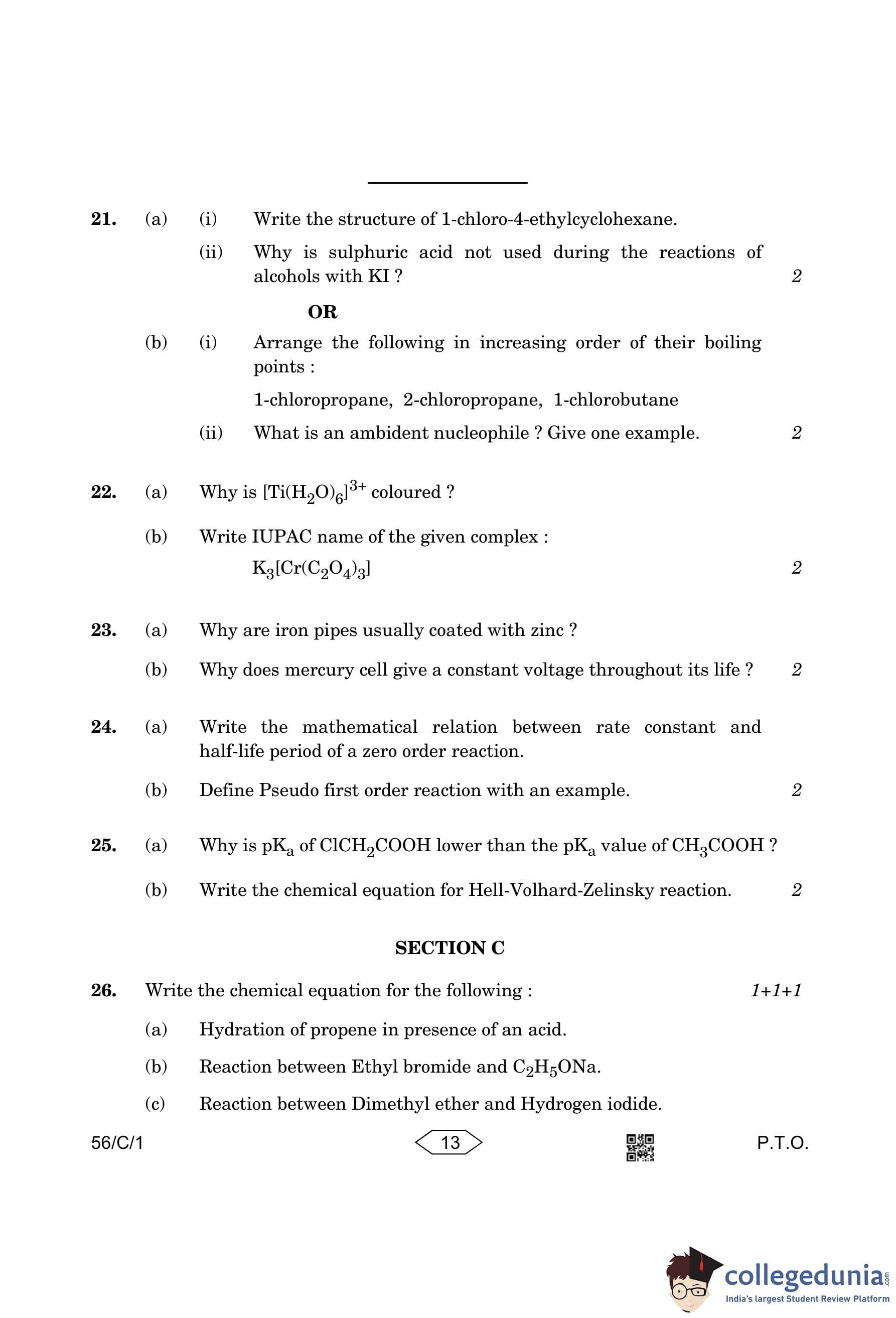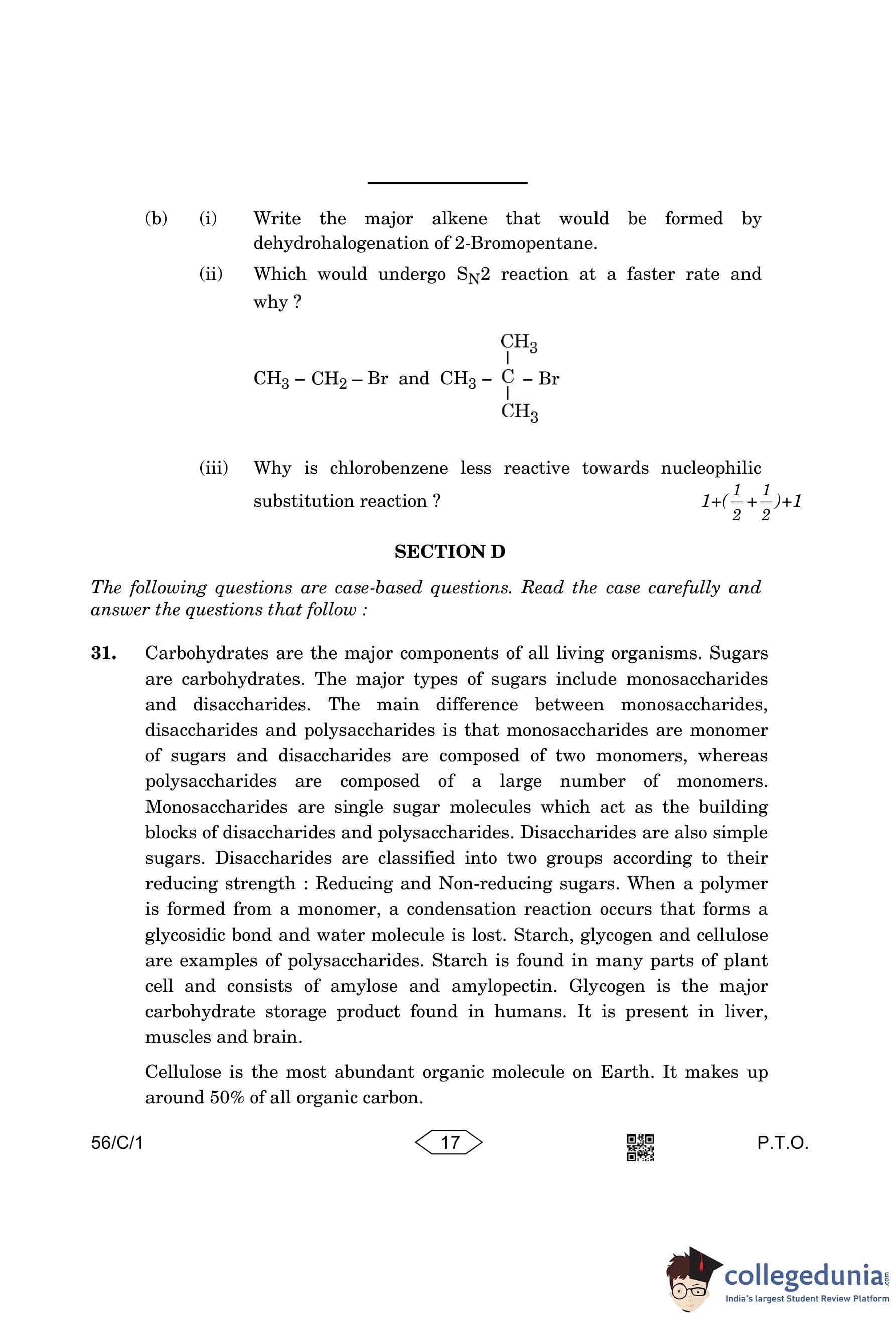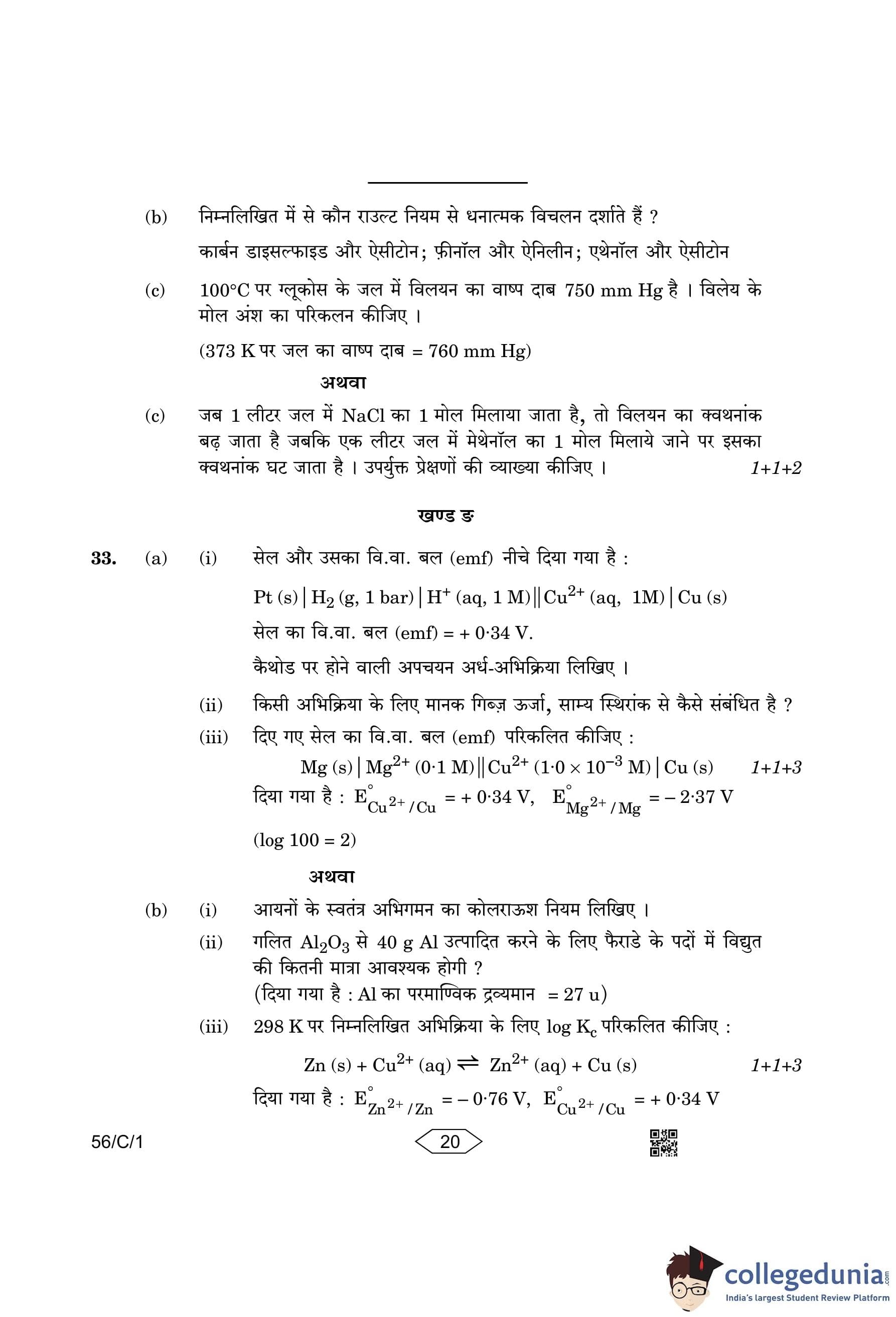 CBSE Class 12 Chemistry (Set 1 - 56/C/1) Compartment Question Paper 2023 with Answer Key