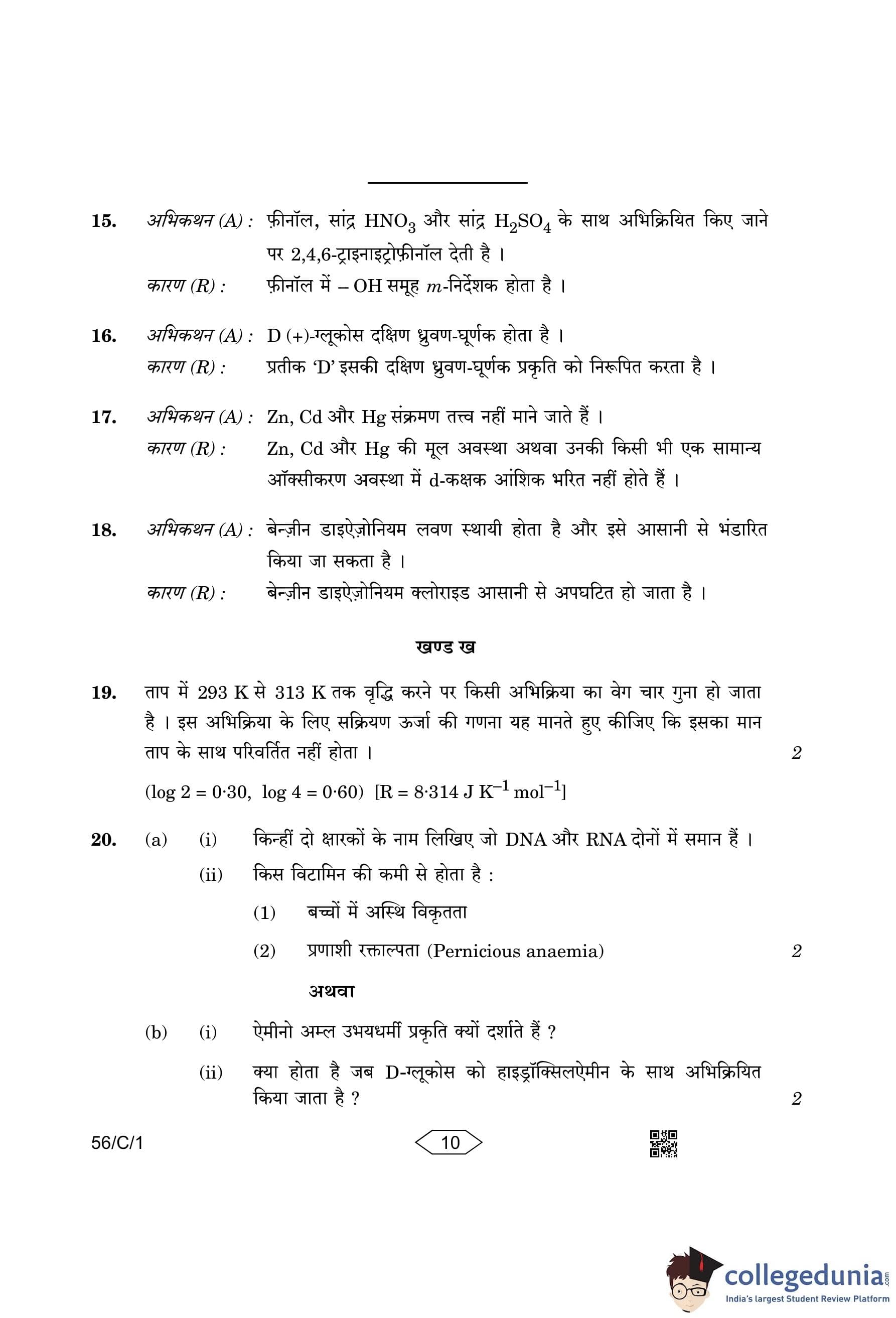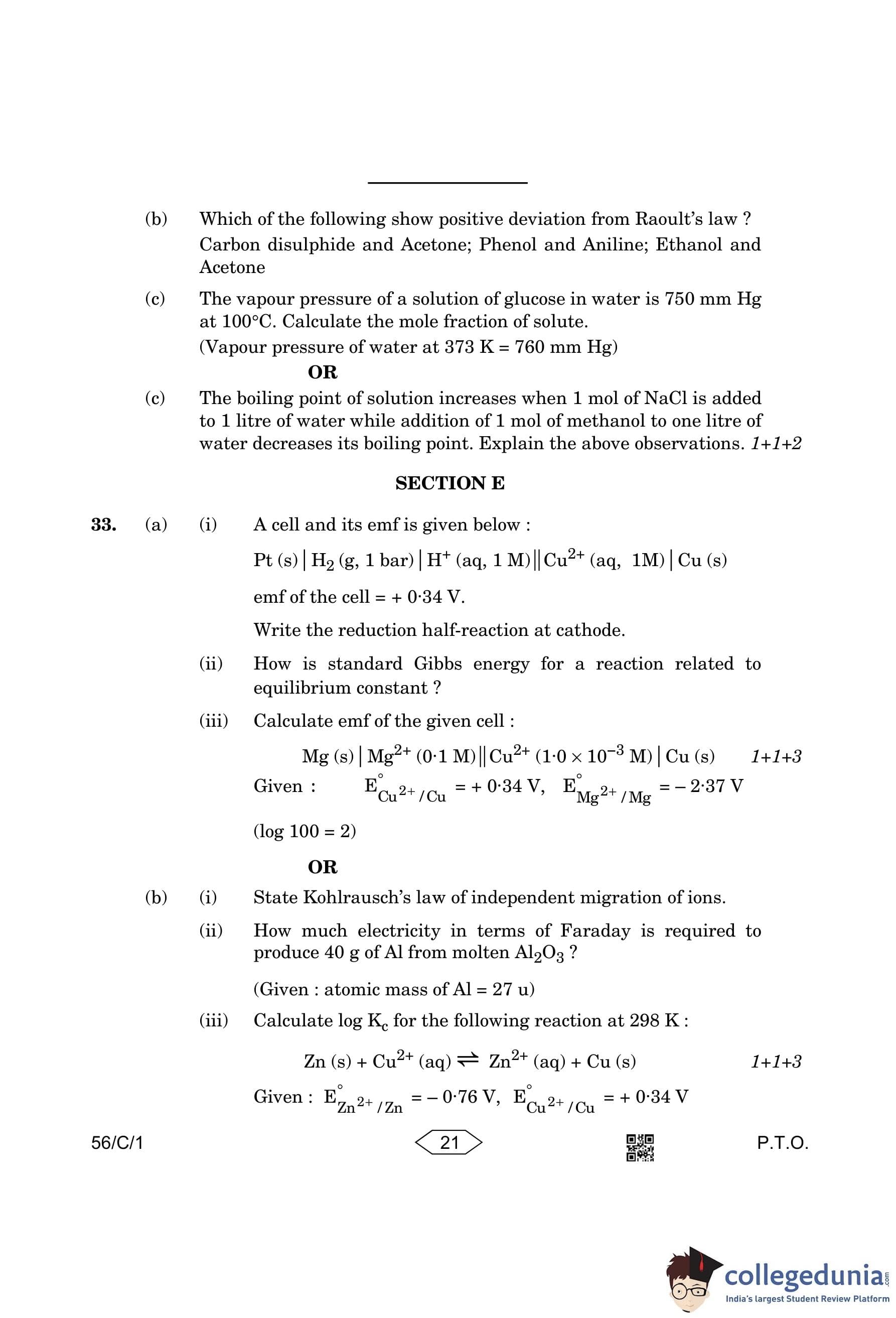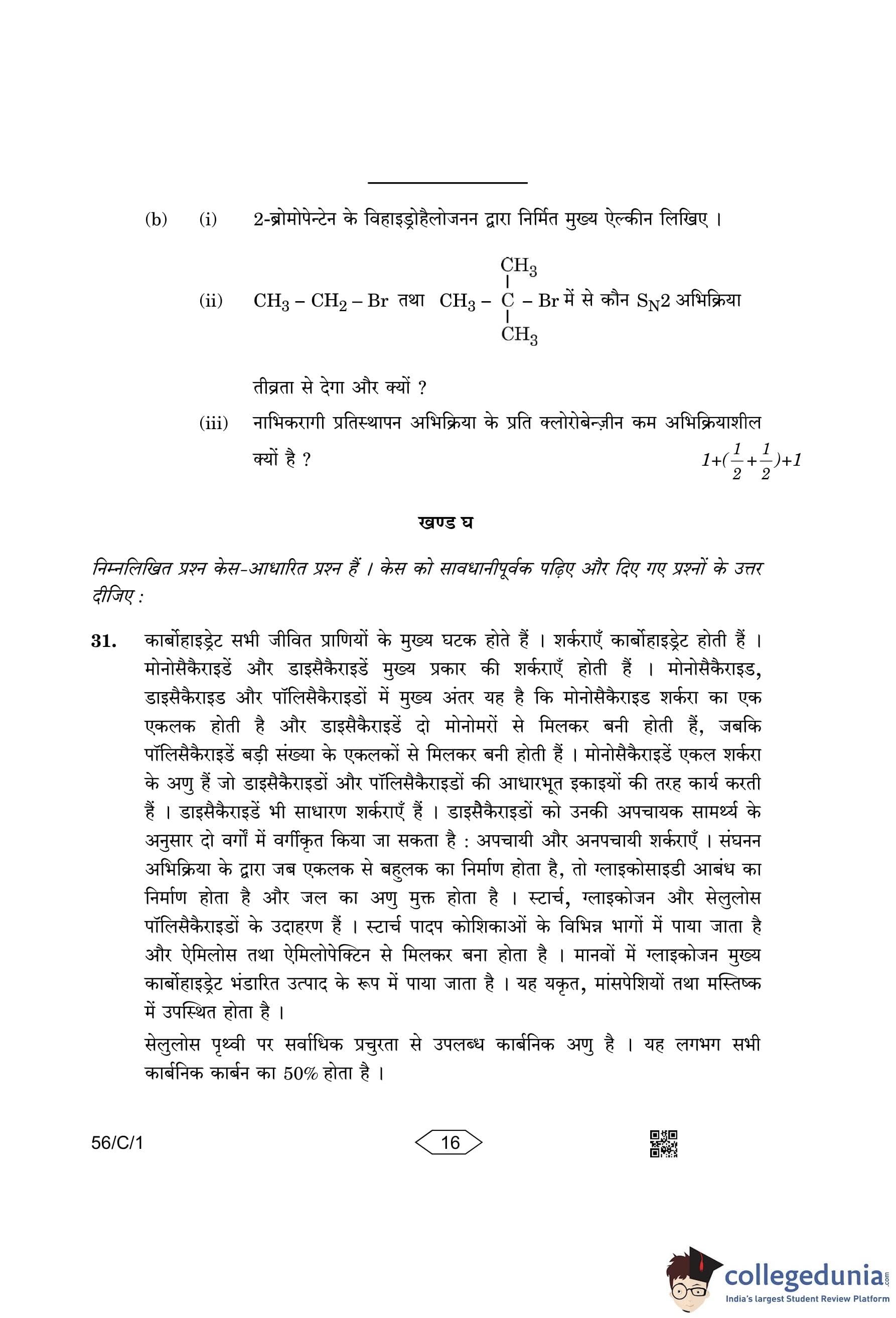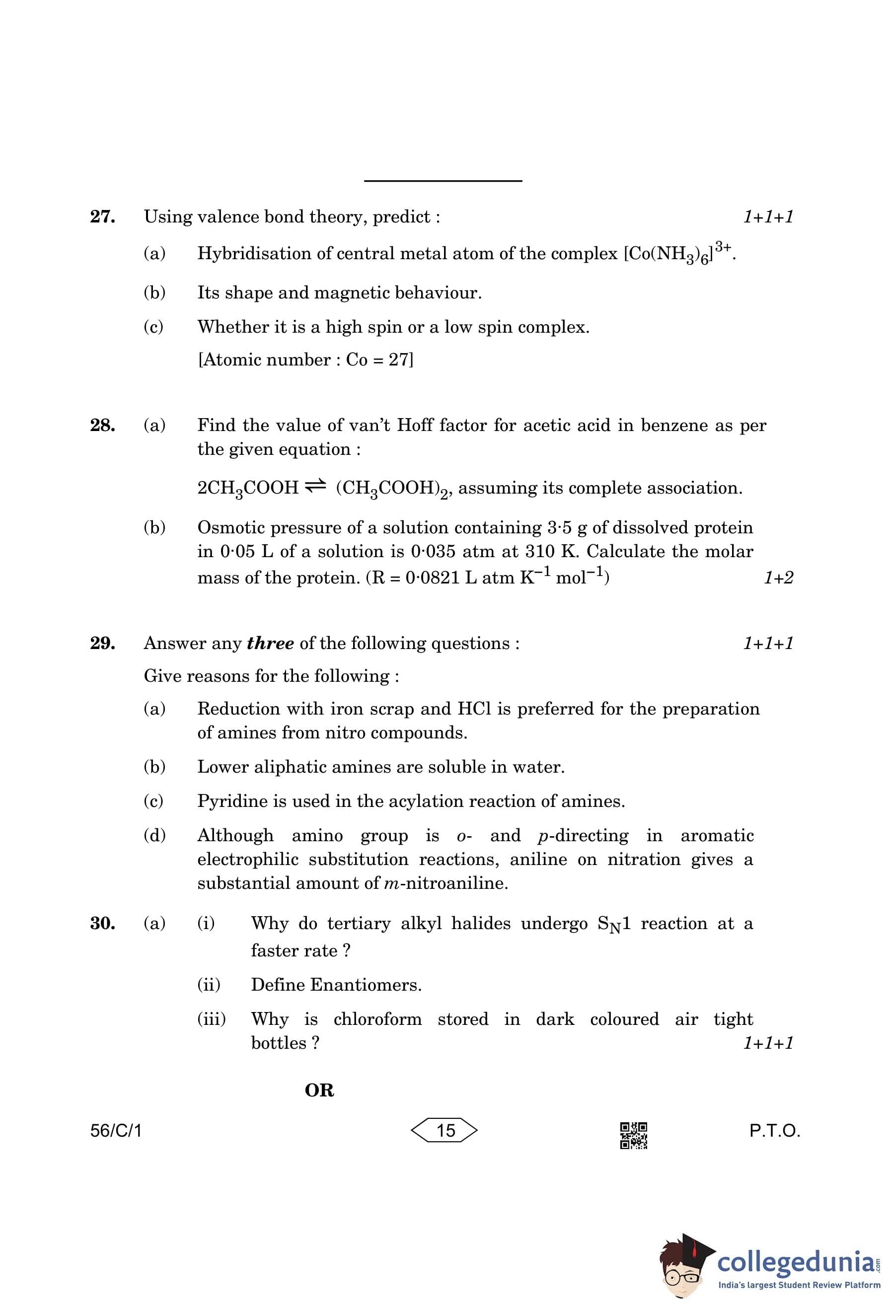 CBSE Class 12 Chemistry (Set 1 - 56/C/1) Compartment Question Paper 2023 with Answer Key