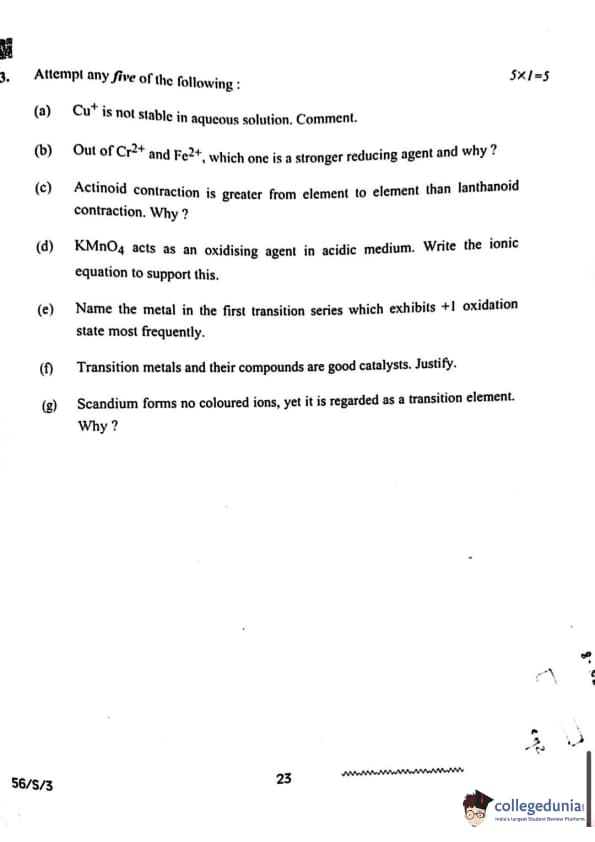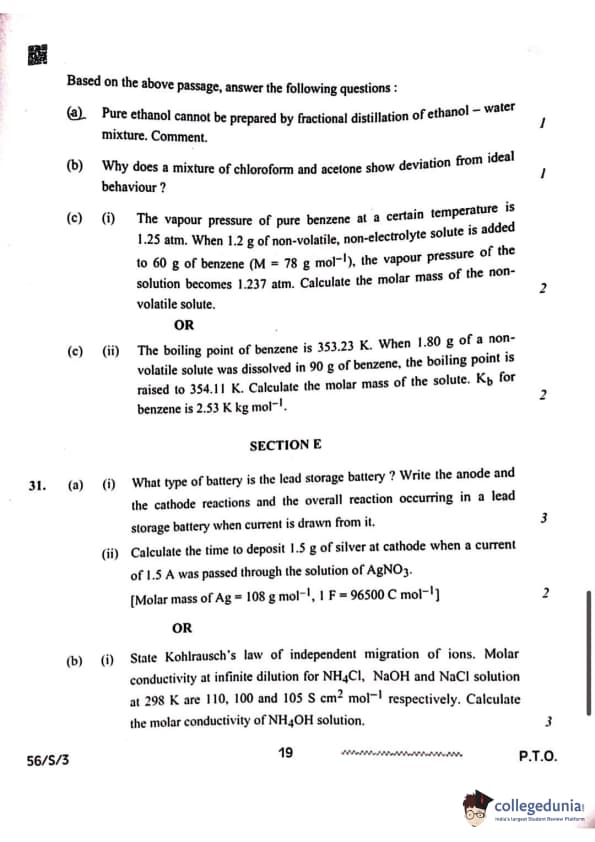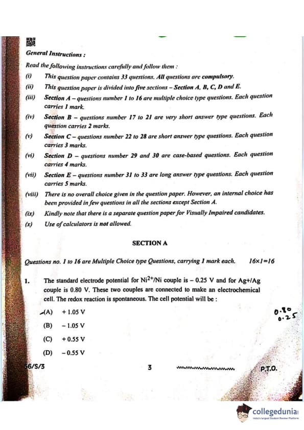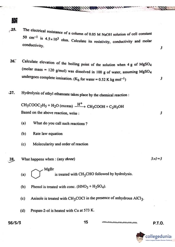 CBSE Class 12 Chemistry Compartment Question Paper 2024 with Answer Key pdf (Set 3 - 56/S/3) is available for download here. The exam was conducted by Central Board of Secondary Education on July 15, 2024 in the Morning Session 10:30 AM to 1:30 PM. The question paper consists a total of 33 questions divided among 5 sections.
