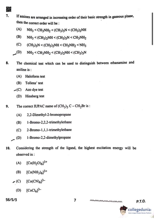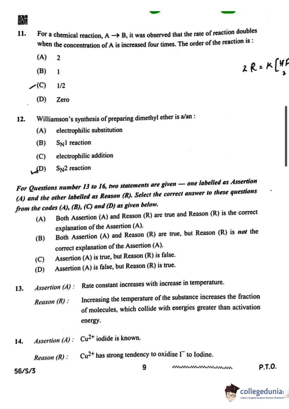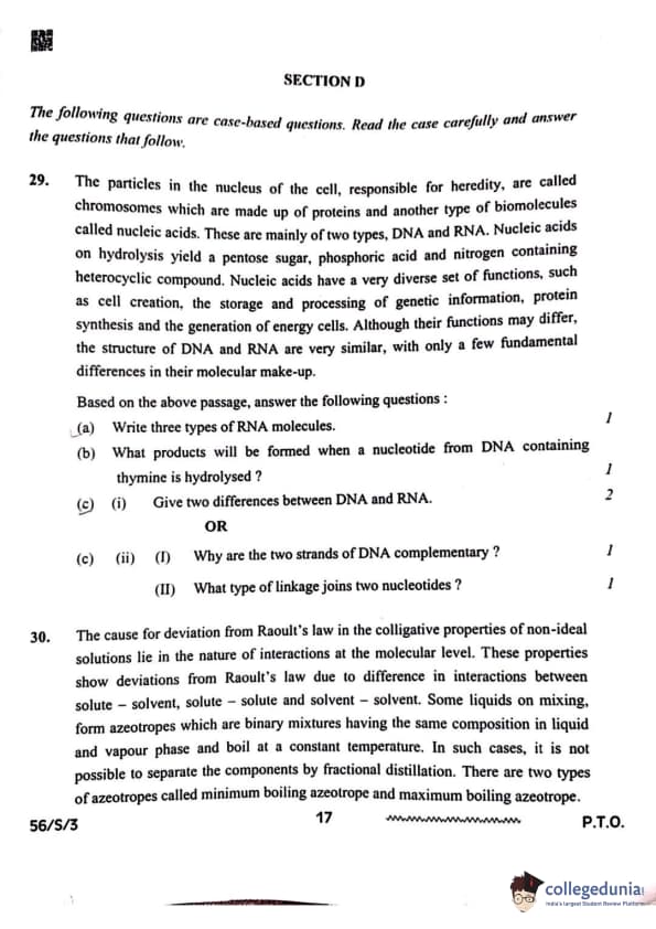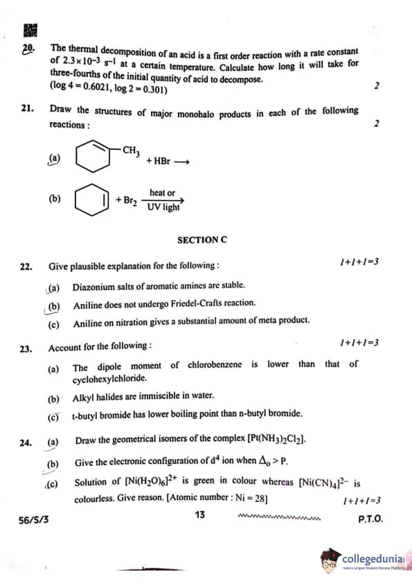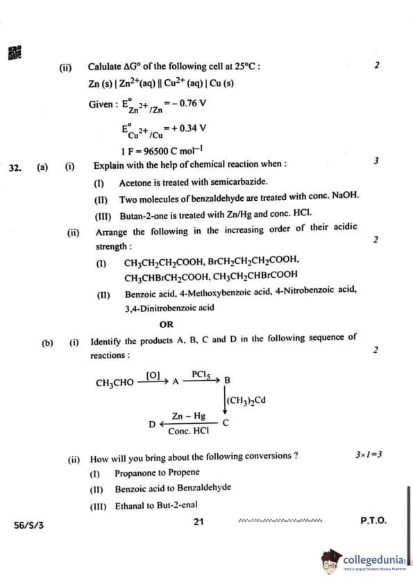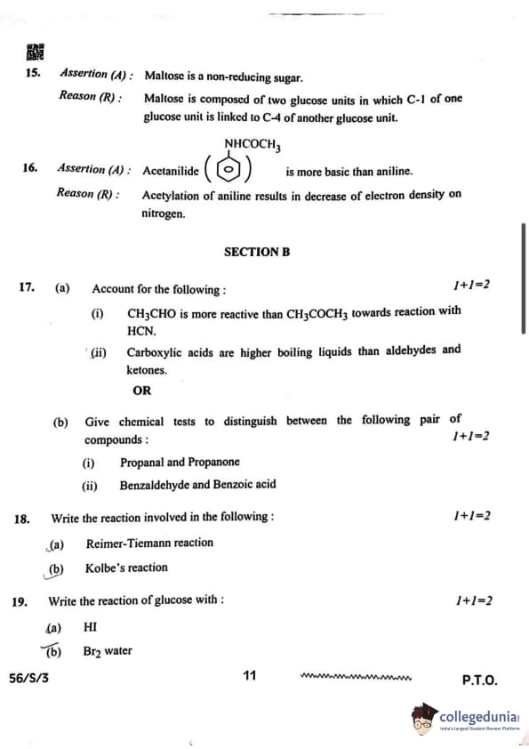 CBSE Class 12 Chemistry (Set 3 - 56/S/3) Compartment Question Paper 2024 with Answer Key