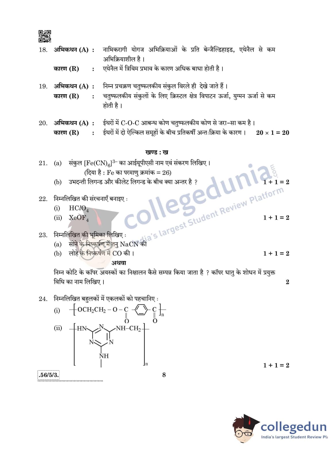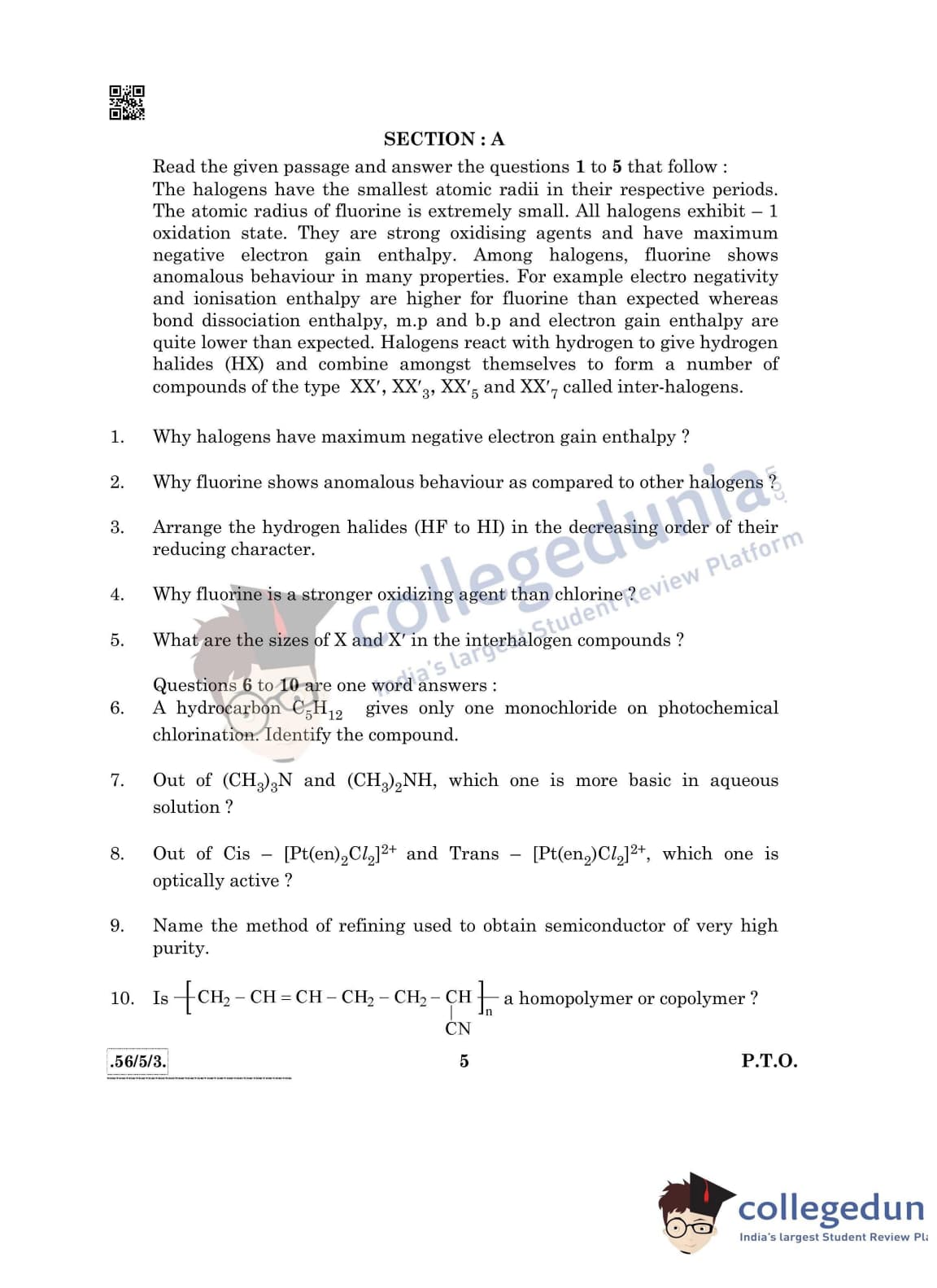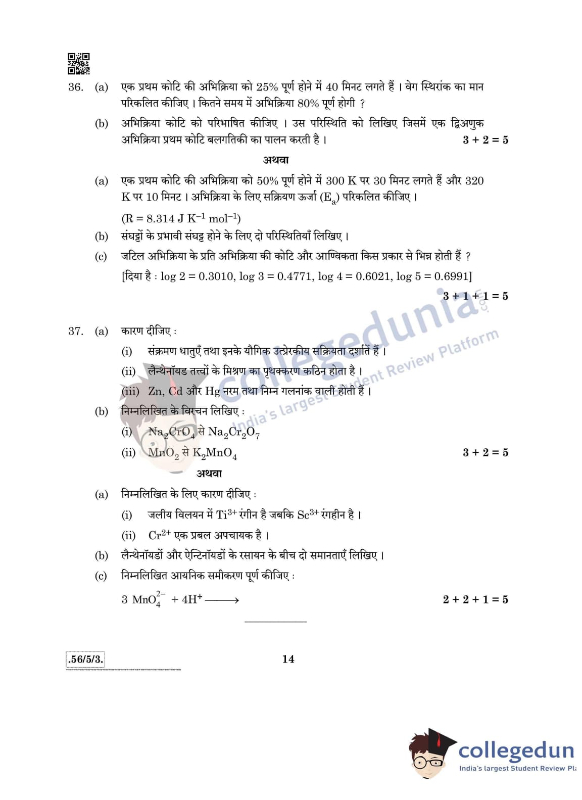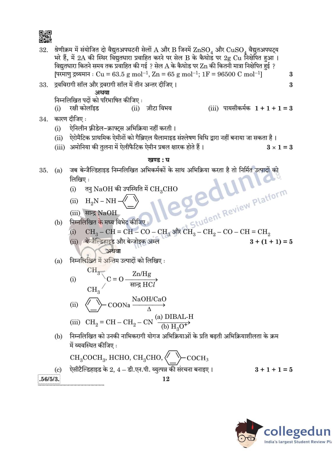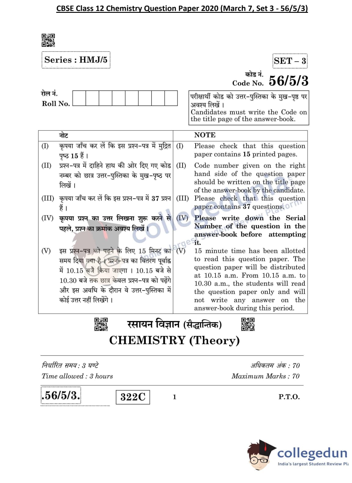CBSE Class 12 Chemistry Question Paper 2020 with Answer Key Set 3 - 56/5/3 is available for download. The exam was conducted by the Central Board of Secondary Education on March 7, 2020 in the Morning Session 10:30 AM to 1:30 PM. The medium of paper was English & Hindi. In terms of difficulty level, CBSE Class 12 Chemistry paper was of Moderate level. The question paper comprised a total of 37 questions divided among 4 sections.