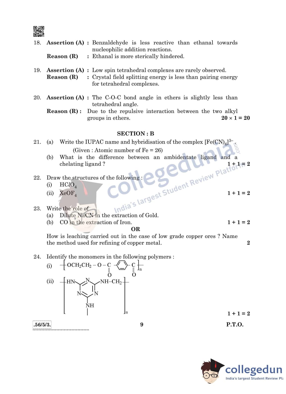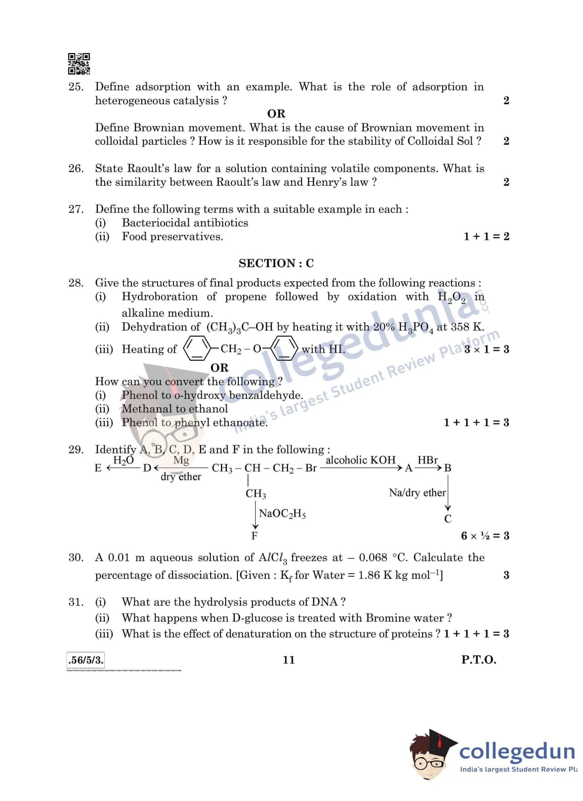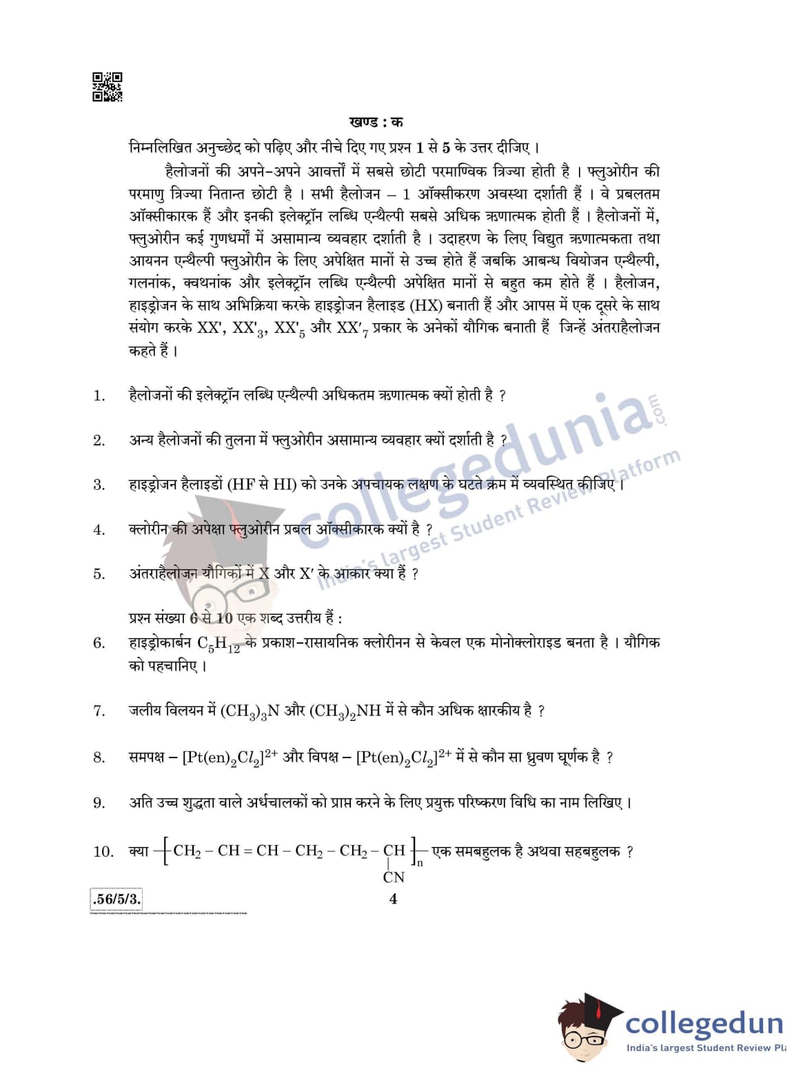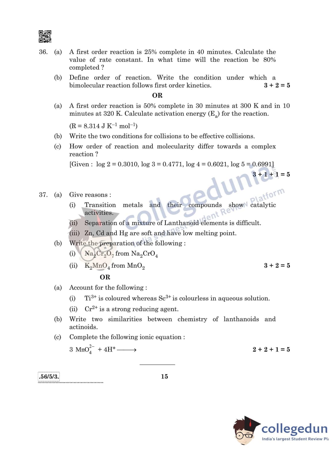 CBSE Class 12 Chemistry Question Paper 2020 with Answer Key Set 3 - 56/5/3 is available for download. The exam was conducted by the Central Board of Secondary Education on March 7, 2020 in the Morning Session 10:30 AM to 1:30 PM. The medium of paper was English & Hindi. In terms of difficulty level, CBSE Class 12 Chemistry paper was of Moderate level. The question paper comprised a total of 37 questions divided among 4 sections.