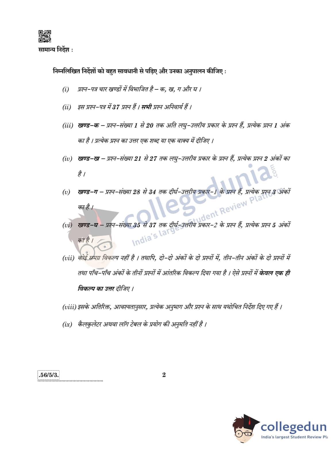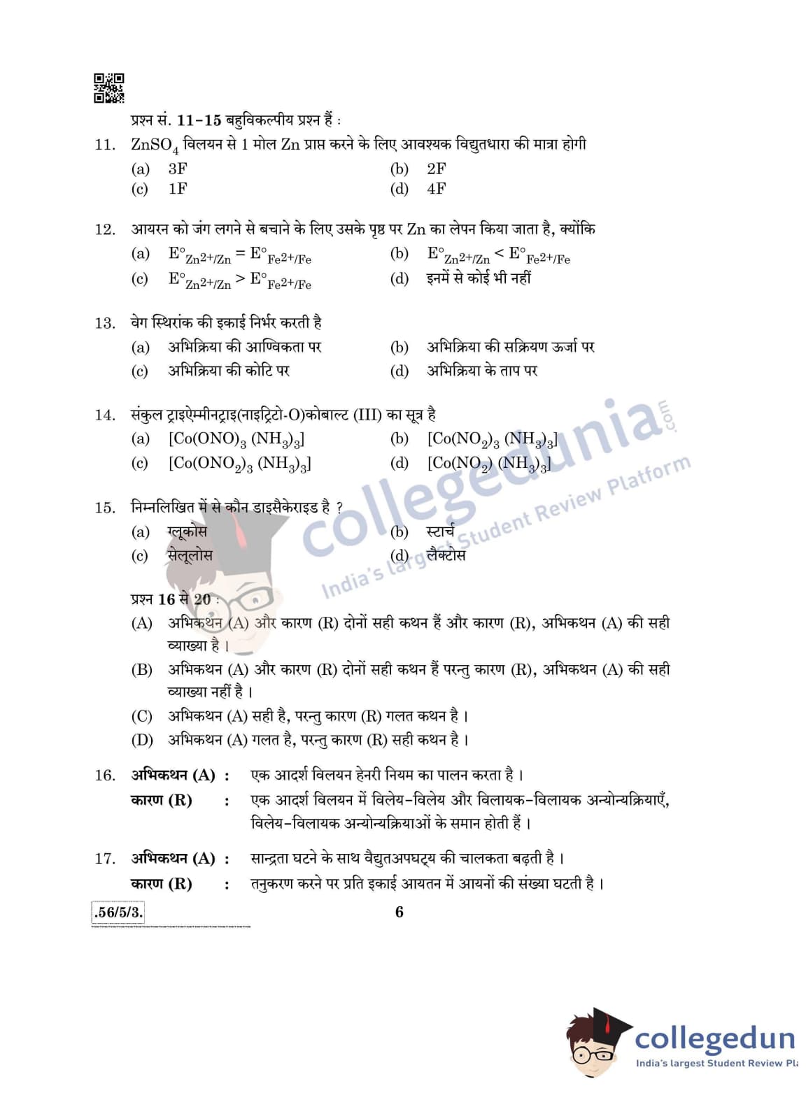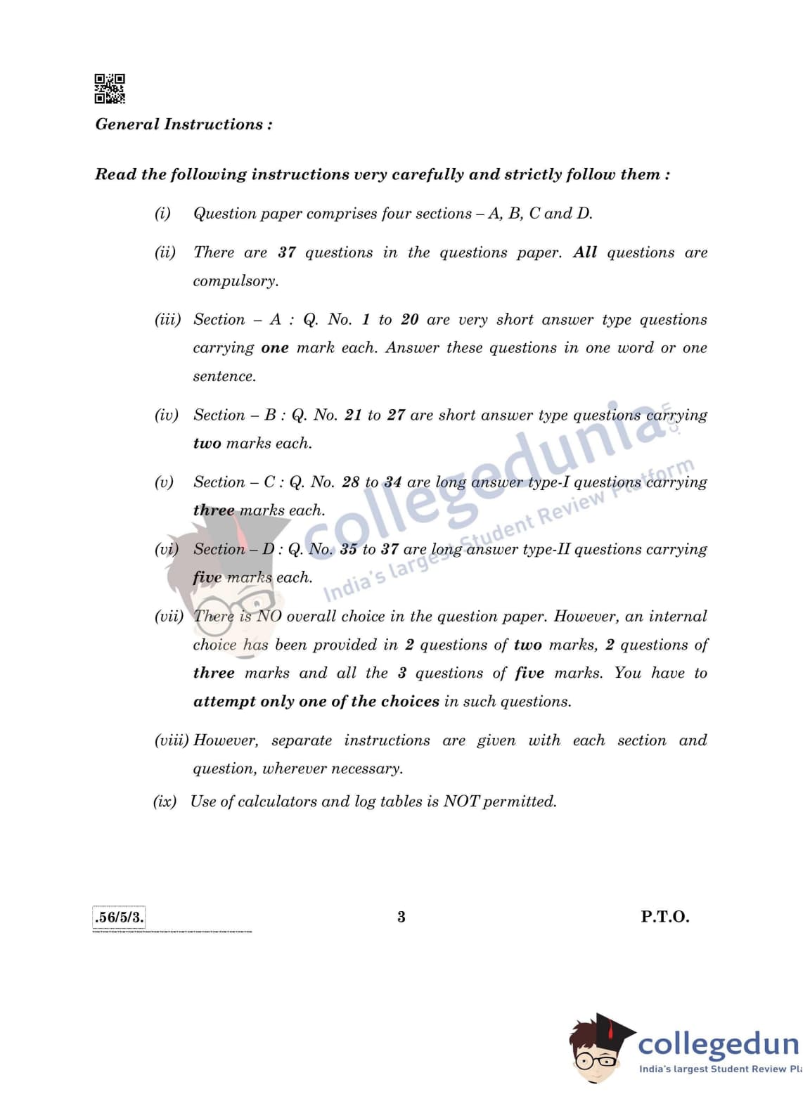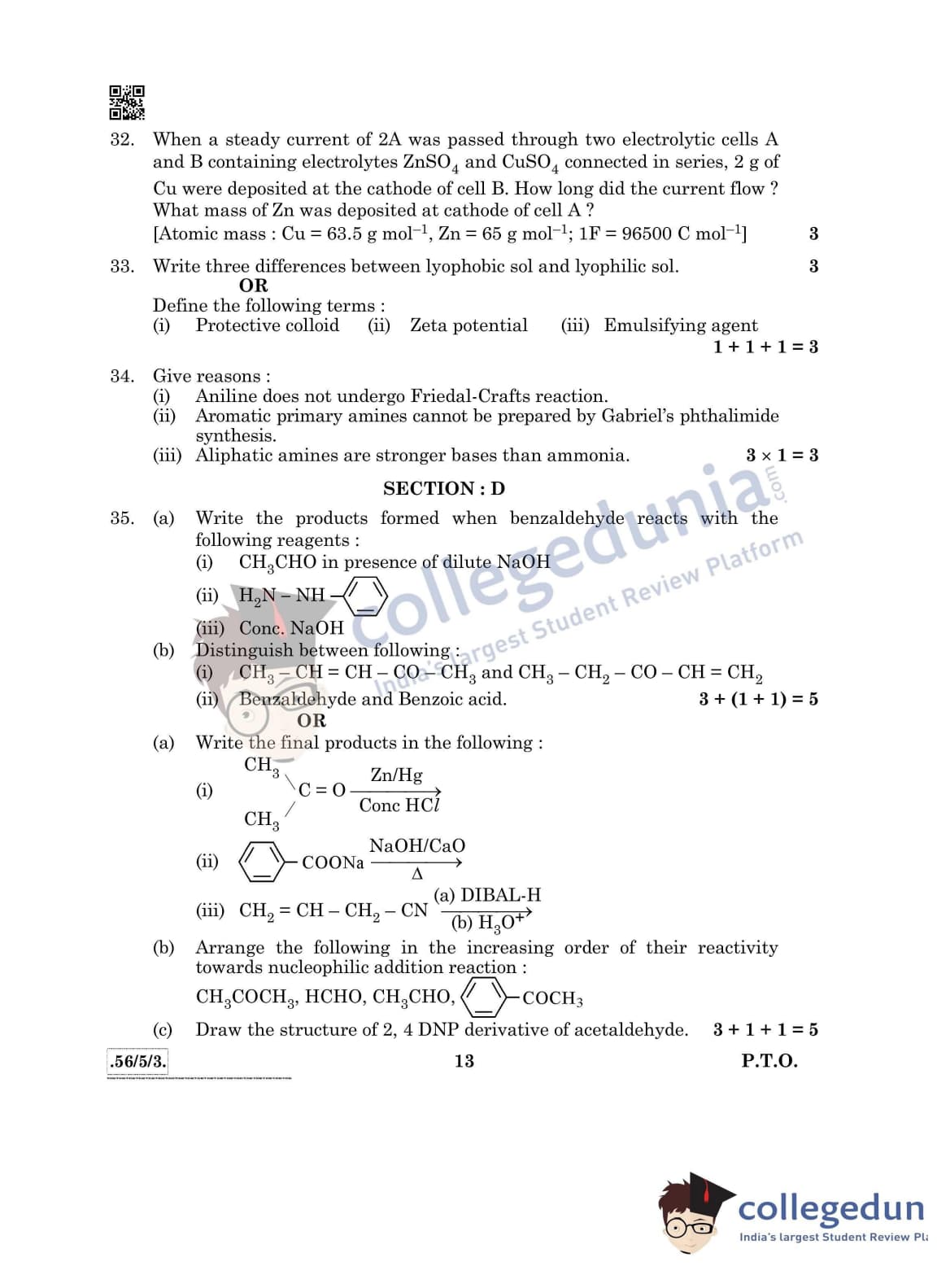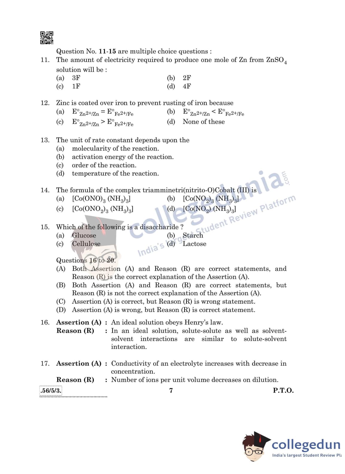 CBSE Class 12 Chemistry Question Paper 2020 with Answer Key Set 3 - 56/5/3 is available for download. The exam was conducted by the Central Board of Secondary Education on March 7, 2020 in the Morning Session 10:30 AM to 1:30 PM. The medium of paper was English & Hindi. In terms of difficulty level, CBSE Class 12 Chemistry paper was of Moderate level. The question paper comprised a total of 37 questions divided among 4 sections.