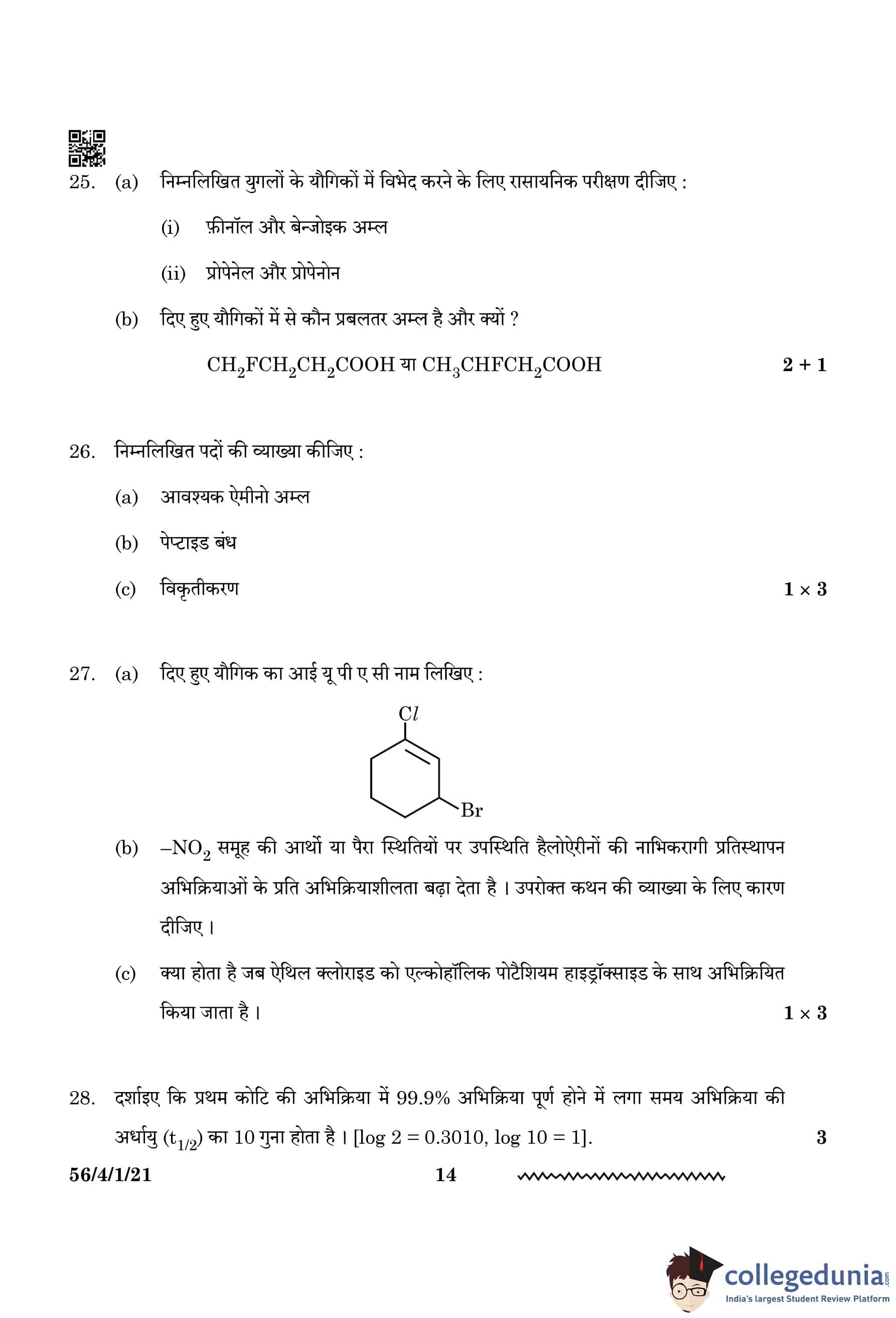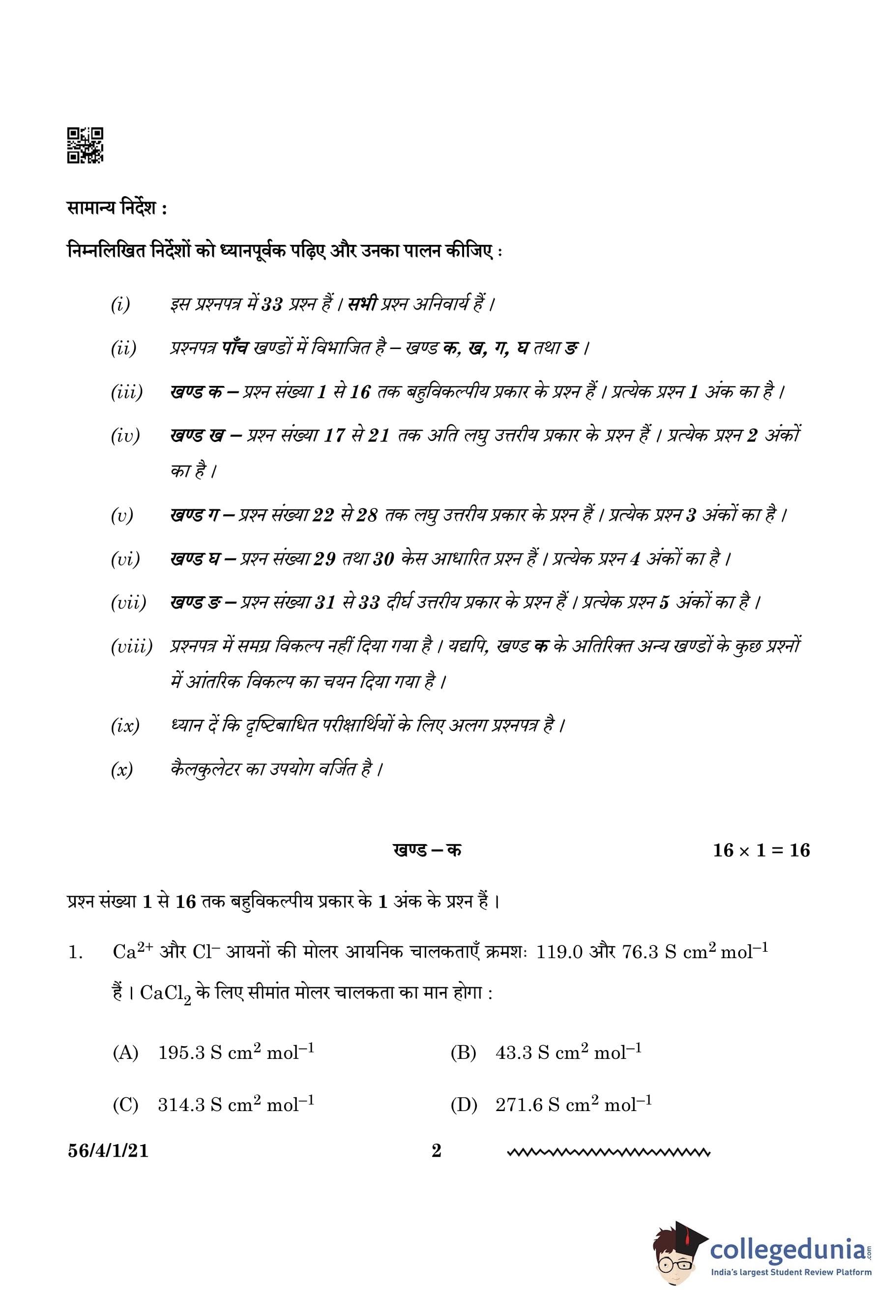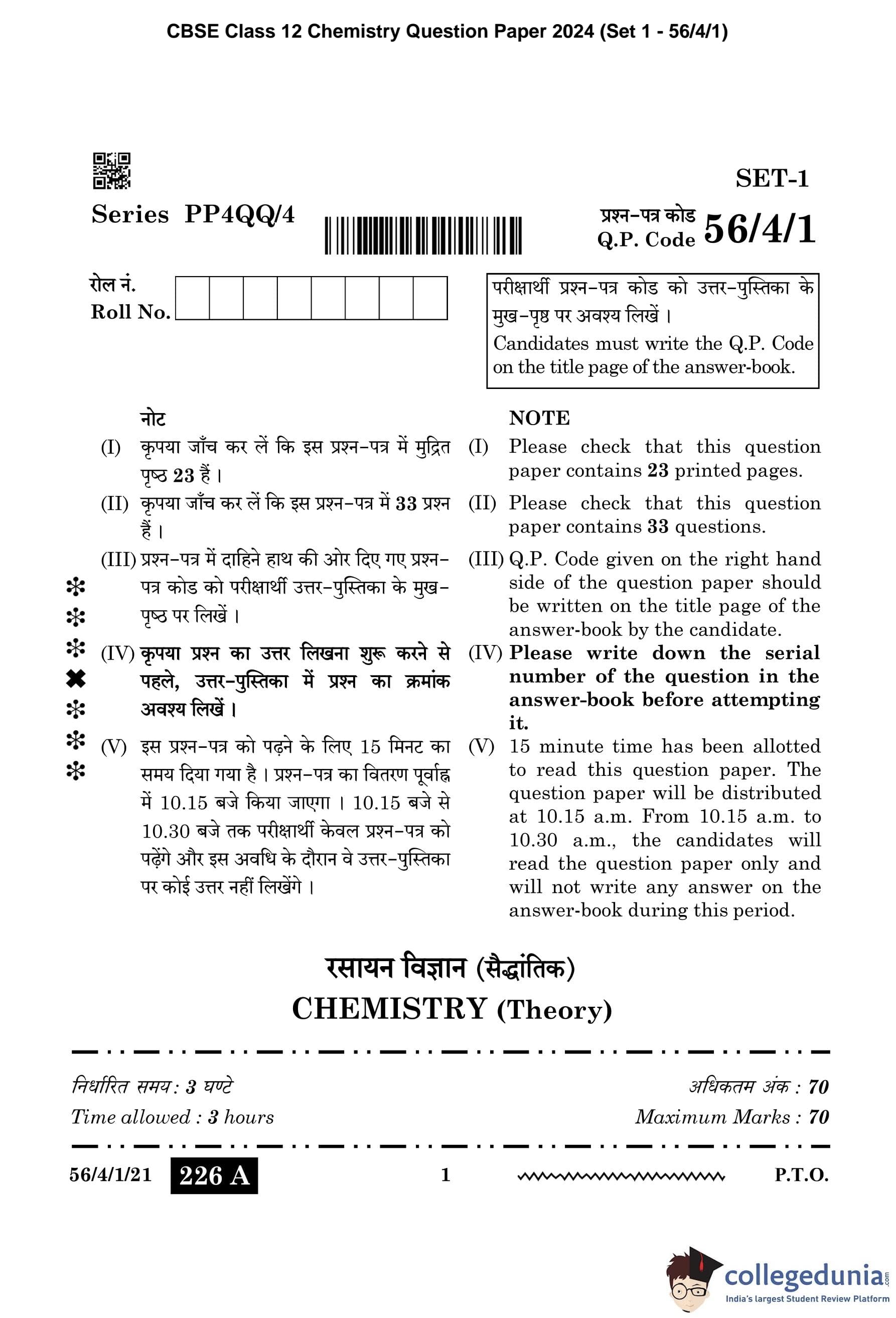 CBSE Class 12 Chemistry Question Paper 2024 PDF (Set 1 - 56/4/1) is available for download here. CBSE conducted the Chemistry exam on February 27, 2024, from 10:30 AM to 1:30 PM. The total marks for the theory paper are 70. The question paper contains 20% MCQ-based questions, 40% competency-based questions, and 40% short and long answer type questions.