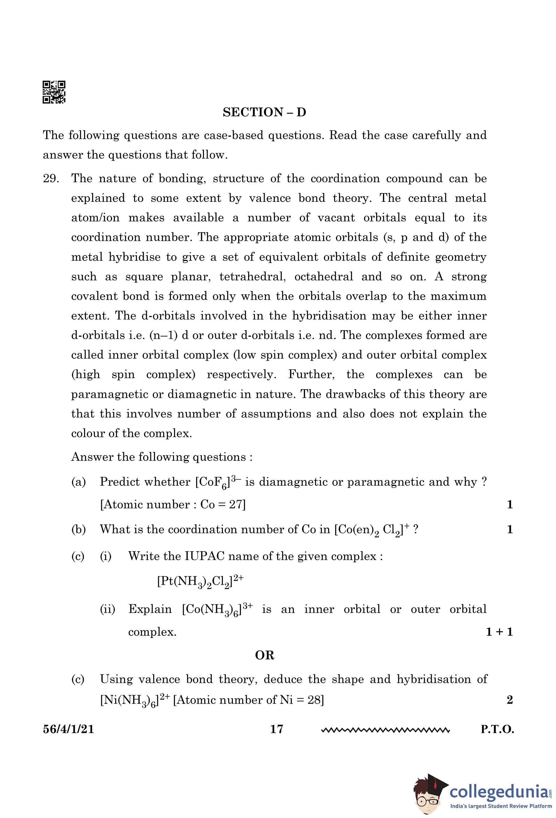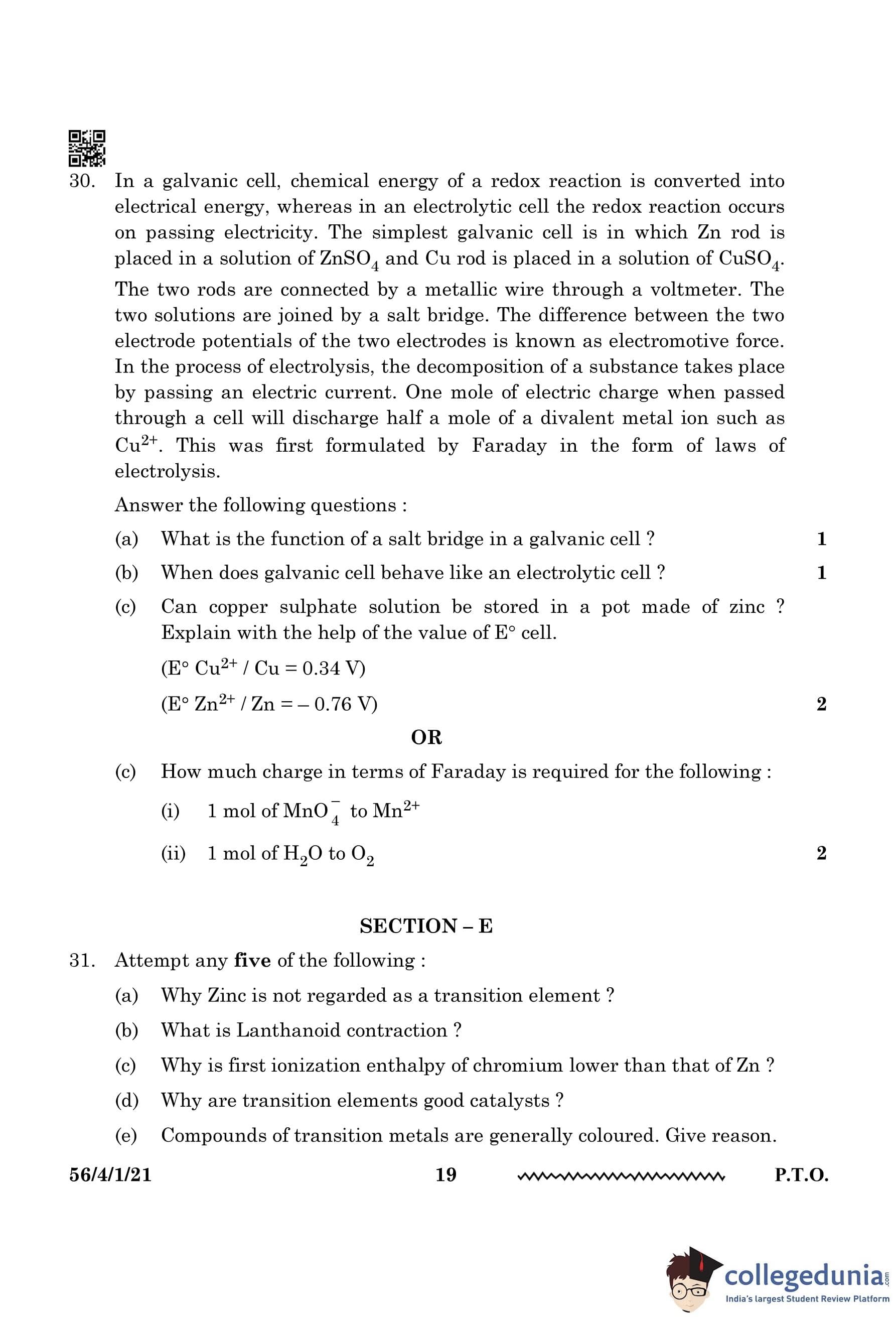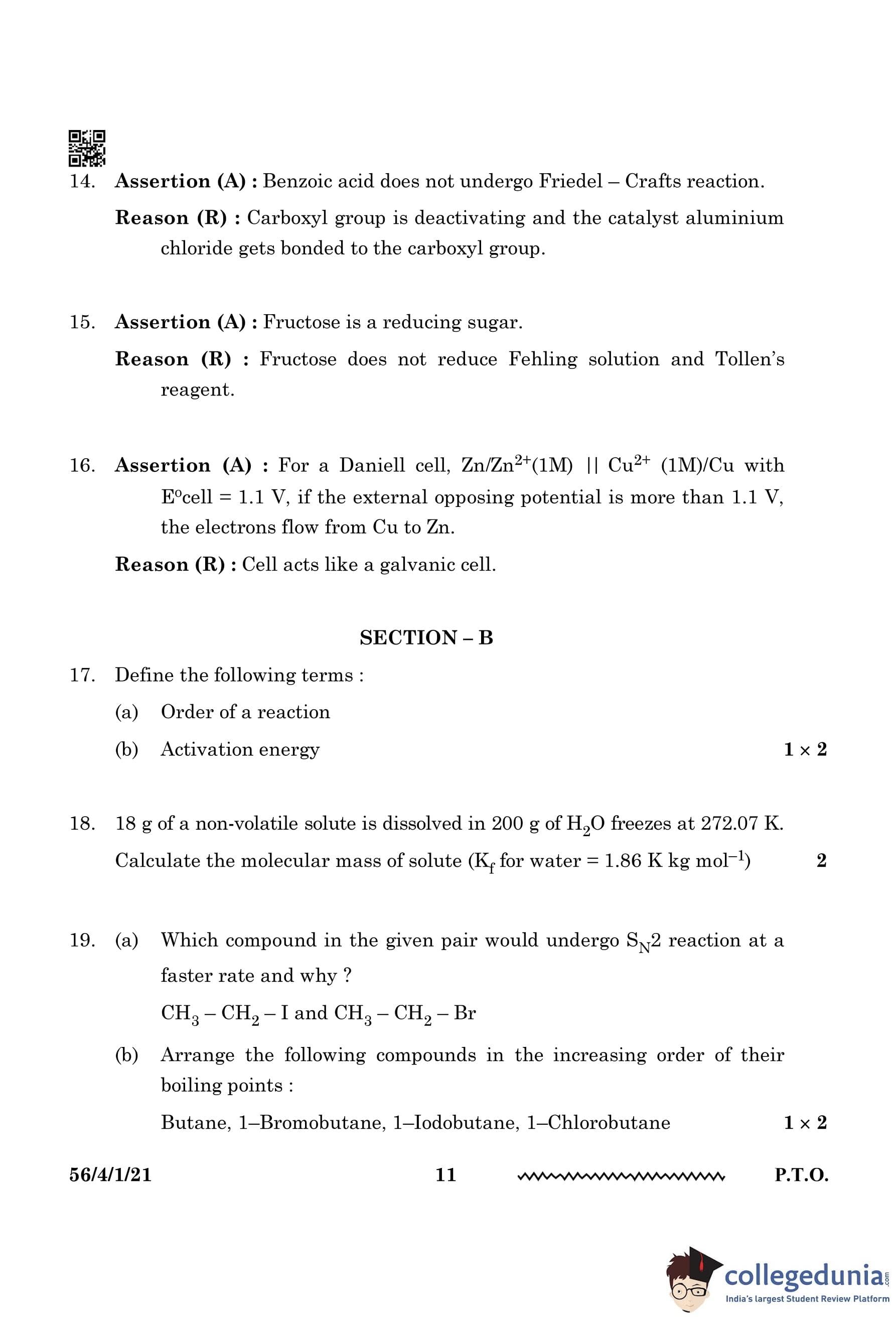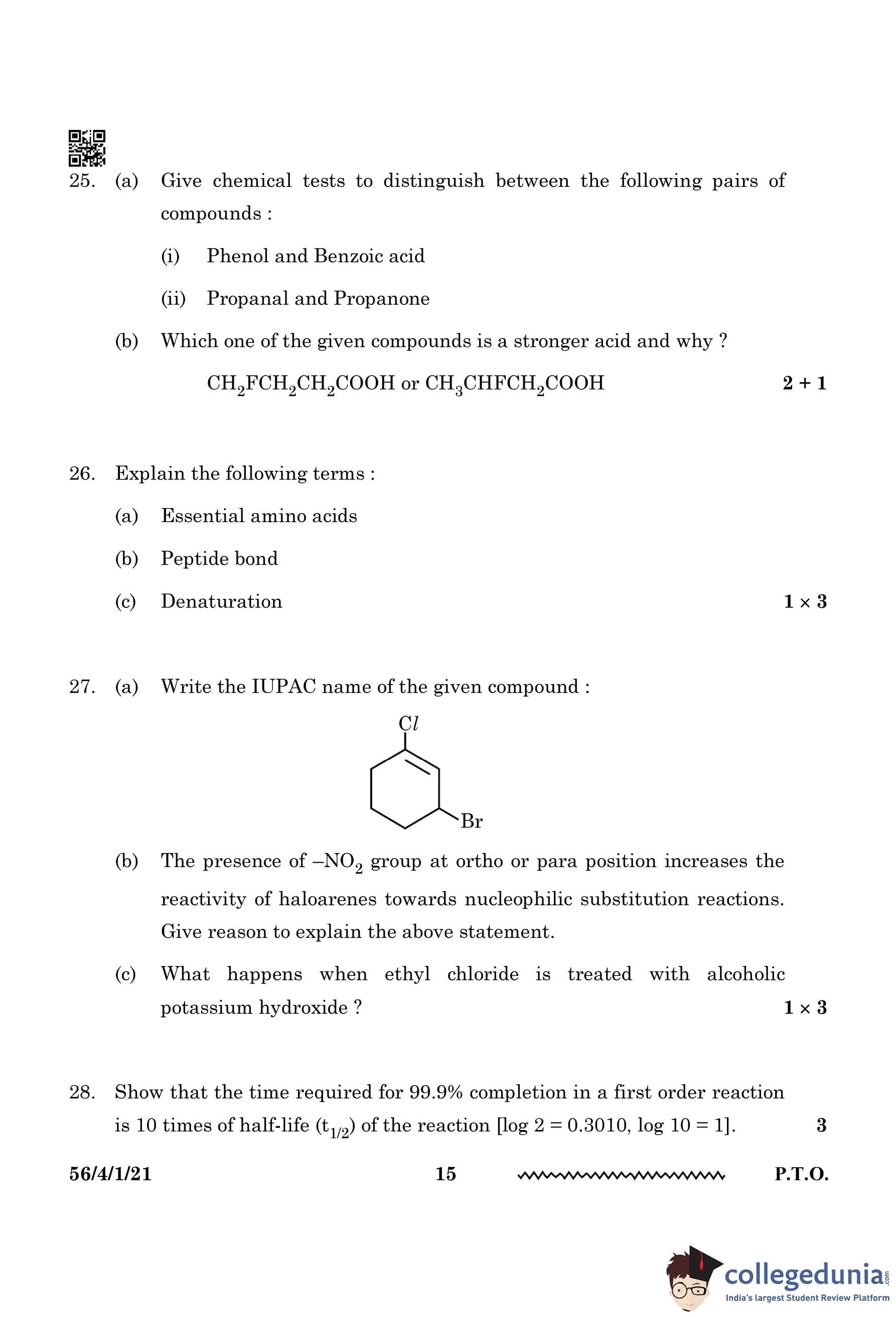 CBSE Class 12 Chemistry Question Paper 2024 PDF (Set 1 - 56/4/1) is available for download here. CBSE conducted the Chemistry exam on February 27, 2024, from 10:30 AM to 1:30 PM. The total marks for the theory paper are 70. The question paper contains 20% MCQ-based questions, 40% competency-based questions, and 40% short and long answer type questions.