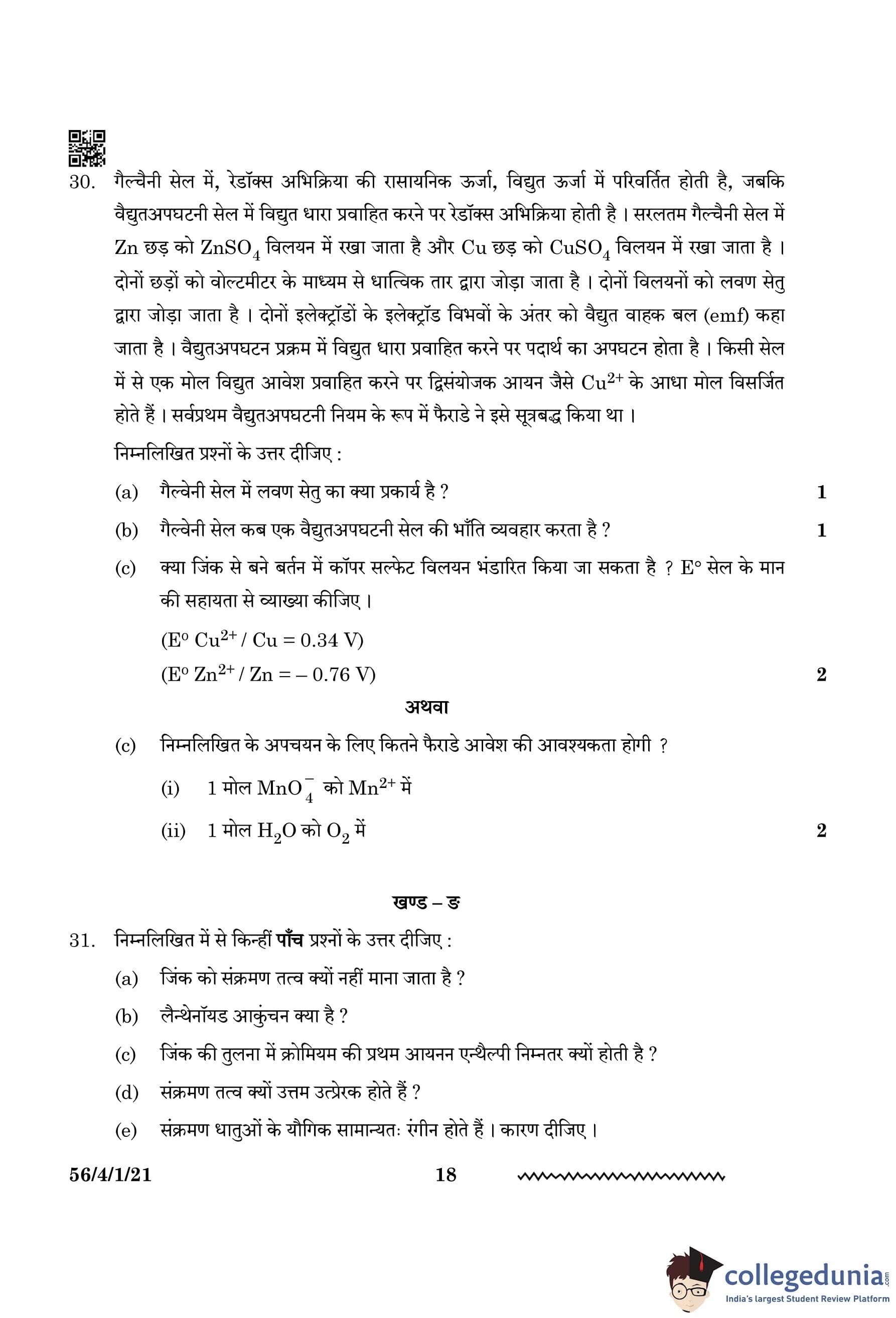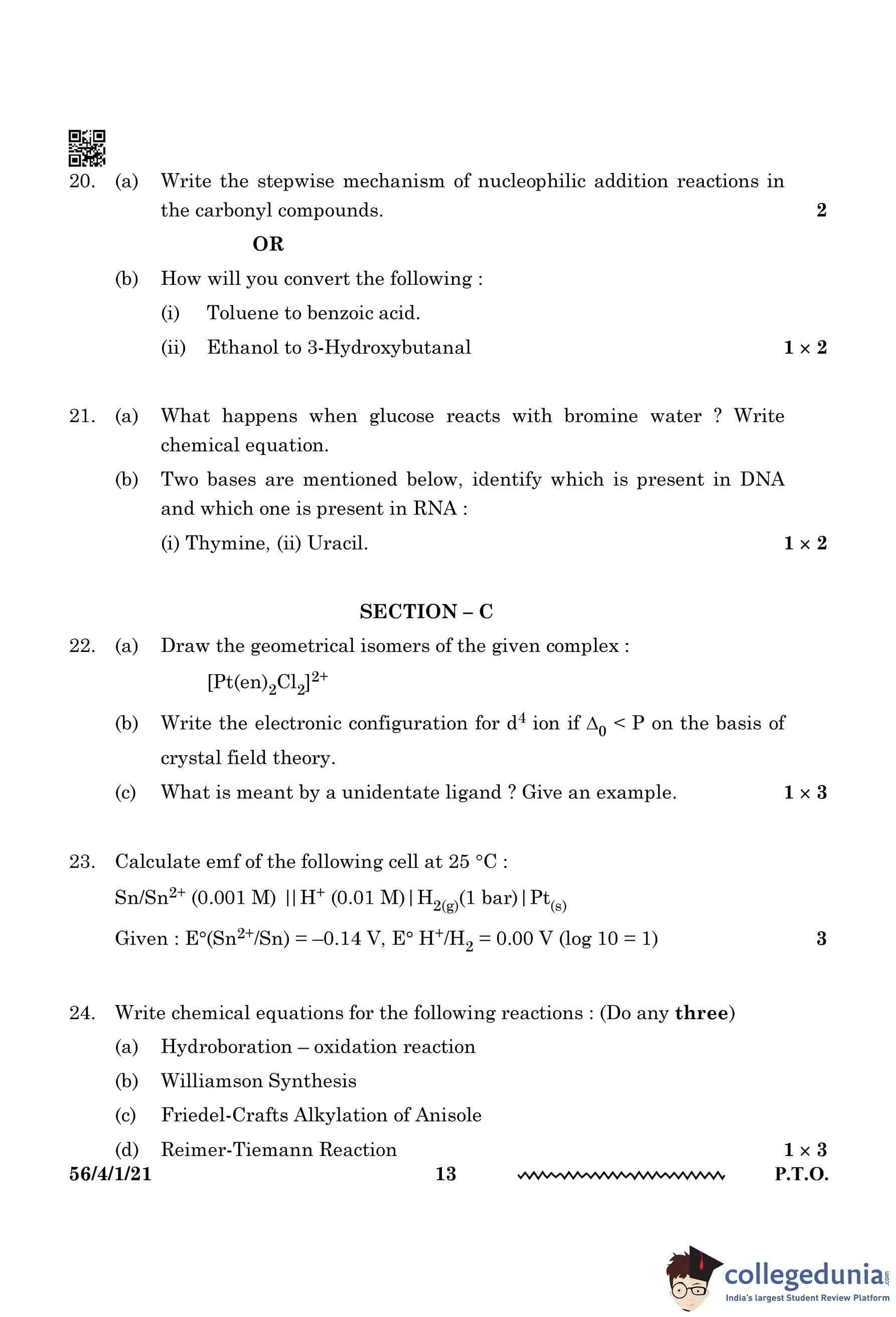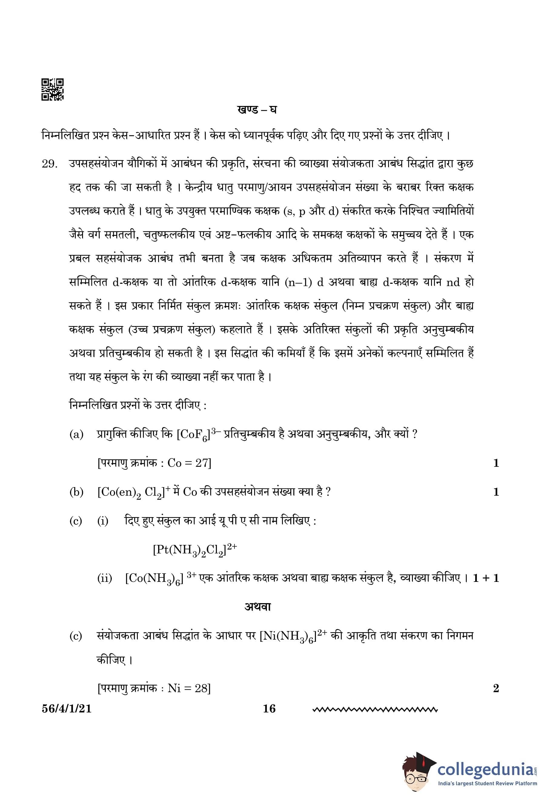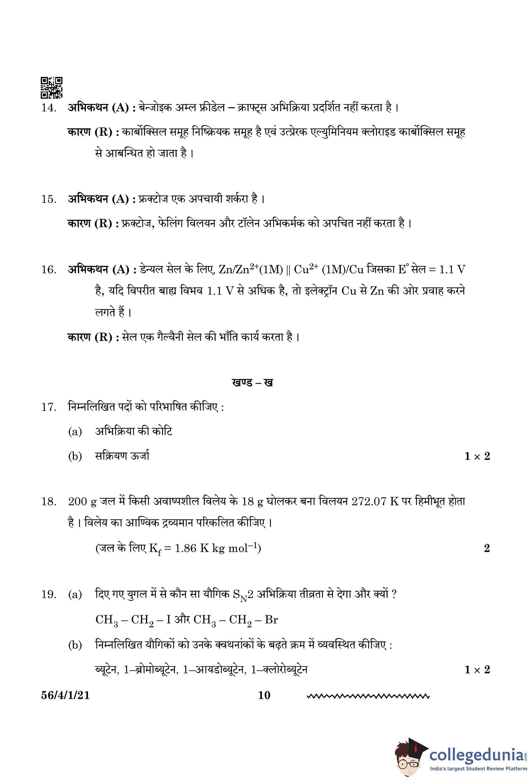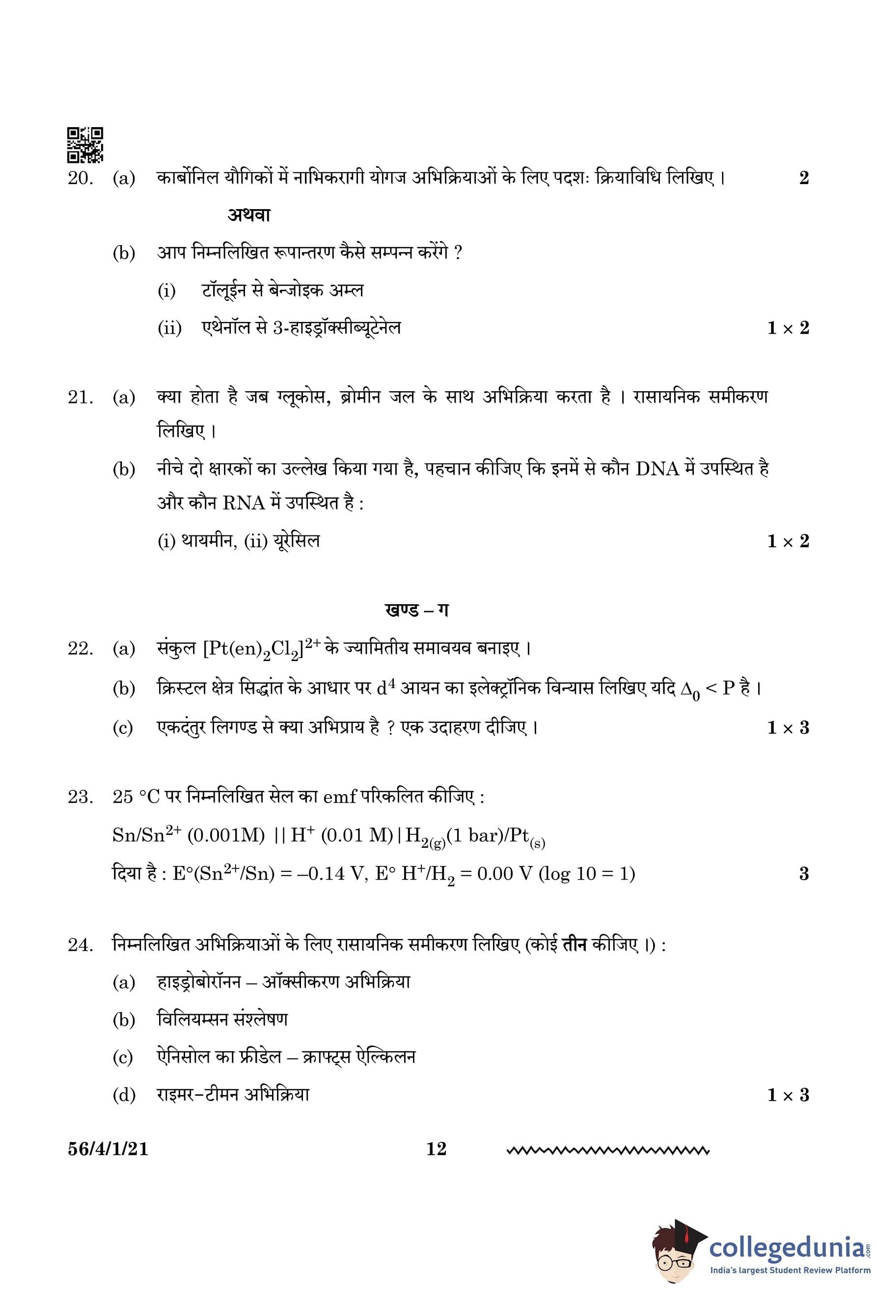 CBSE Class 12 Chemistry Question Paper 2024 (Set 1 - 56/4/1) with Answer Key