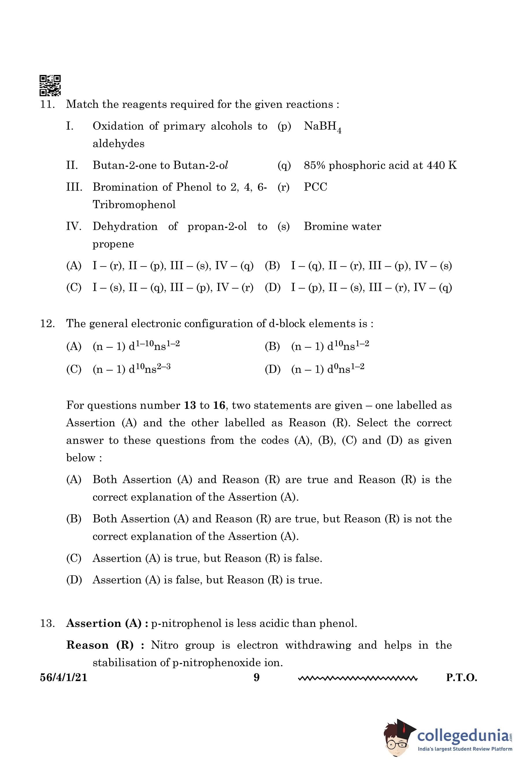 - Dehydration of propan-2-ol leads to propene when treated with 85% phosphoric acid at 440 K Quick Tip: For oxidation reactions, NaBH\(_4\) is commonly used, and for reduction reactions, phosphoric acid is often the reagent.
