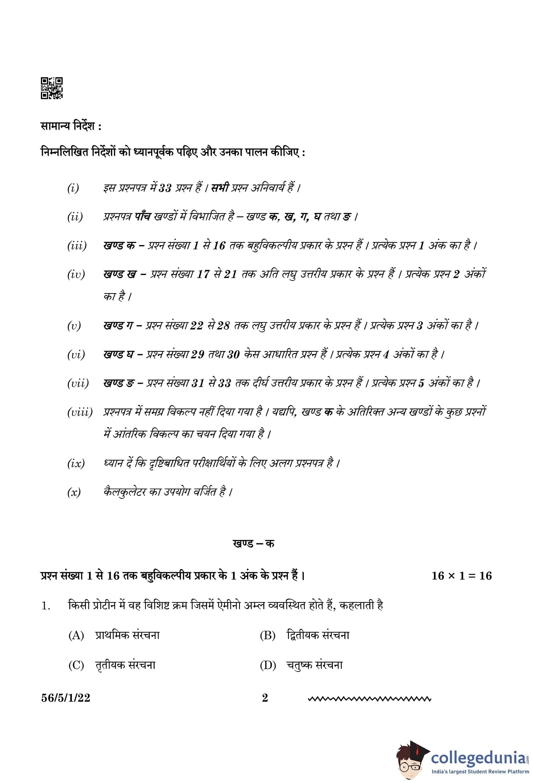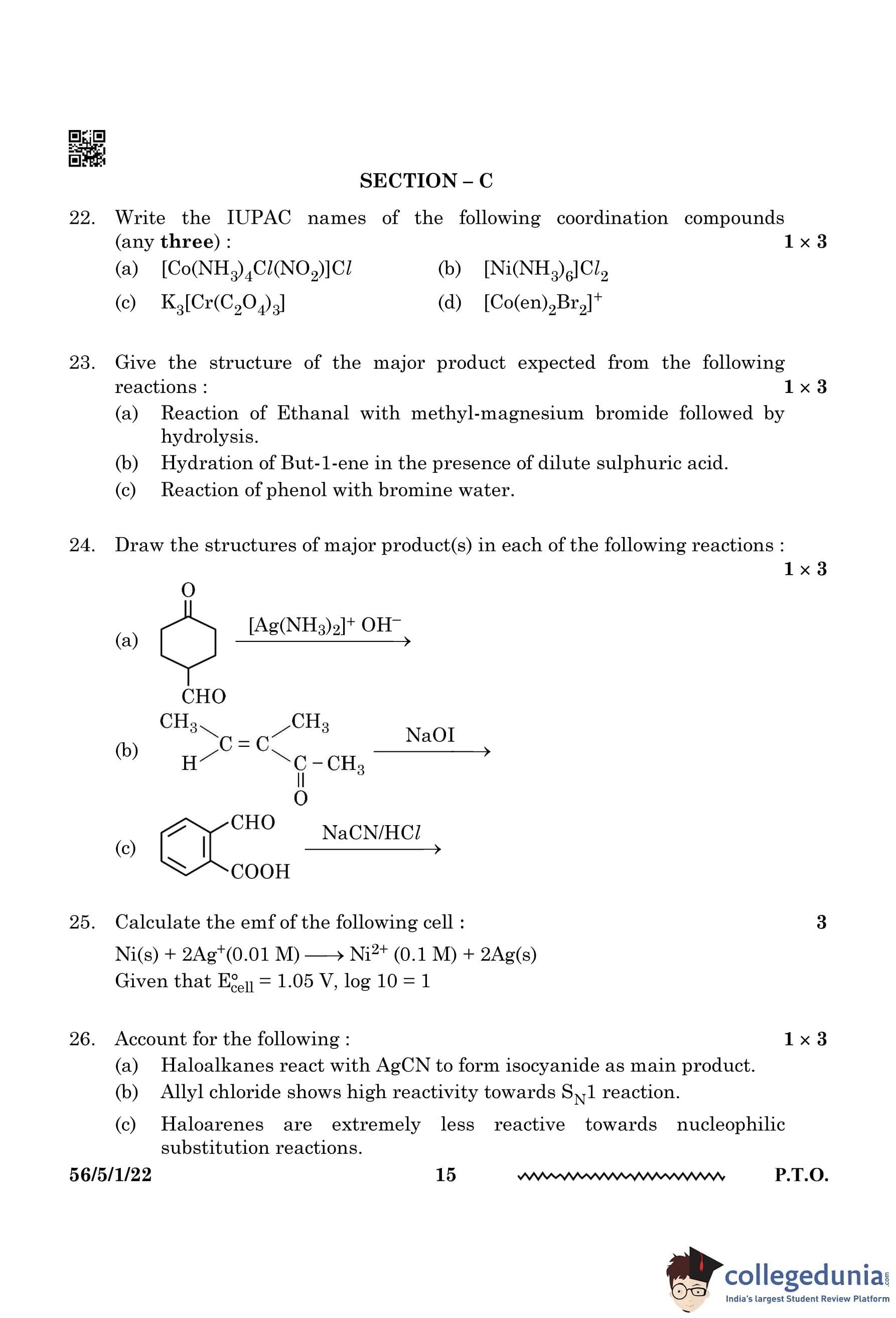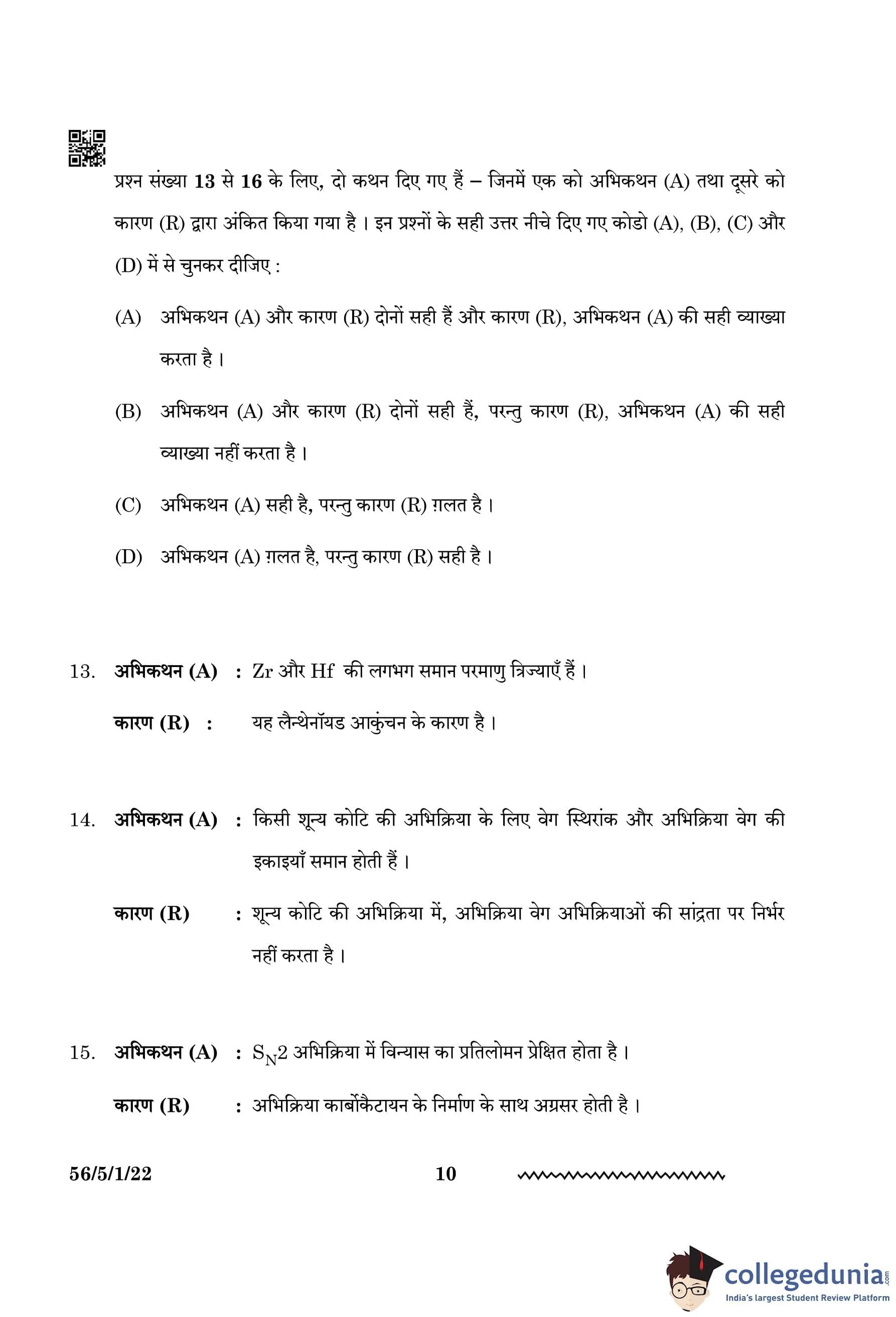 CBSE Class 12 Chemistry Question Paper 2024 PDF (Set 1 - 56/5/1) is available for download here. CBSE conducted the Chemistry exam on February 27, 2024, from 10:30 AM to 1:30 PM. The total marks for the theory paper are 70. The question paper contains 20% MCQ-based questions, 40% competency-based questions, and 40% short and long answer type questions.
