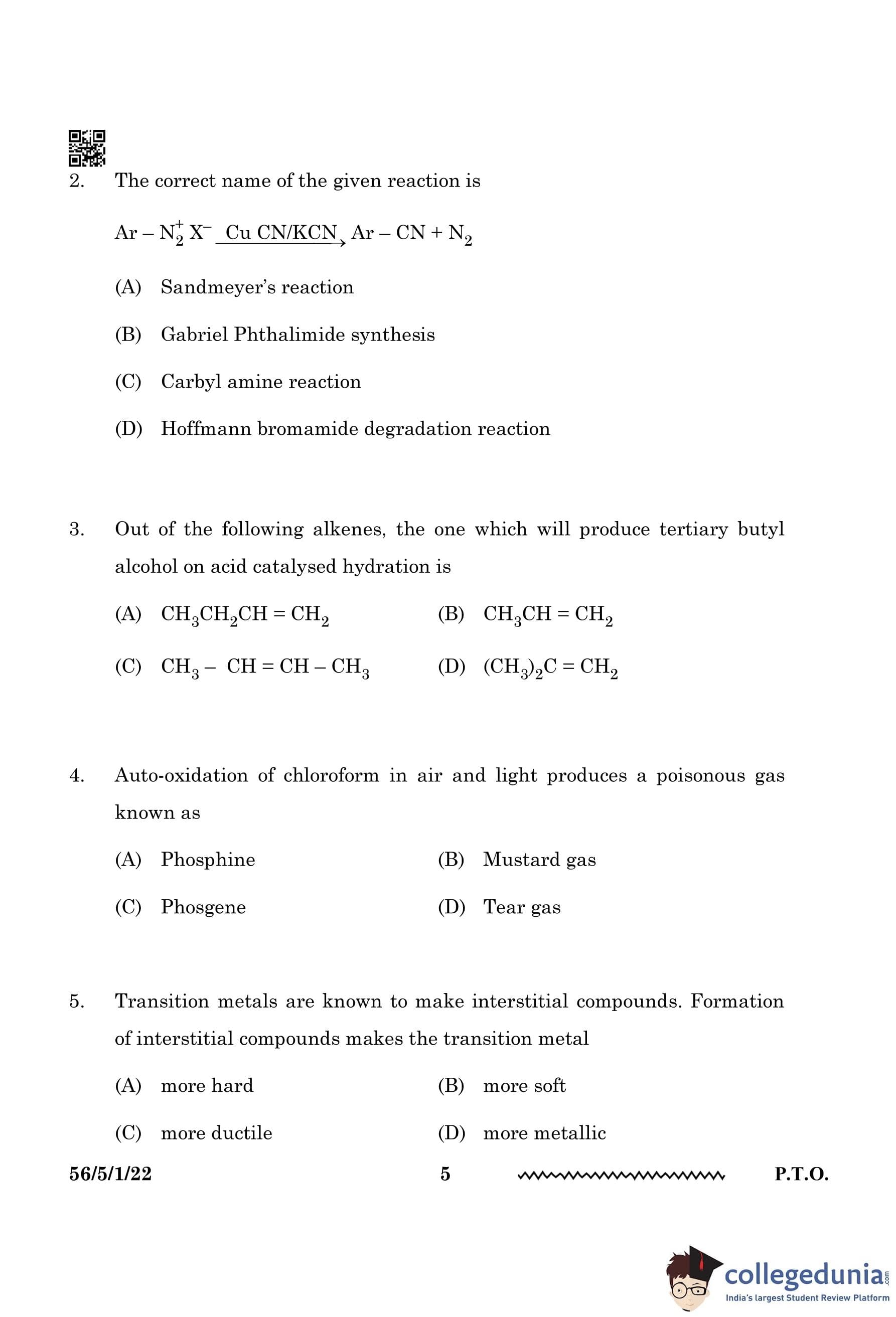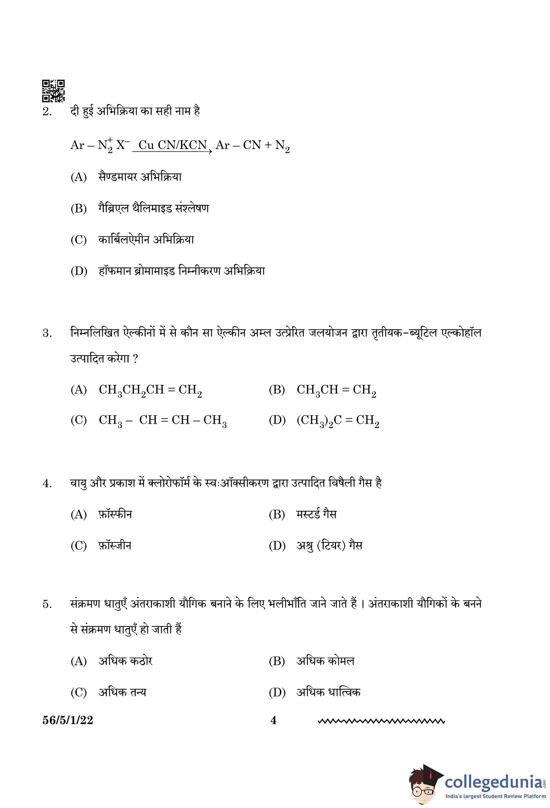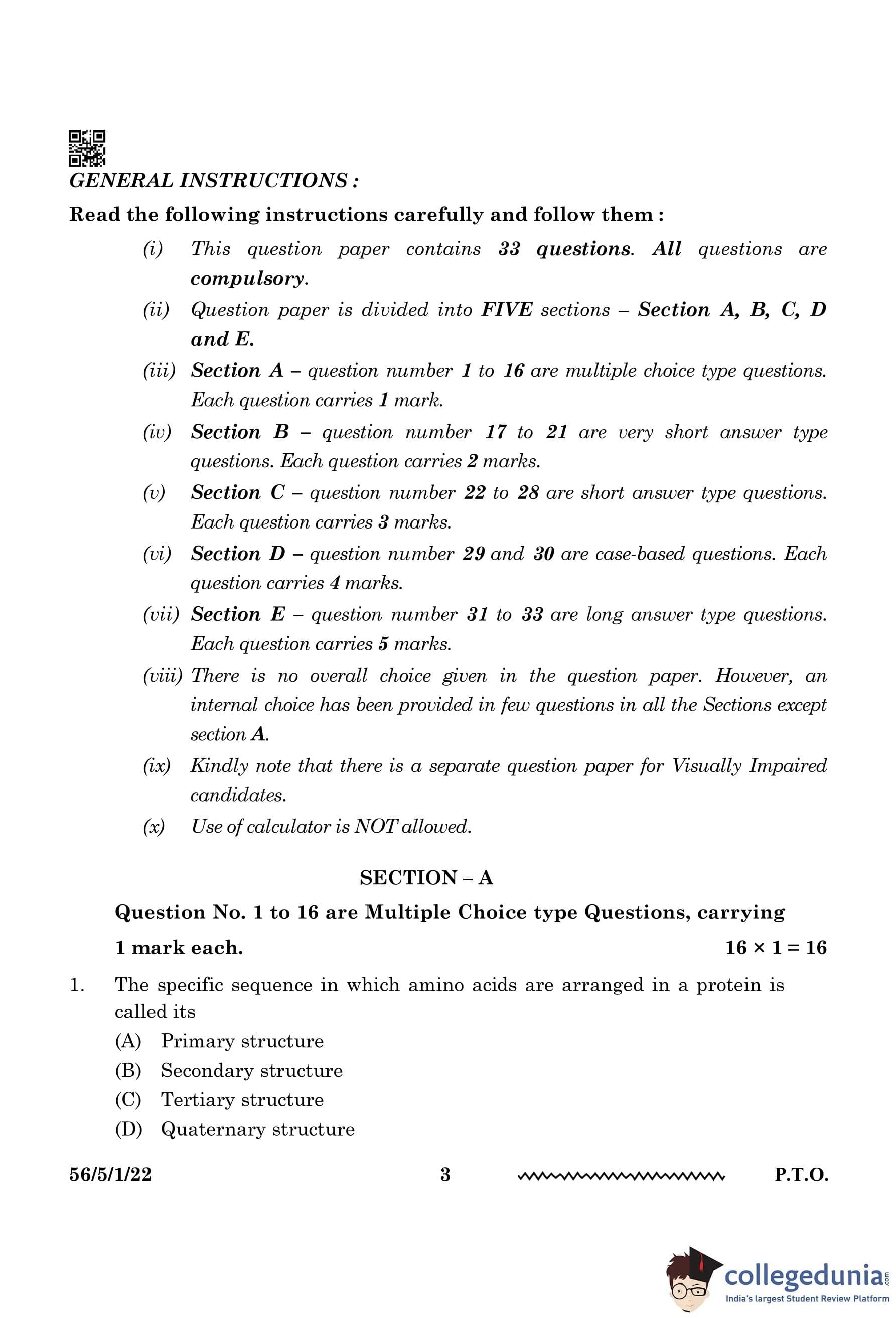 CBSE Class 12 Chemistry Question Paper 2024 PDF (Set 1 - 56/5/1) is available for download here. CBSE conducted the Chemistry exam on February 27, 2024, from 10:30 AM to 1:30 PM. The total marks for the theory paper are 70. The question paper contains 20% MCQ-based questions, 40% competency-based questions, and 40% short and long answer type questions.