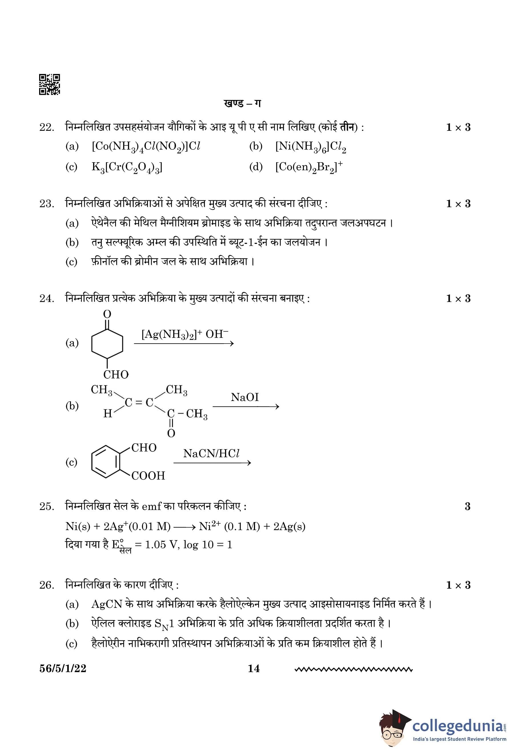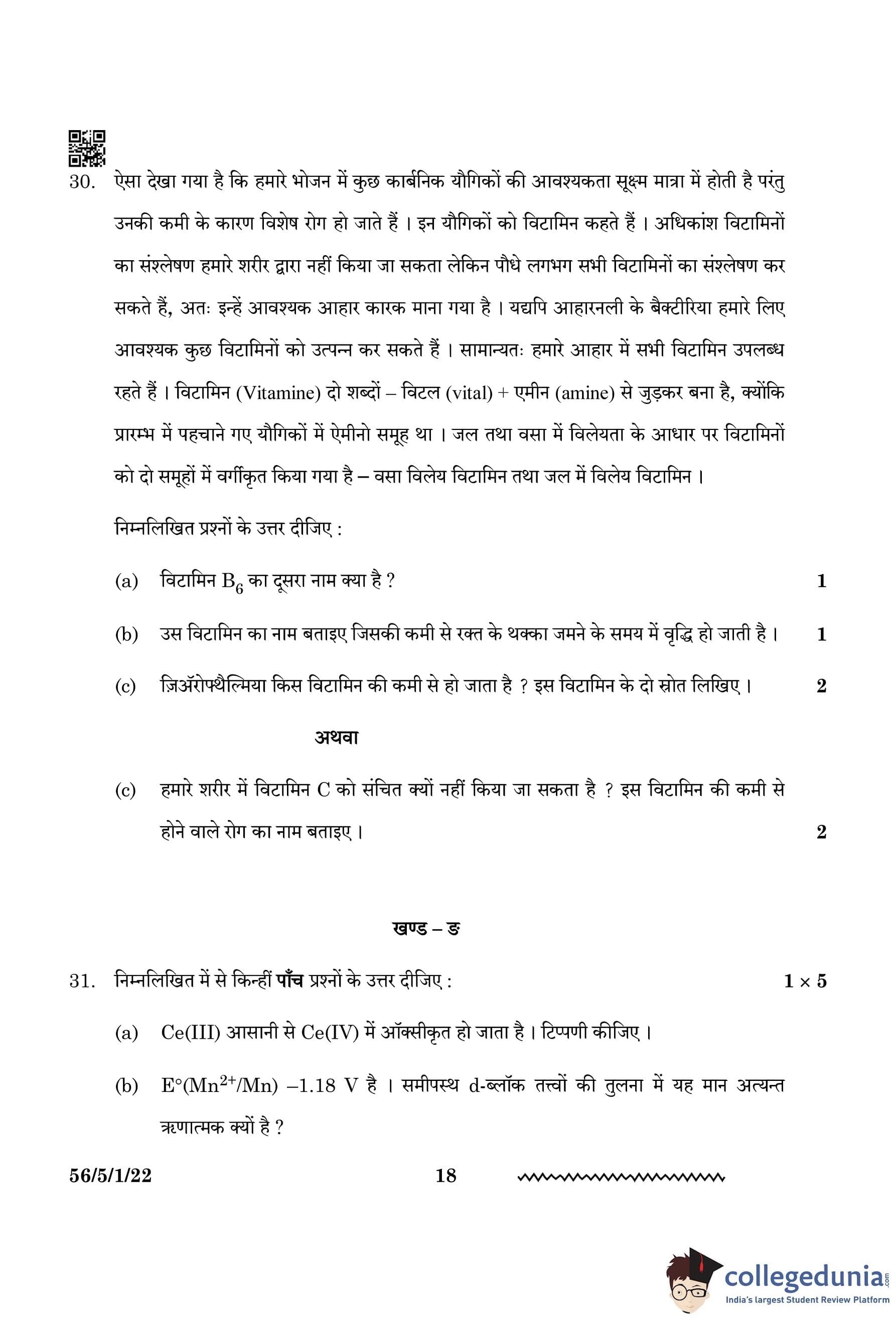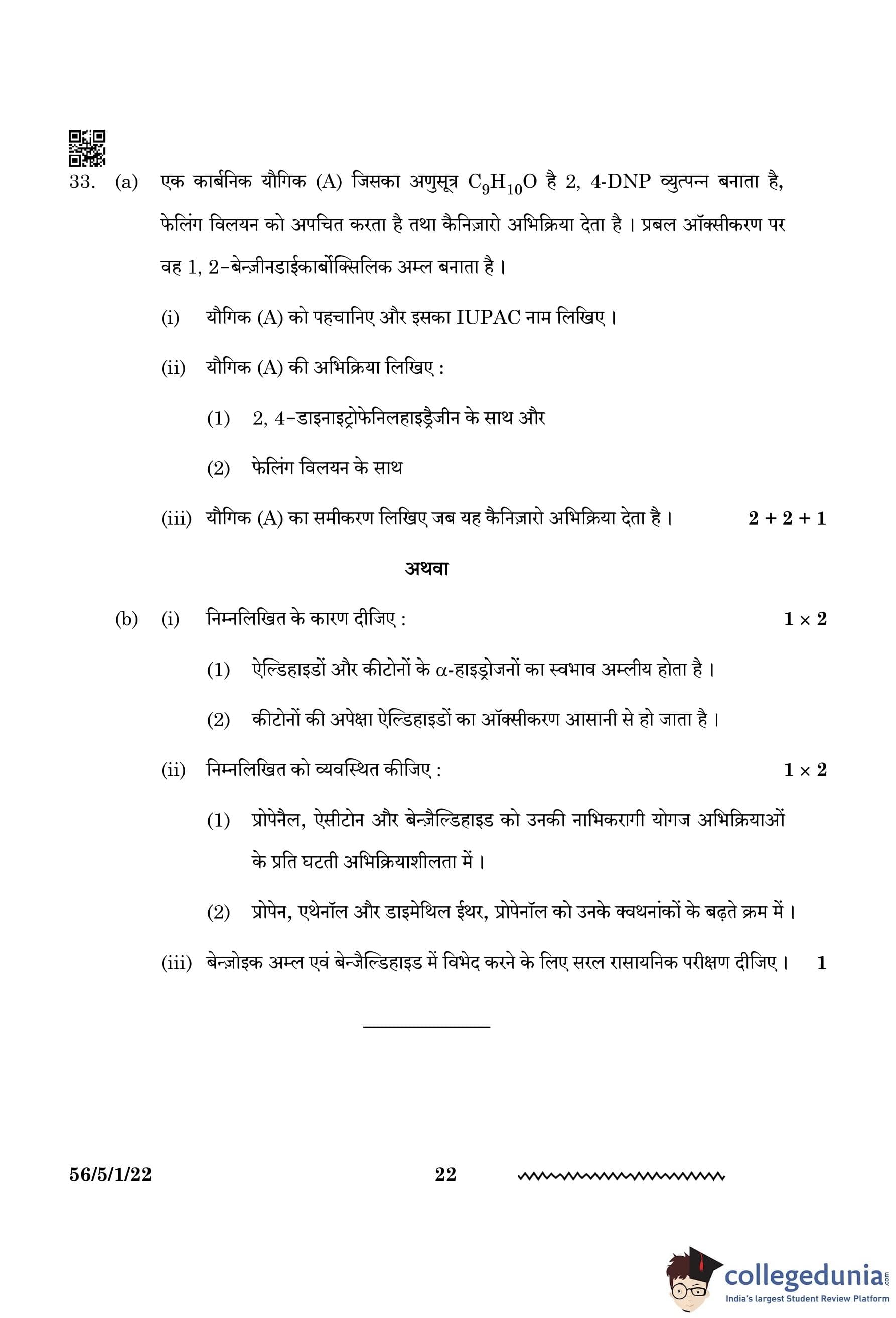 CBSE Class 12 Chemistry Question Paper 2024 (Set 1 - 56/5/1) with Answer Key