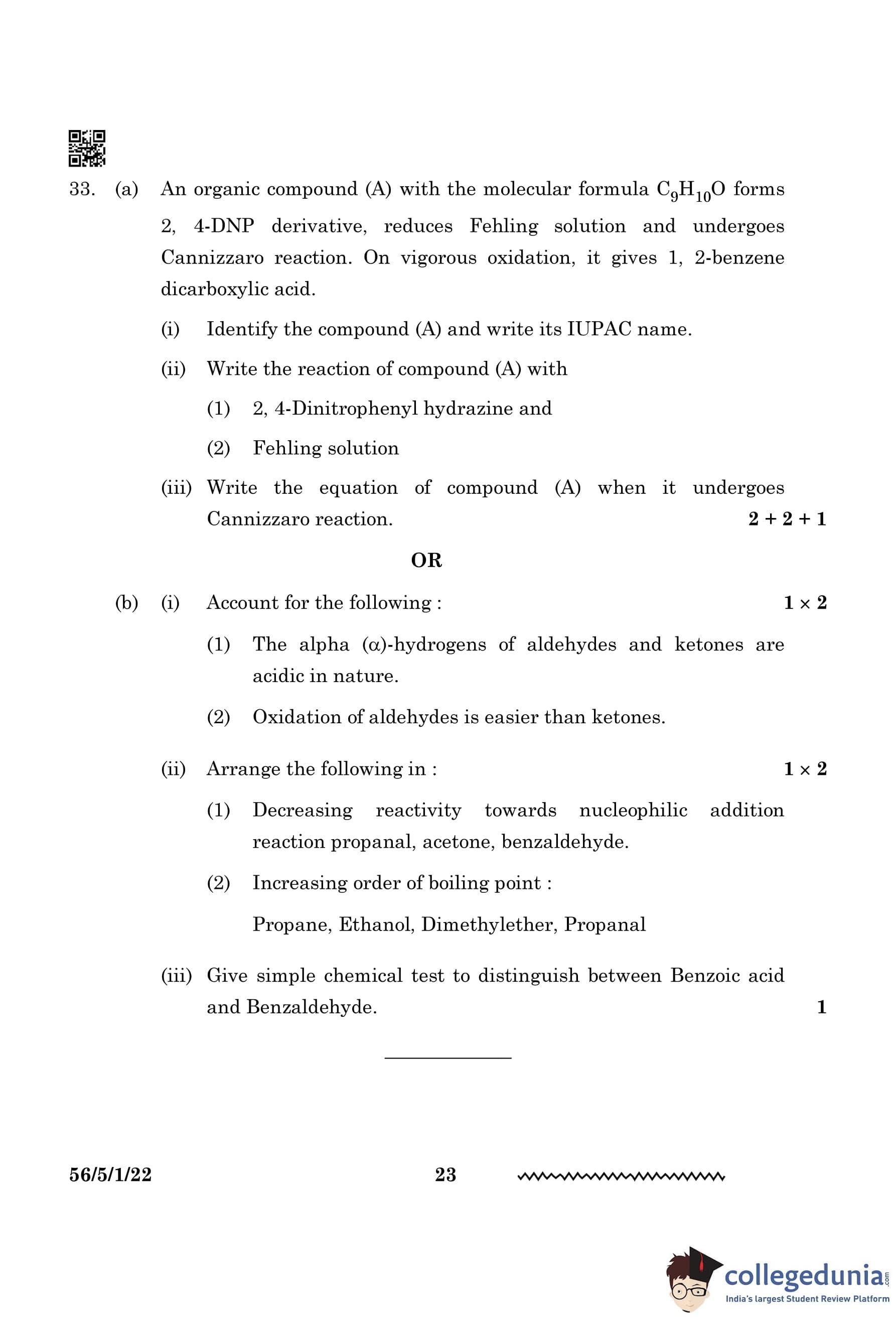 (a) An organic compound (A) with the molecular formula \( C_9H_{10}O \) forms 2, 4-DNP derivative, reduces Fehling solution and undergoes Cannizzaro reaction. On vigorous oxidation, it gives 1, 2-benzene dicarboxylic acid.