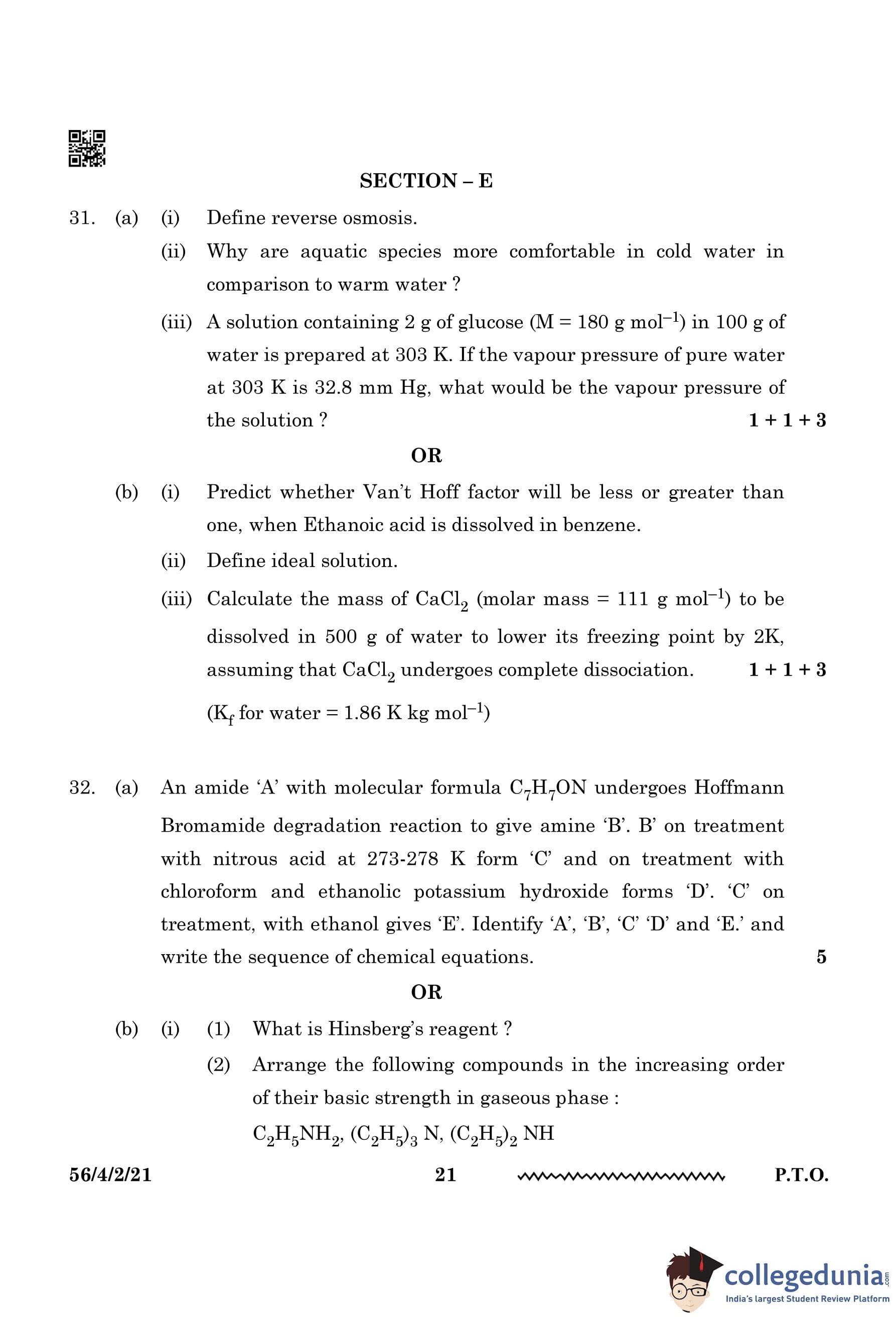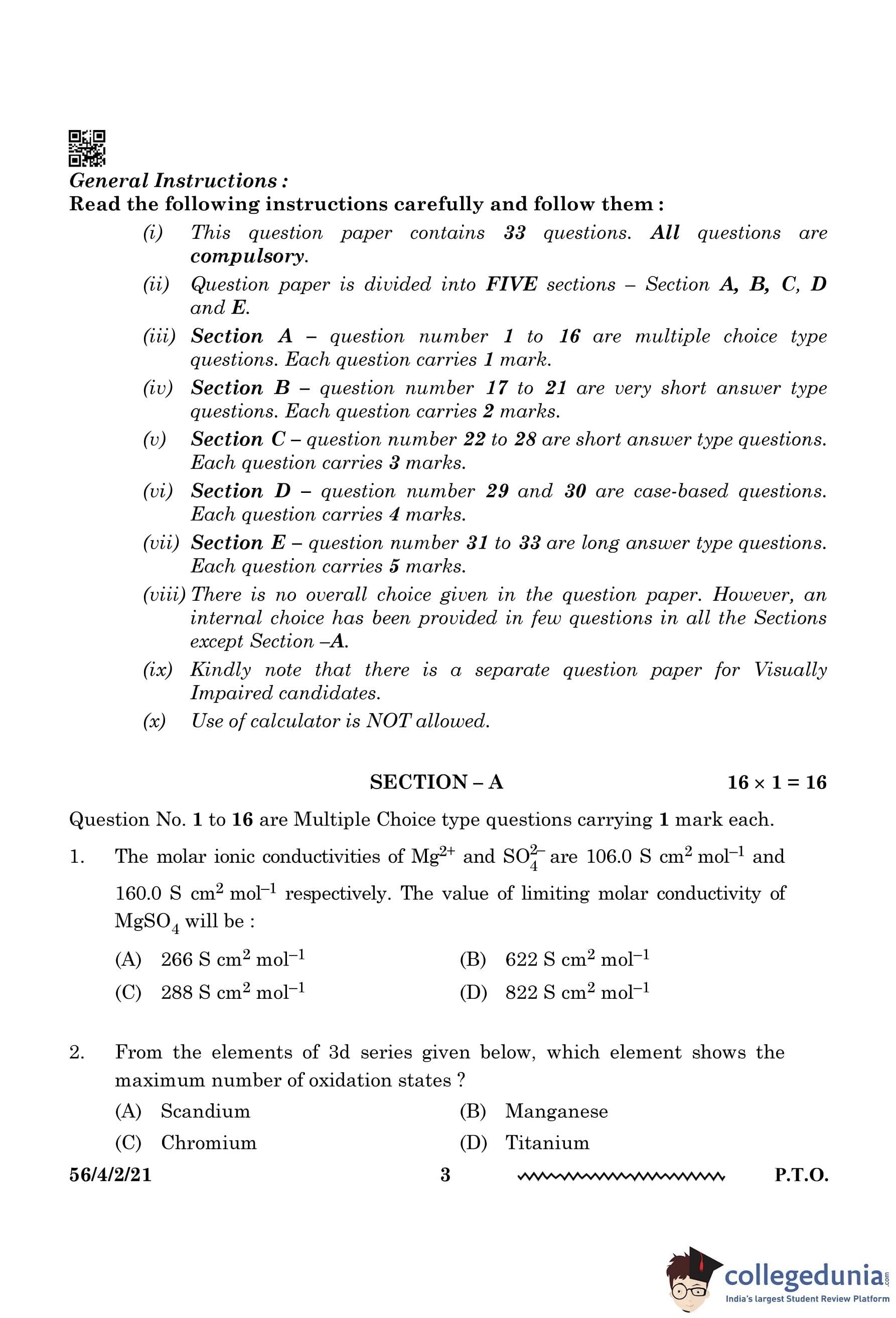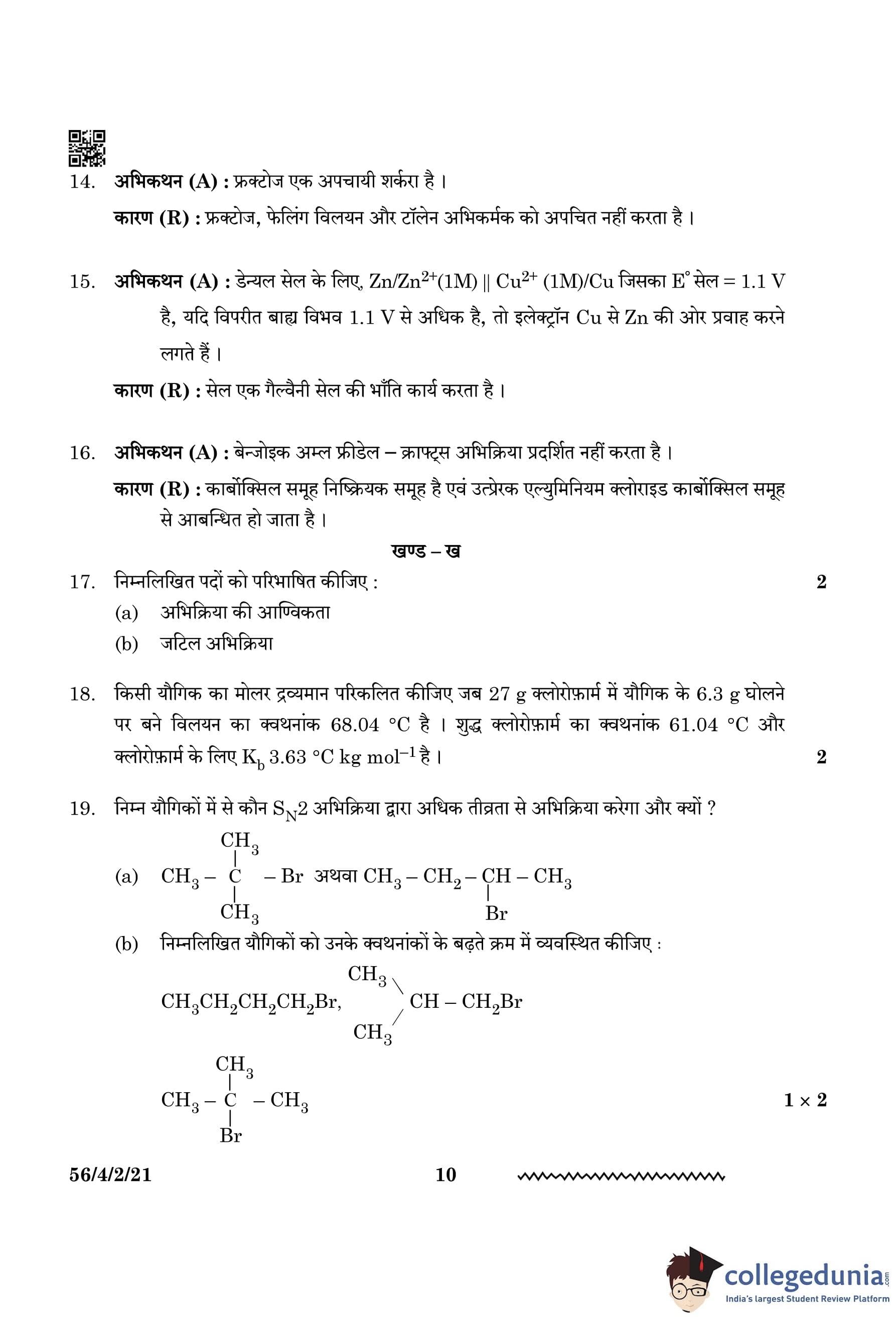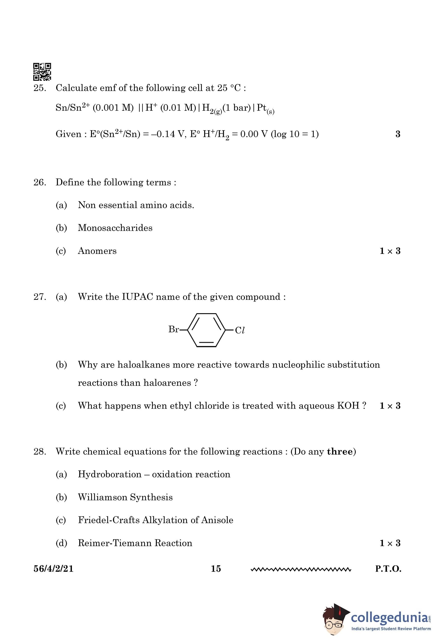 CBSE Class 12 Chemistry Question Paper 2024 PDF (Set 2 - 56/4/2) is available for download here. CBSE conducted the Chemistry exam on February 27, 2024, from 10:30 AM to 1:30 PM. The total marks for the theory paper are 70. The question paper contains 20% MCQ-based questions, 40% competency-based questions, and 40% short and long answer type questions.
