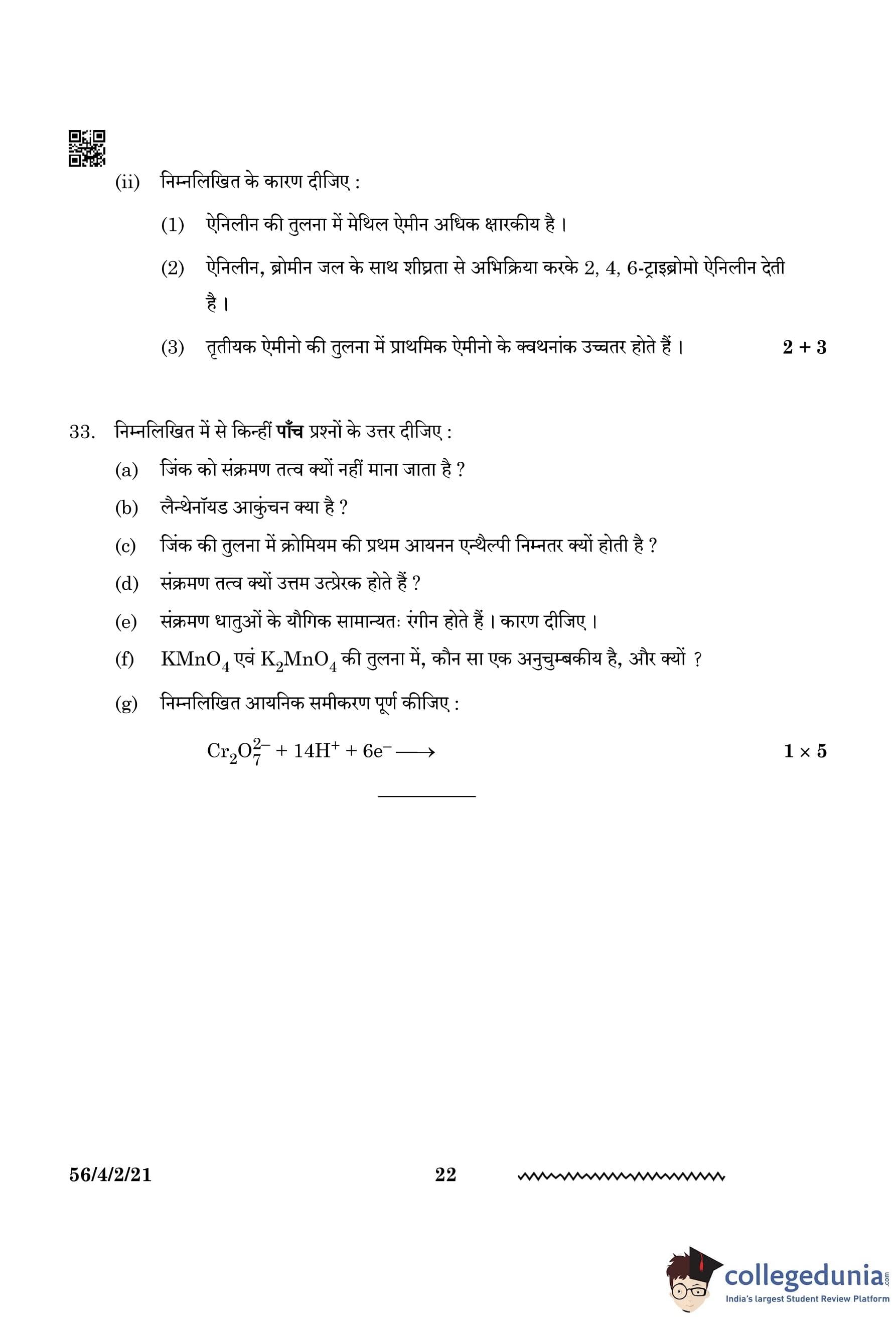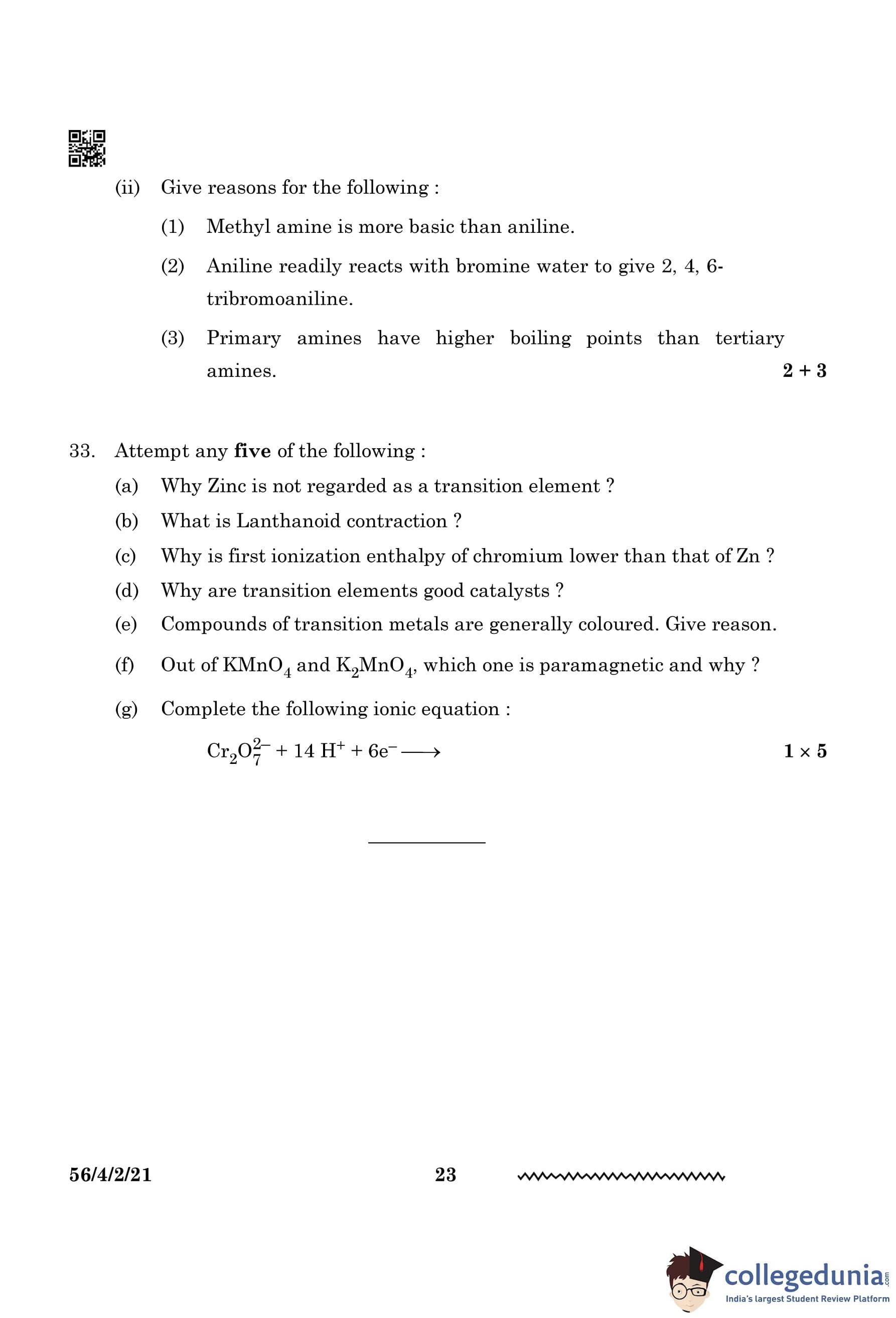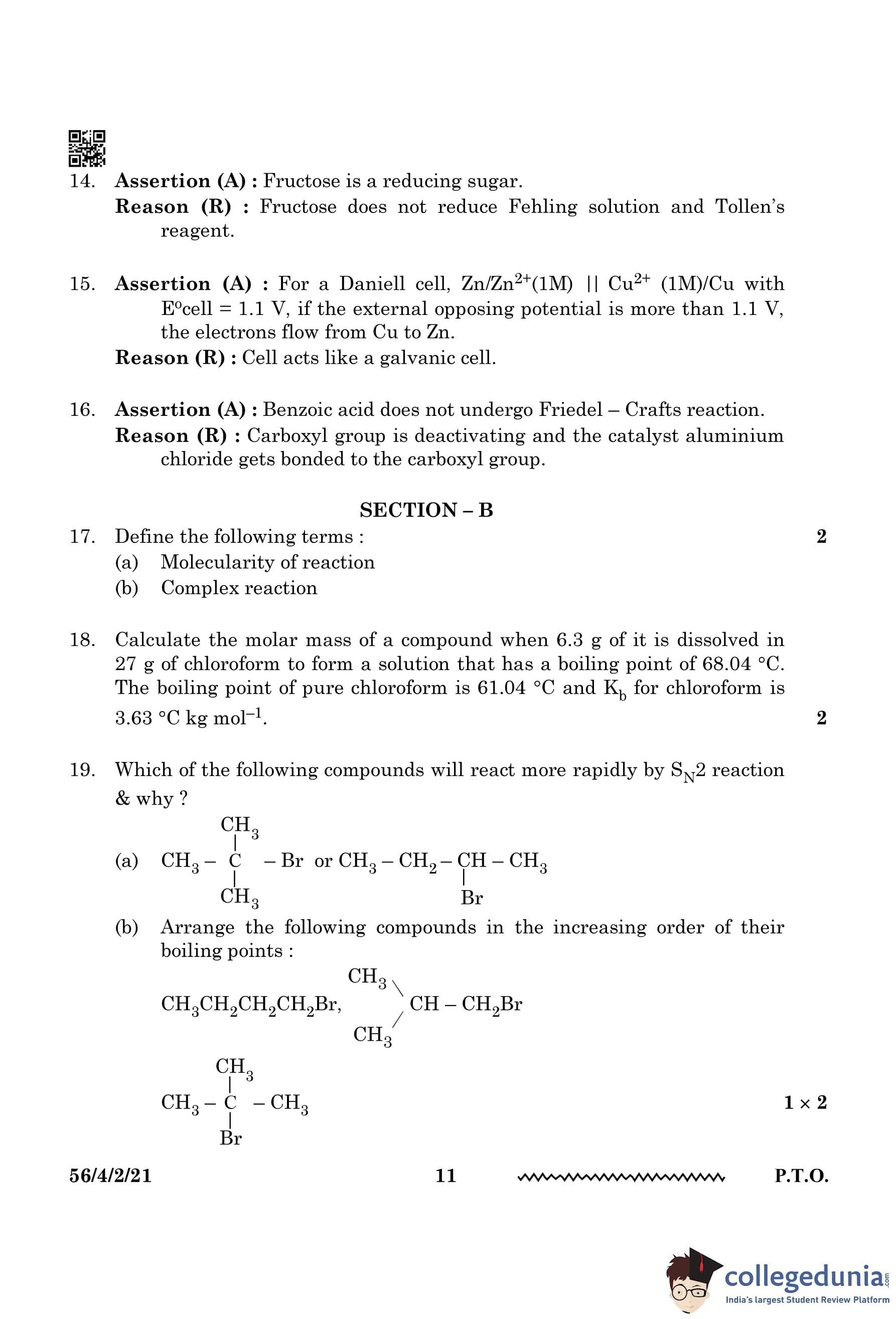 CBSE Class 12 Chemistry Question Paper 2024 PDF (Set 2 - 56/4/2) is available for download here. CBSE conducted the Chemistry exam on February 27, 2024, from 10:30 AM to 1:30 PM. The total marks for the theory paper are 70. The question paper contains 20% MCQ-based questions, 40% competency-based questions, and 40% short and long answer type questions.