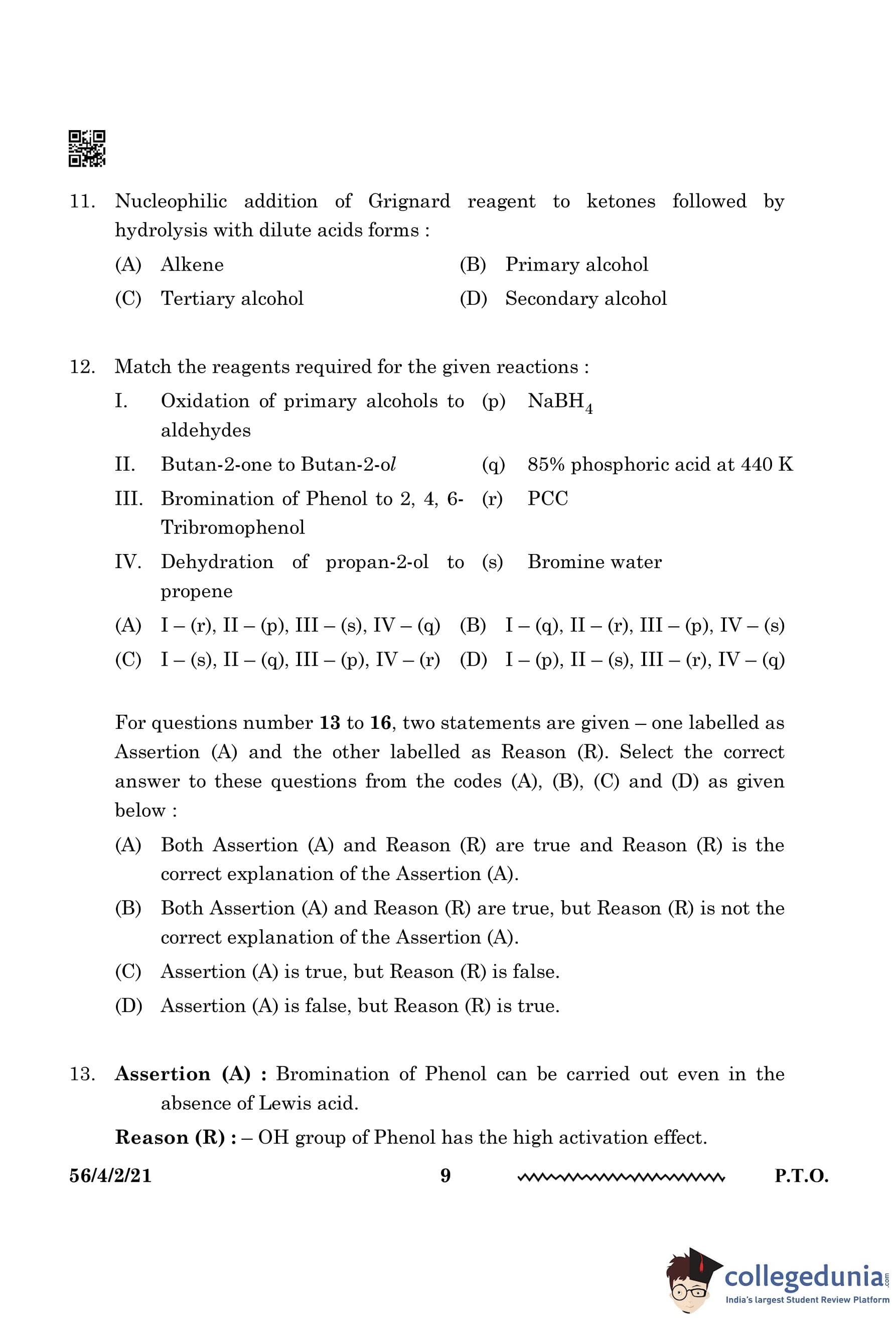 - Dehydration of propan-2-ol leads to propene when treated with 85% phosphoric acid at 440 K Quick Tip: For oxidation reactions, NaBH\(_4\) is commonly used, and for reduction reactions, phosphoric acid is often the reagent.